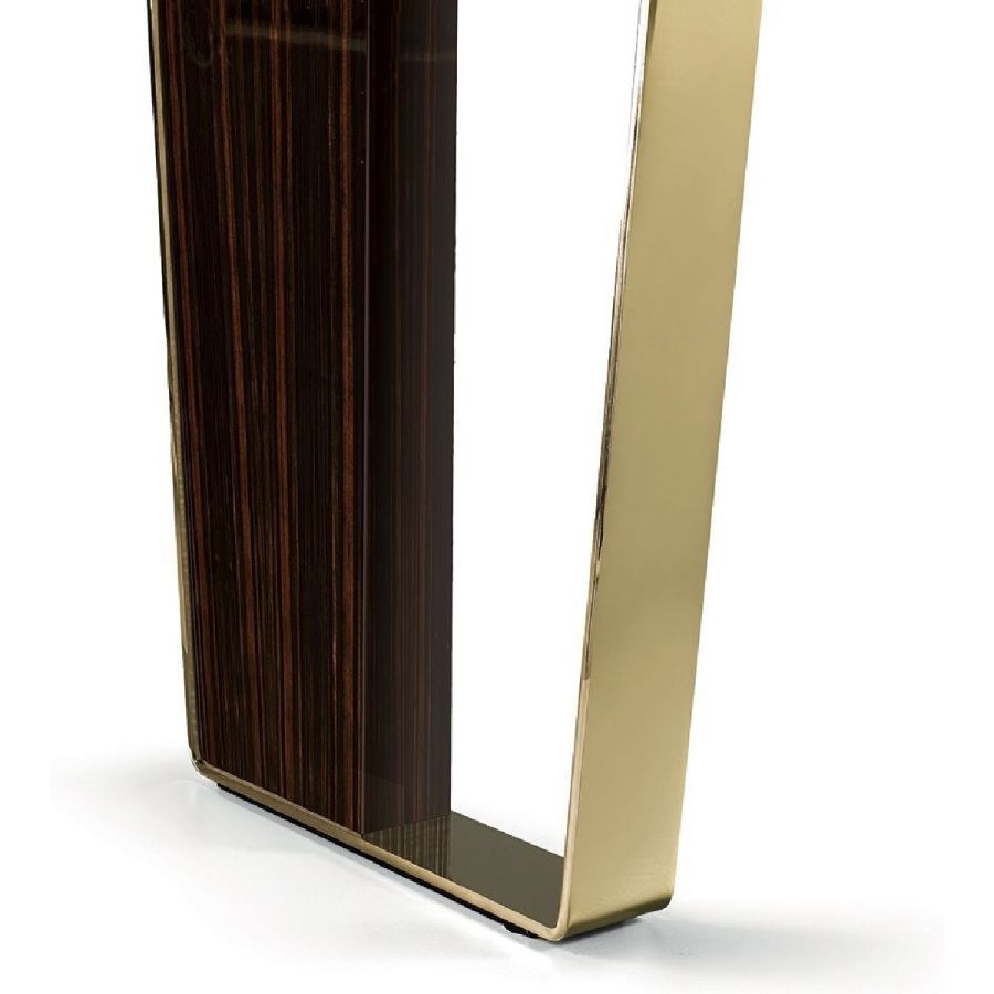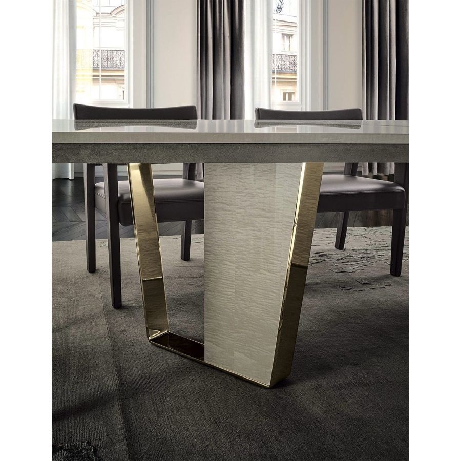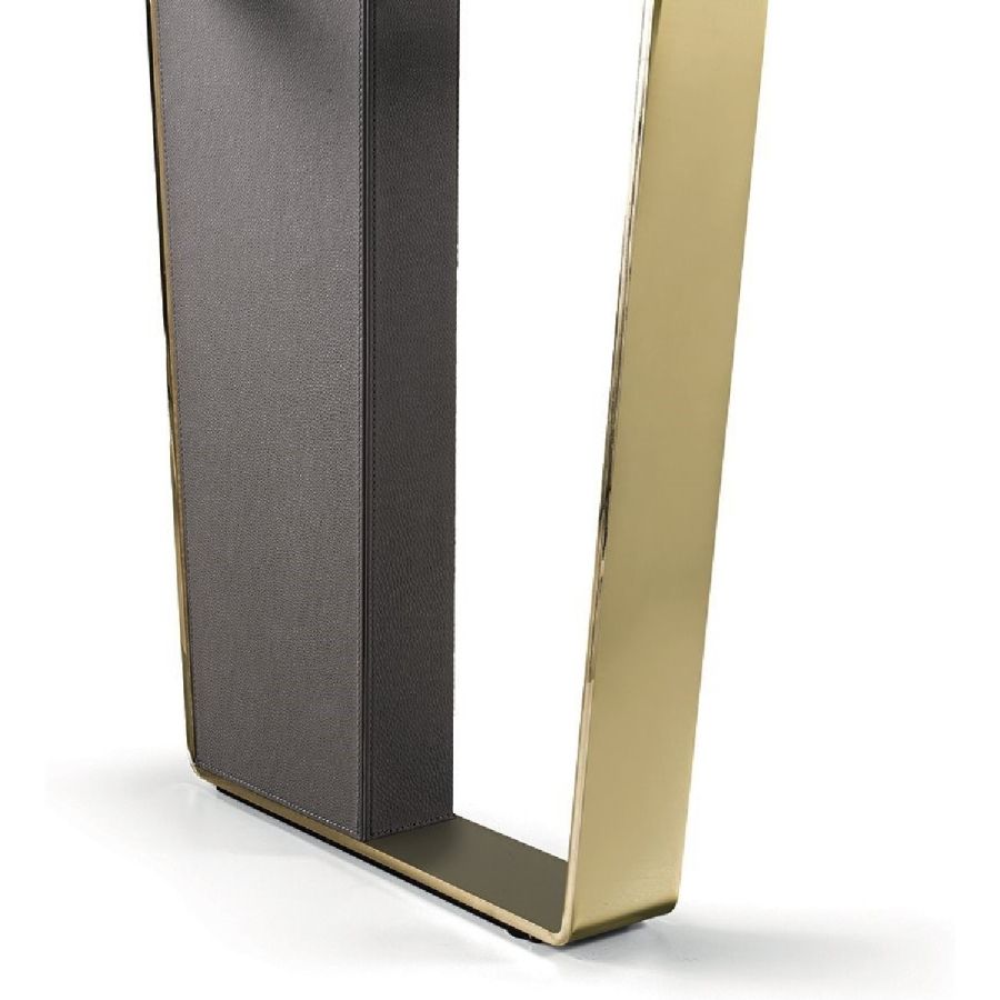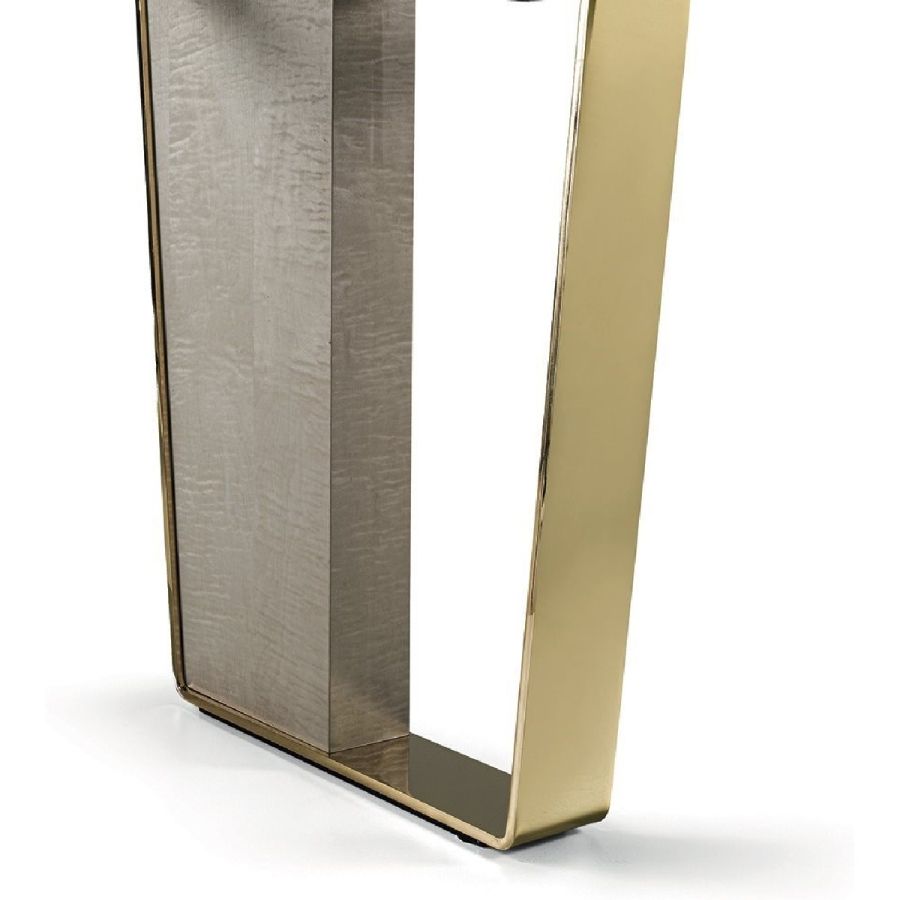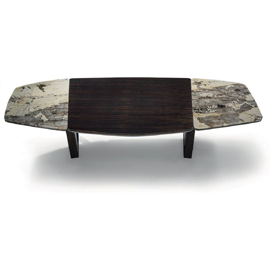 Keope is a table characterised by a contoured and sectioned top made of multiple materials and by 2 trapezoidal legs with a leather or wooden insert. Majestic and spectacular, it is available with the top divided into 2 or 3 parts. The Keope collection - table, console, and cabinet - conveys a timeless elegance, inspired by an authentic modern-chic dynamism in which sophisticated materials, quality marbles, and simple shapes evoke sensations that perfectly embody the brand’s design philosophy.