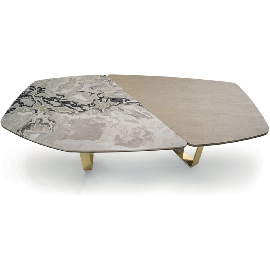 Table consisting of 2 trapezoidal legs and a shaped and sectioned top made of different materials. Machined and laser cut ground metal base in the finishes: Satin nickel, Bright shaded brown, Black Rose gold, bright light gold, matt Champagne gold, bright chrome, bright black chrome, matt satin bronze, bright pink gold, matt pink gold. The leg insert is covered in leather from the catalogue or in wood: glossy/matt Maple, glossy/matt heat-treated Eucalyptus, glossy/matt ebony, Canaletto walnut stained gloss/matt Macadamia, glossy/matt Sycamore frisè. Under-top covered in leather from the catalogue, if desired, matching the leginsert. The top, divided into 2 or 3 parts, is in the finishes: White Carrara marble, Imperial Brown marble,Sahara Noir marble (glossy and matt polyester finish), Dover White marble, Panda White marble, GuatemalaGreen marble, Corteccia marble, Port Saint Laurent marble, Red Levanto marble, Bardiglio Nuvolato marble,Elegant Brown marble, Shale Rosewood marble, Emperador Dark marble, Silver Wave marble, AgathaBlack marble, Frappuccino marble, Calacatta marble, Fusion Light marble, Patagonia marble, ExplosionBlue marble, Fusion Multicolor marble, Juliet Quartz marbl, .or in wood: glossy/matt Maple, glossy/mattheat-treated Eucalyptus, glossy/matt Sycamore frisè, glossy/matt ebony, Canaletto walnut stained gloss/matt Macadamia.