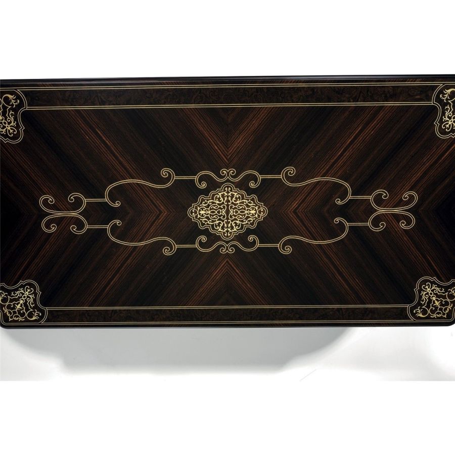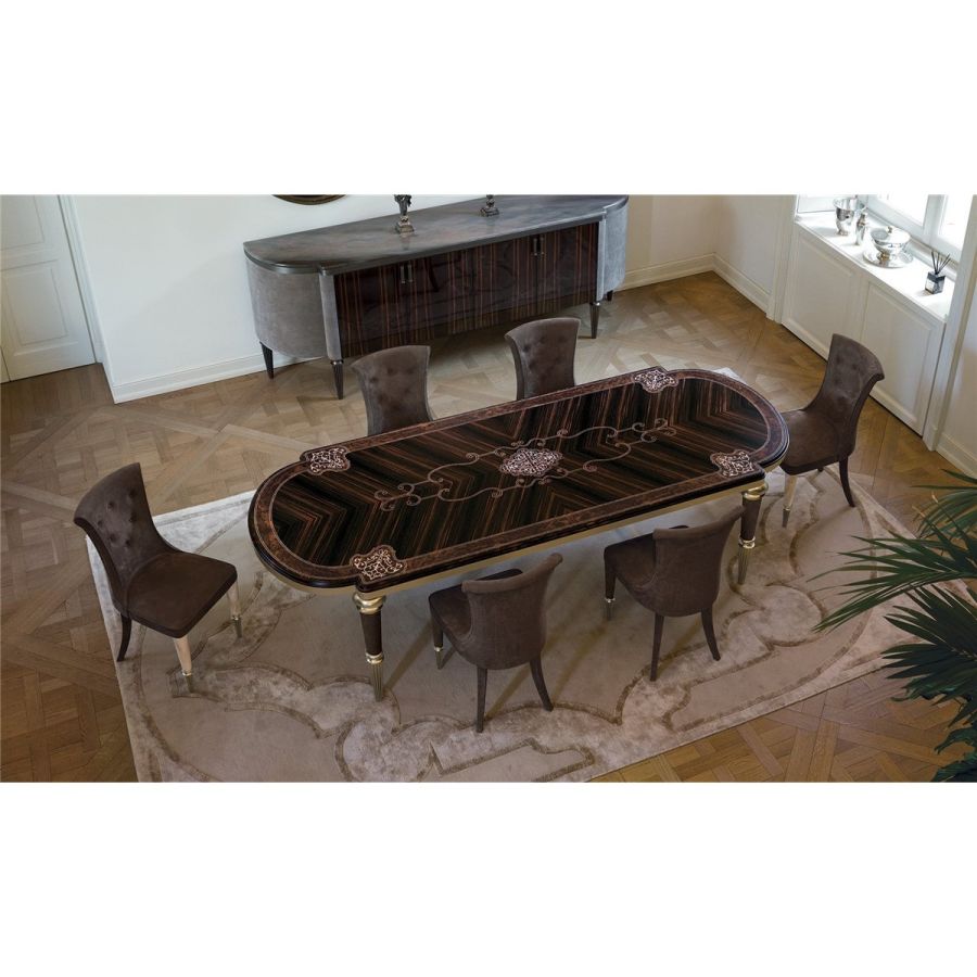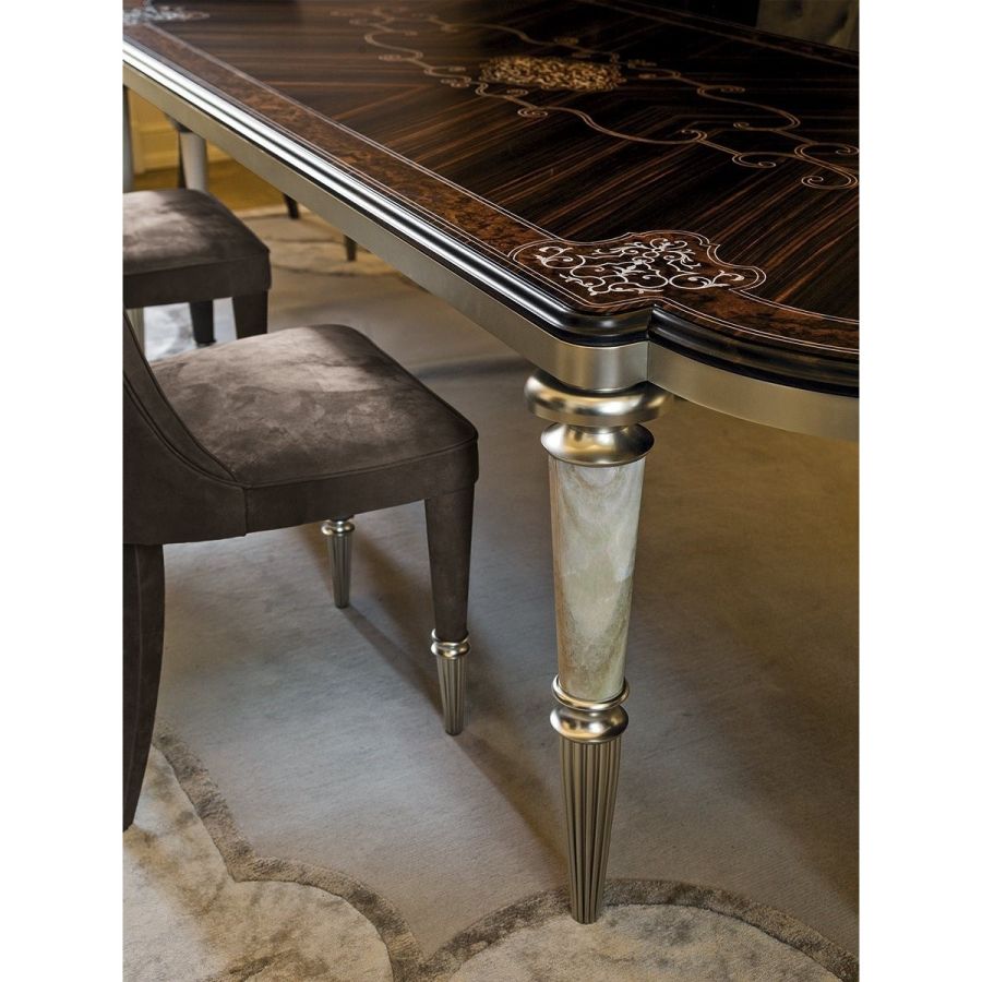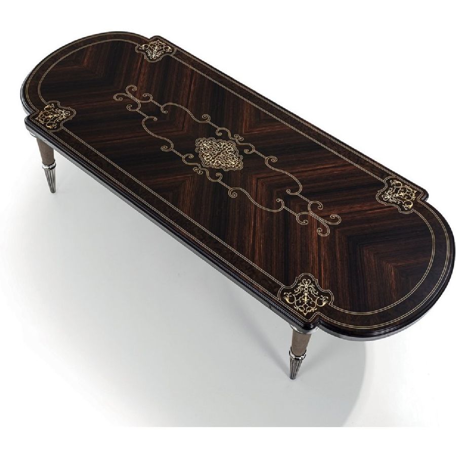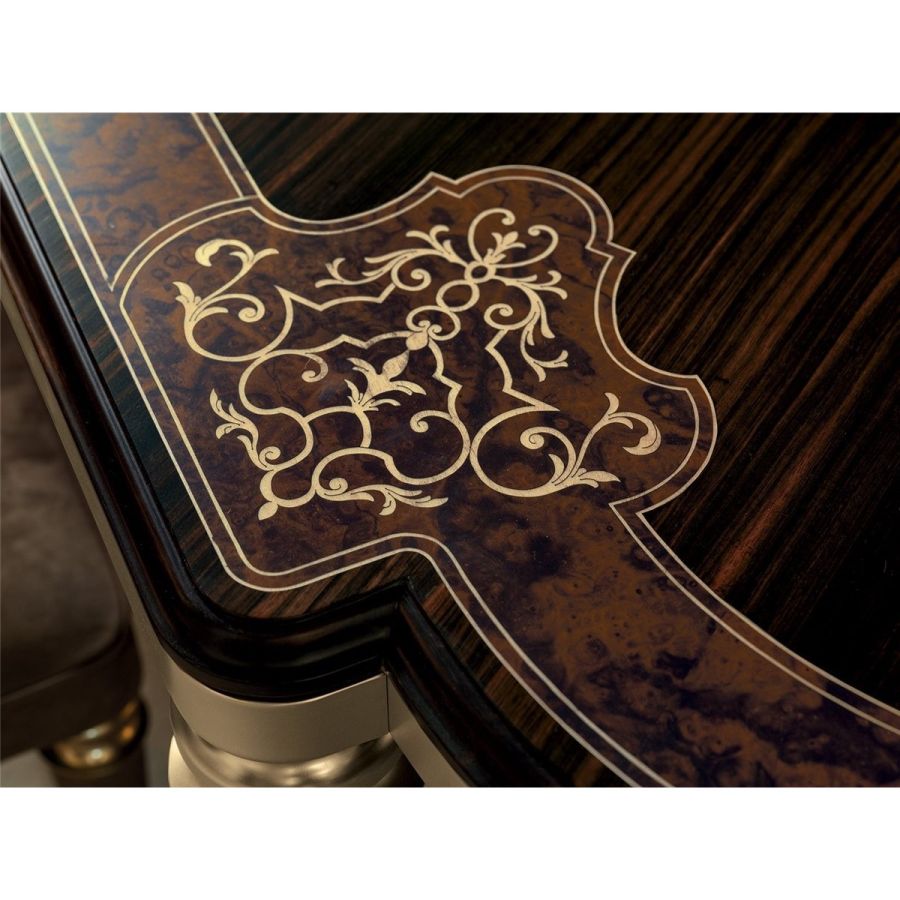 This table with soft lines belongs to the collection of accessories in clear neoclassical style, which presents a wide range of fine materials: ebony wood, expertly crafted and inlaid by hand to decorate the surfaces; ivory onyx and fine marbles used as precious inserts; metals such as brass decorated in lost wax casting and selected leathers.
