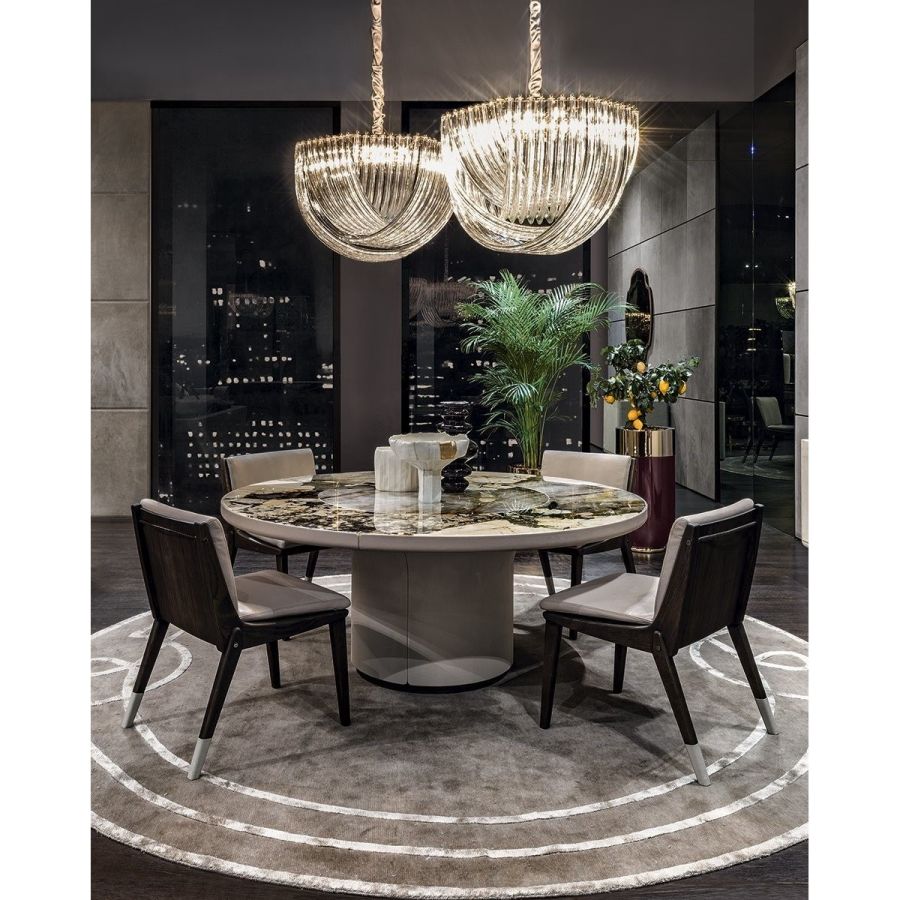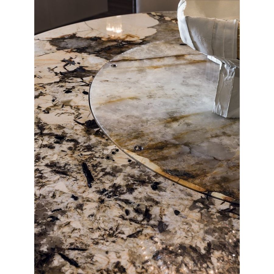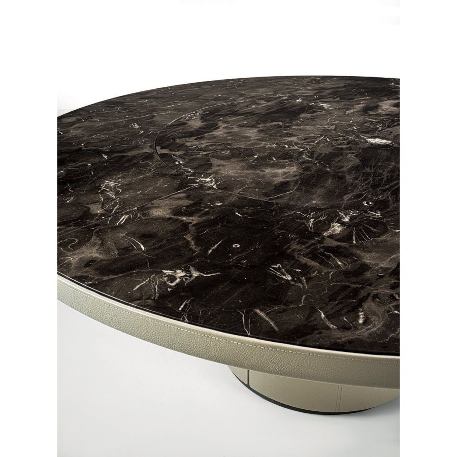 Round table with internal structure in painted metal and shell in manually moulded glass fibre coveredin leather from the range. Ground metal baseboard and edges in the following finishes: Satin nickel,Bright shaded brown, Black Rose gold, bright light gold, matt Champagne gold, bright chrome, bright black chrome, matt satin bronze, bright pink gold, matt pink gold. Top surface finish: White Carrara marble, Imperial Brown marble, Sahara Noir marble (glossy and matt polyester finish), Dover White marble, Panda White marble, Guatemala Green marble, Corteccia marble, Port Saint Laurent marble, Red Levanto marble, Bardiglio Nuvolato marble, Elegant Brown marble, Shale Rosewood marble, Emperador Dark marble, Silver Wave marble, Agatha Black marble, Frappuccino marble, Calacatta marble, Fusion Light marble, Patagonia marble, Explosion Blue marble, Fusion Multicolor marble, Juliet Quartz marble, bronze or smoky mirror, glossy or matt wood. Without a built-in revolving section, the marble top is whole; with a built-in revolving section, the marble top is divided into two parts.