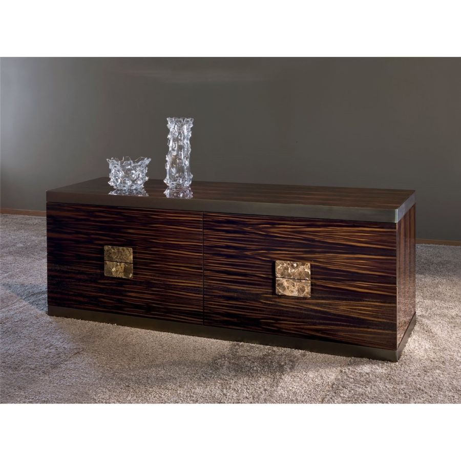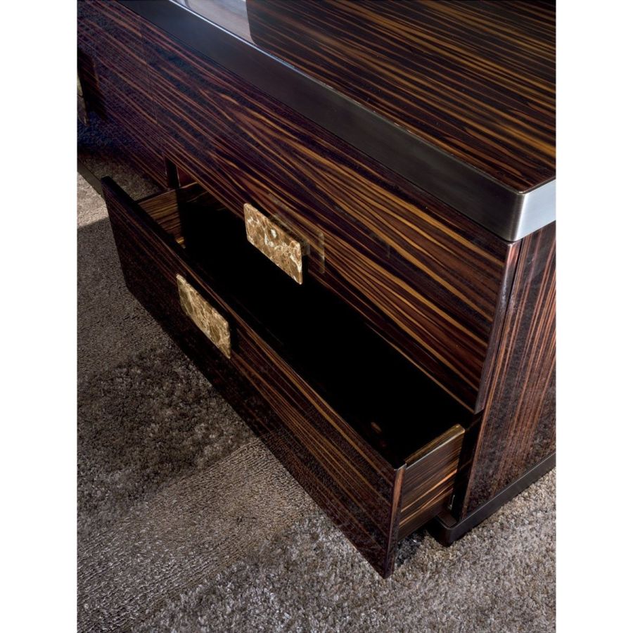 Chest of drawers in wood with 4 drawers in finishes of: glossy lacquered wood in range colours, glossy/matt ebony, glossy/matt Canaletto walnut, glossy/matt Sycamore frisè. Front of drawers covered in leather. Iron frame on the base and the top is ground metal, in finishes: Black Rose gold, bright shaded brown, bright light gold, matt Champagne gold, bright chrome, bright black chrome, matt satin bronze, bright pink gold, matt pink gold. Handle in marble from the range. Version completely covered in leather (including side panels) with marble top: Sahara Noir marble (polyester finish), Dover White marble, Panda White marble, Guatemala Green marble, Corteccia marble, Port Saint Laurent marble, Red Levanto marble, Bardiglio Nuvolato marble, Elegant Brown marble, Shale Rosewood marble, Emperador Dark marble, Silver Wave marble, Agatha Black marble, Frappuccino marble, Calacatta marble, Fusion Light marble, Patagonia marble, Explosion Blu marble, Fusion Multicolor marble, Juliet quartz marble, Calcite Azul marble.