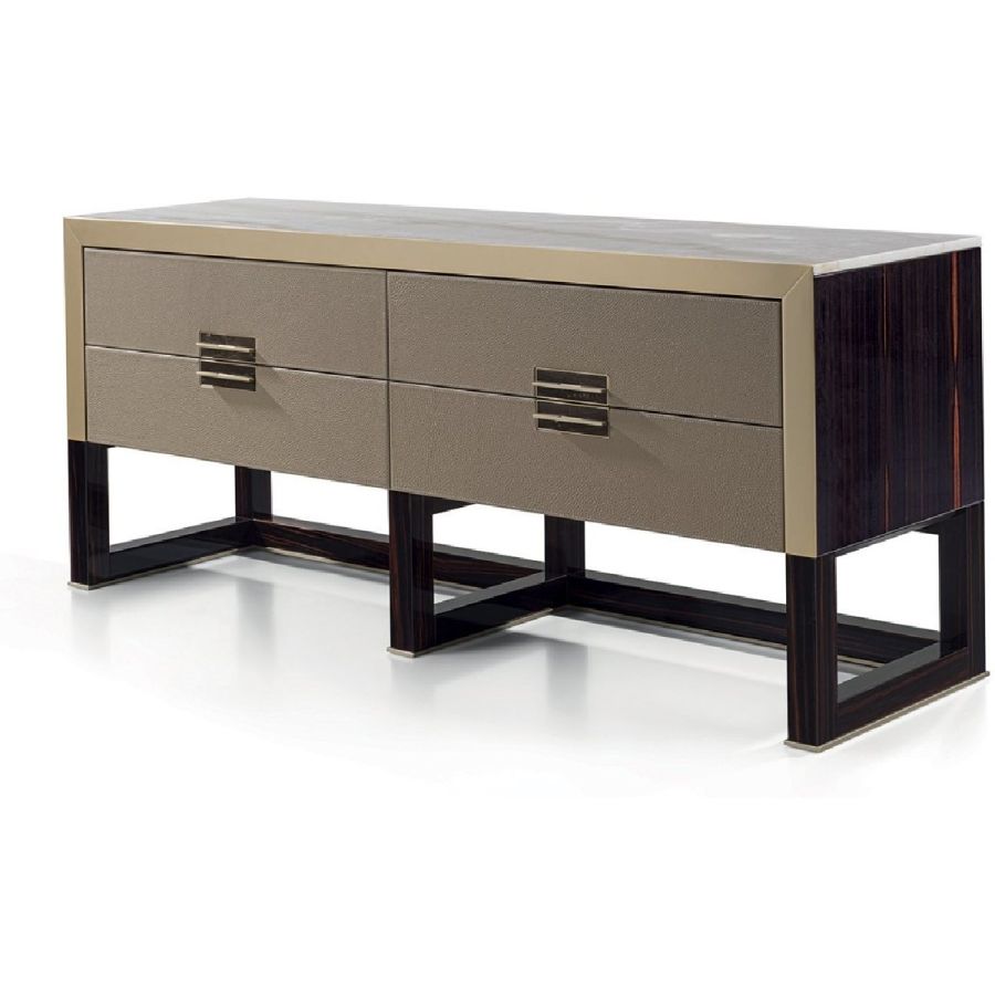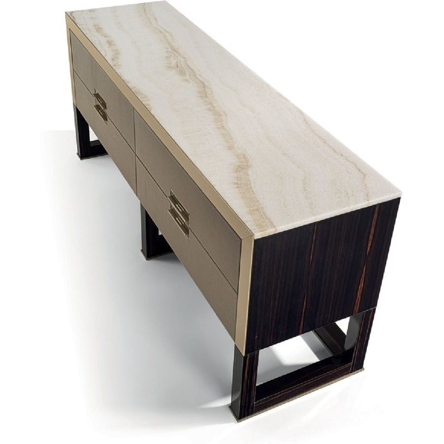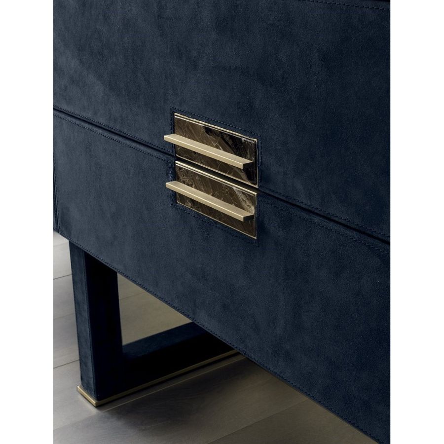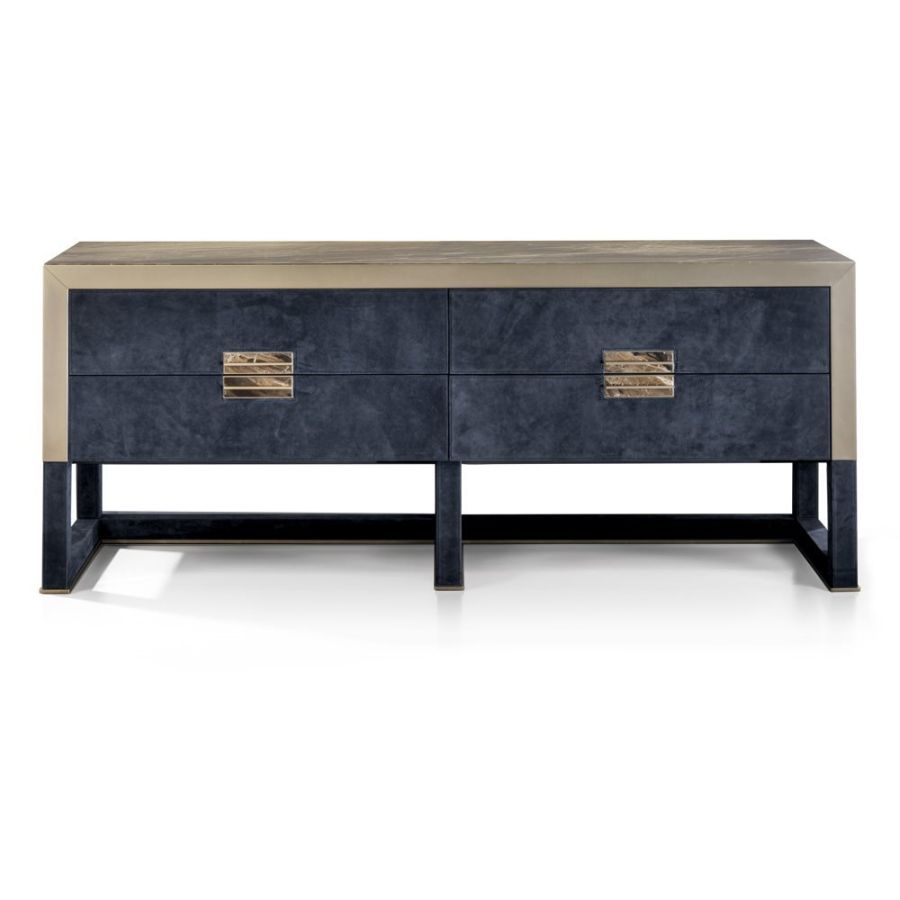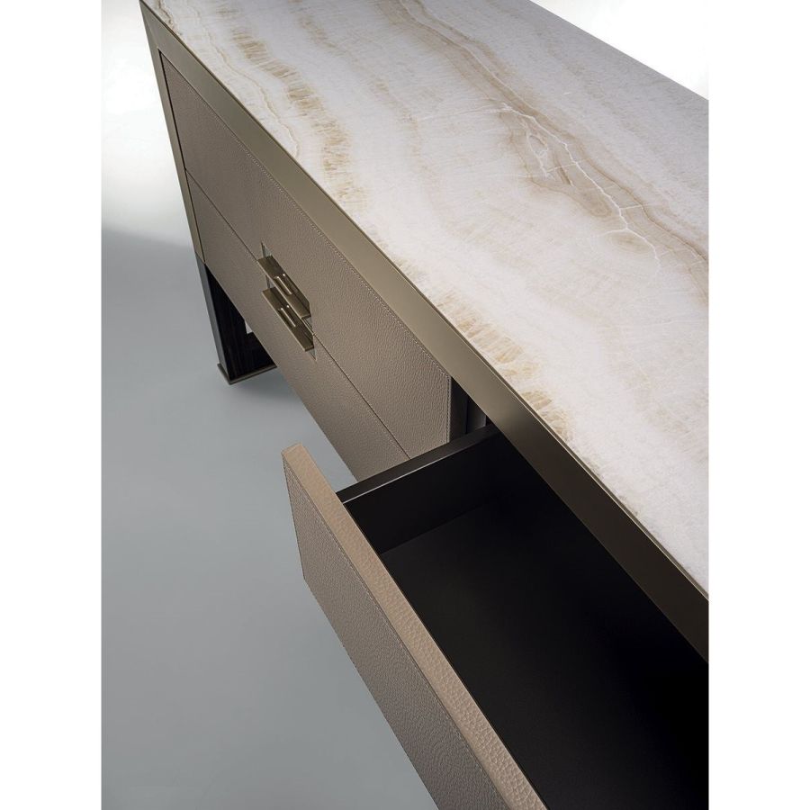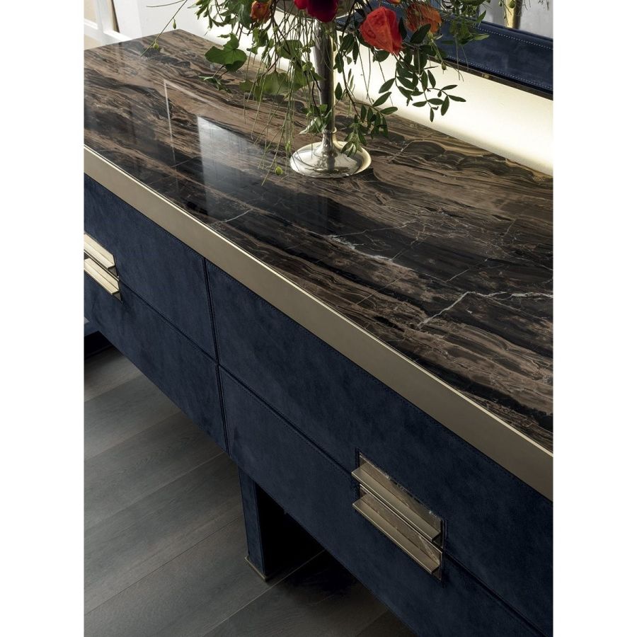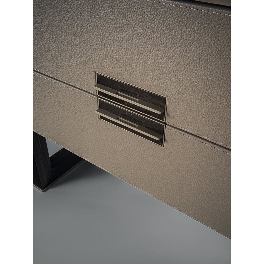 Chest of 4 drawers. Legs and frame covered in leather or cashmere Loro Piana Interiors from the range or wood: glossy lacquered wood in range colours, glossy/matt ebony, glossy/matt Canaletto walnut, glossy/matt Sycamore frisè. Profile of base and cornice in ground metal in the finishes: bright shaded brown, bright light gold, matt Champagne gold, bright chrome, bright black chrome, matt satin bronze, bright pink gold, matt pink gold, Black Rose gold. Top finish: bronze or smoky mirror with 20 mm bevel, black painted glass with 20 mm bevel, glossy lacquered wood in range colours, glossy/matt ebony, glossy/matt Canaletto walnut, glossy/matt Sycamore frisè. Marble mm 20 thick: Portoro marble, Fusion Light marble, Patagonia marble, Explosion Blu marble, Fusion Multicolor marble, Juliet quartz marble, Calcite Azul marble, Sahara Noir marble (polyester finish), Dover White marble, Panda White marble, Guatemala Green marble, Corteccia marble, Port Saint Laurent marble, Red Levanto marble, Bardiglio Nuvolato marble, Elegant Brown marble, Shale Rosewood marble, Emperador Dark marble, Silver Wave marble, Agatha Black marble, Frappuccino marble, Calacatta marble. Handle in marble from the range or like the top. On the back, two dimmable LED strips light the lower and upper part of the chest. They are turned on with a touch-sensitive switch. The effect is a strip of light that illuminates the wall.