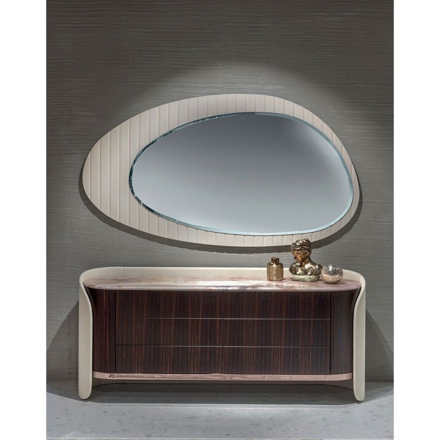 The curved structure of the Selena drawer unit is covered in leather. Within its structure, it holds an impressive chests of drawers made up of 6 large drawers with wood fronts. To complete the project, Giuseppe Iasparra created Arianna, a mirror with an irregular contemporary shape. Available in two sizes, this product has a base covered with a grooved pattern that frames a natural mirror that follows a particular silhouette.
