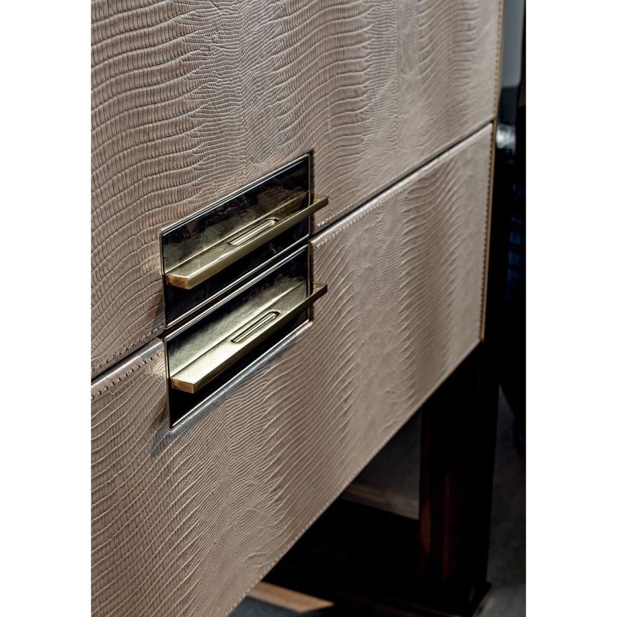 Make-up dresser with 2 drawers and functional storage area for cosmetics or jewellery. Base and top in wood finishes: glossy lacquered wood in range colours, glossy/matt ebony, glossy/matt Canaletto walnut, glossy/matt Sycamore frisè. Sides and drawer fronts upholstered in leathers from the catalogue. The interior of the cosmetic container is covered in P.3 Cat. Suede leather and the flap door closure is equipped with a mirror with metal edges.Ground metal base profile and frame in the following finishes: bright shaded brown, bright light gold, matt Champagne gold, bright chrome, bright black chrome, matt satin bronze, bright pink gold, matt pink gold, Black Rose gold. Handle with marble insert (marble from the range).