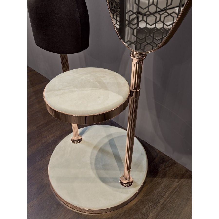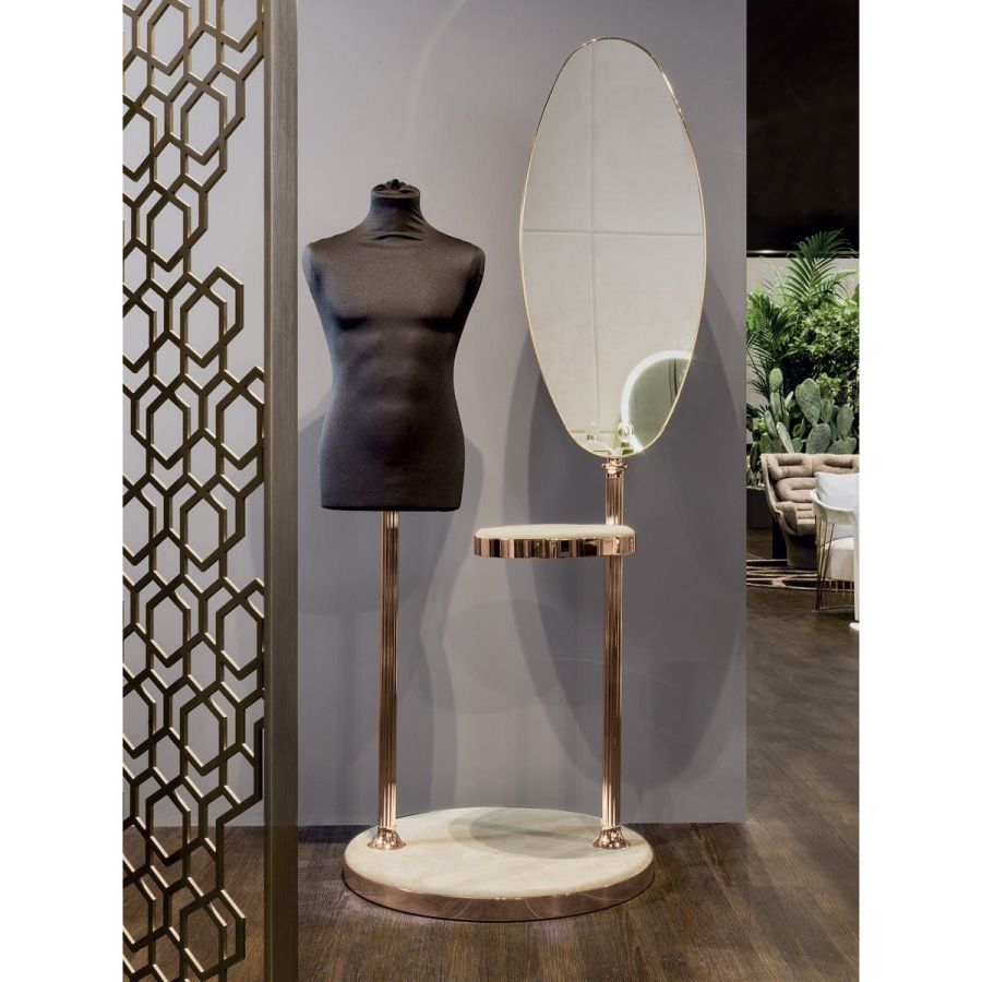 Mirror with male or female manikin. Wood base covered in leather P.3 Suede or velvet from the range, edges and structural columns in grooved metal in the finishes: Black Rose gold, bright shaded brown, bright light gold, matt Champagne gold, bright chrome, bright black chrome, matt satin bronze, bright pink gold, matt pink gold. Back of mirror and small valet shelf covered in leather or velvet.