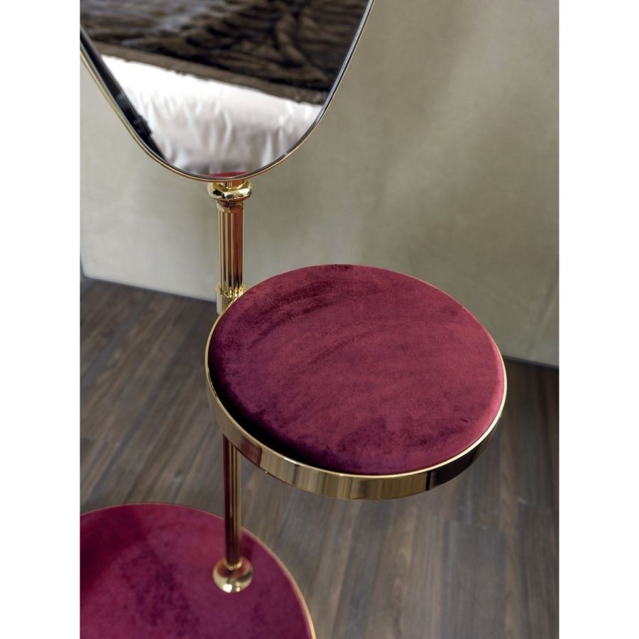 Original oval mirror with manikin (male or female version) with shelf and base covered in velvet or suede. The structural col- umn is in grooved metal. This versatile piece of furniture is both beautiful and useful: it can be important in a bedroom, bath or entryway.