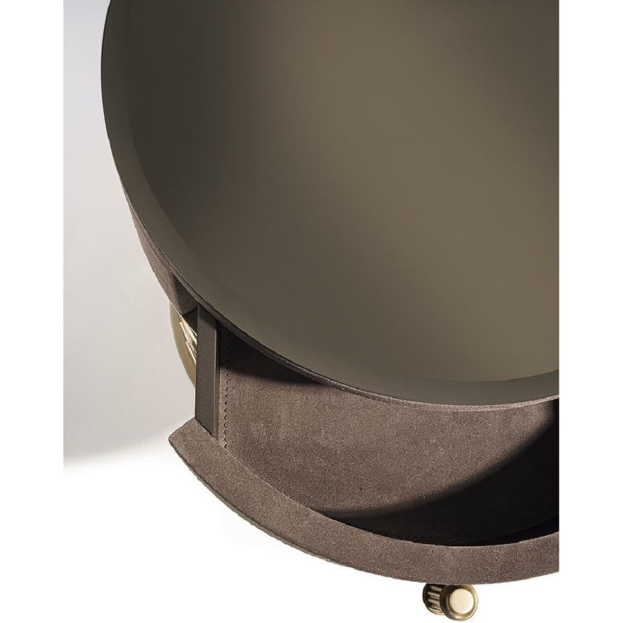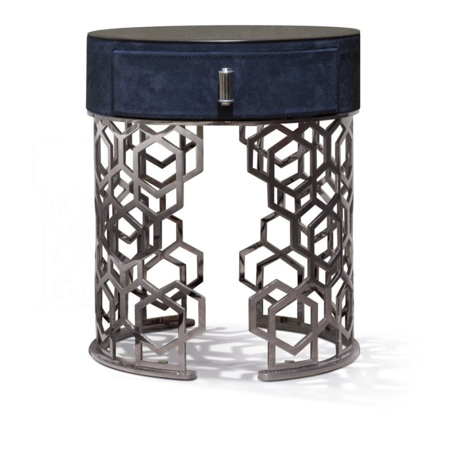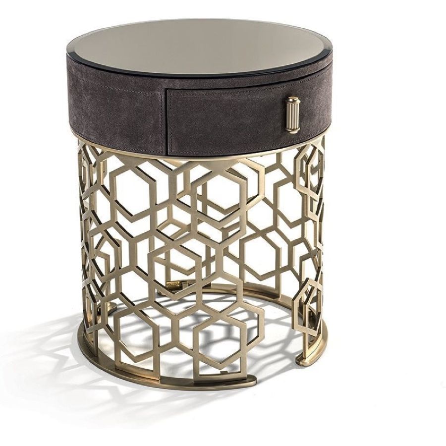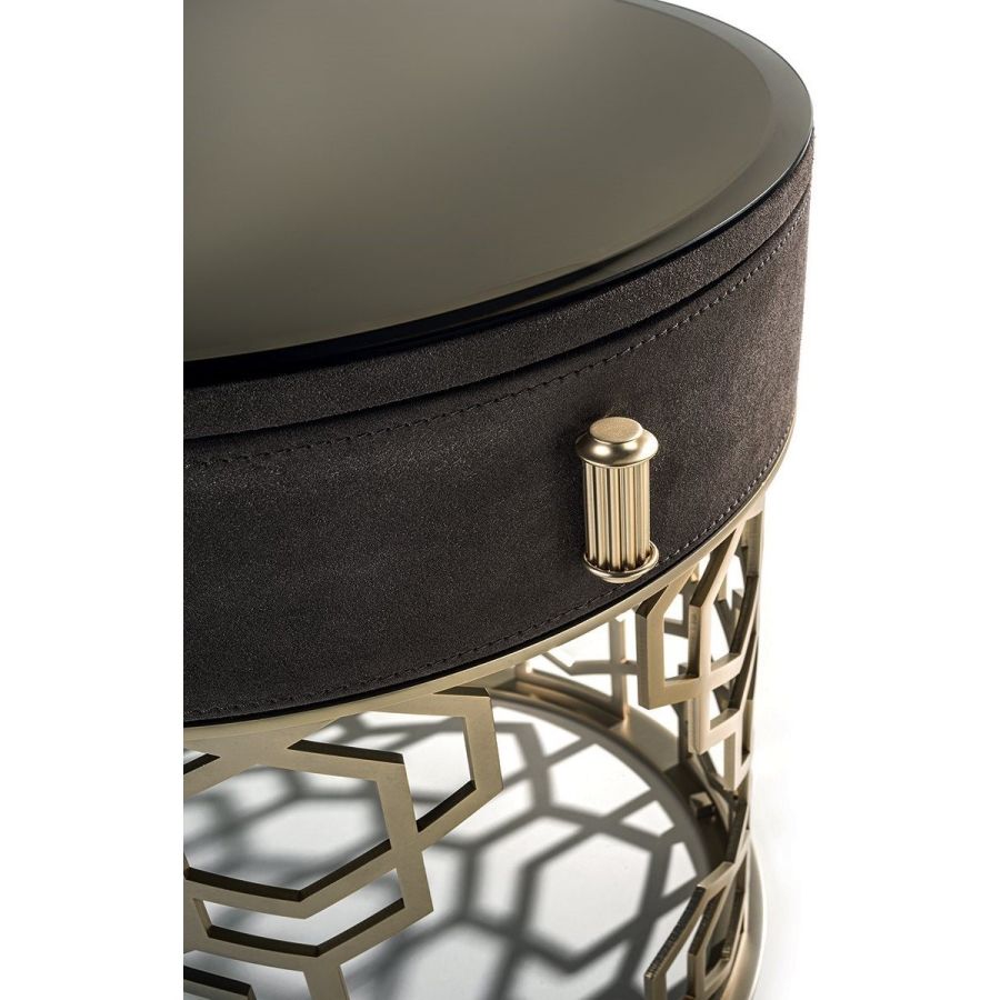 Night stand with small drawer covered in leather from the range and base in calendared laser cut ground metal with “Sequence” decoration. Base finish: Satin nickel, bright shaded brown, Black Rose gold, bright light gold, matt Champagne gold, bright chrome, bright black chrome, matt satin bronze, bright pink gold,matt pink gold. Top finish: bronze or smoky mirror 5 mm with bevelled edge, glass painted black mm 8 with bevelled edge. Marble mm 20 thick with bevel mm 20: White Carrara marble, Imperial Brown marble,Sahara Noir marble (glossy and matt polyester finish), Dover White marble, Panda White marble, GuatemalaGreen marble, Corteccia marble, Port Saint Laurent marble, Red Levanto marble, Bardiglio Nuvolato marble,Elegant Brown marble, Shale Rosewood marble, Emperador Dark marble, Silver Wave marble, Agatha Black marble, Frappuccino marble, Calacatta marble, Fusion Light marble, Patagonia marble, ExplosionBlue marble, Fusion Multicolor marble, Juliet Quartz marble, Calcite Azul marble.
