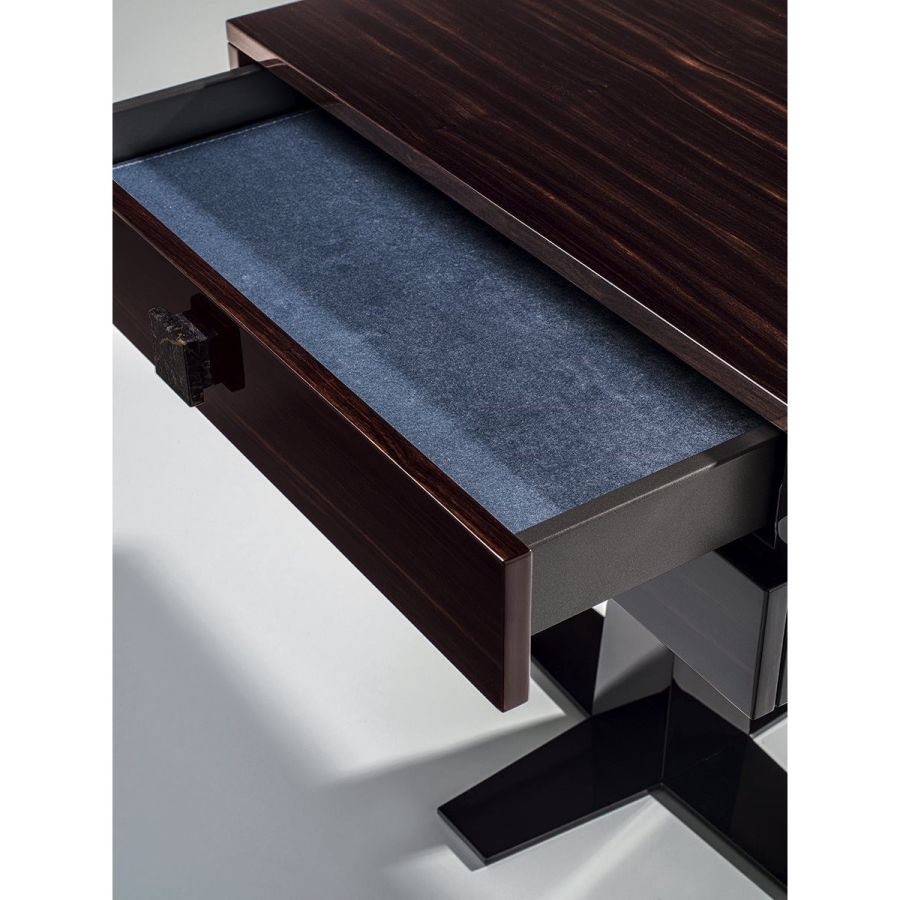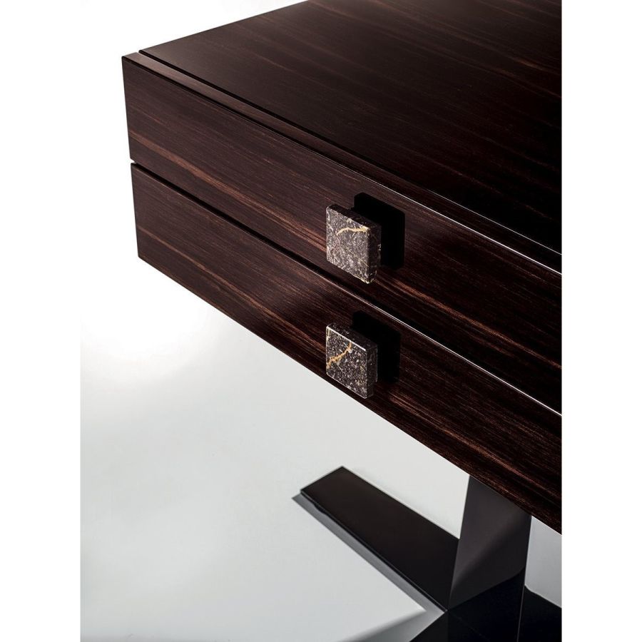 Night stand made of wood and in finishes of: glossy lacquered wood in range colours, glossy/matt Maple,glossy/matt heat-treated Eucalyptus, glossy/matt Sycamore frisè, glossy/matt Ebony, glossy/matt Canaletto walnut. Covered in leather from the catalogue. Laser-cut ground metal base in the finishes: Satin nickel, bright shaded brown, Black Rose gold, bright light gold, matt Champagne gold, bright chrome, bright black chrome, matt satin bronze, bright pink gold, matt pink gold. Handle in marble from the range.