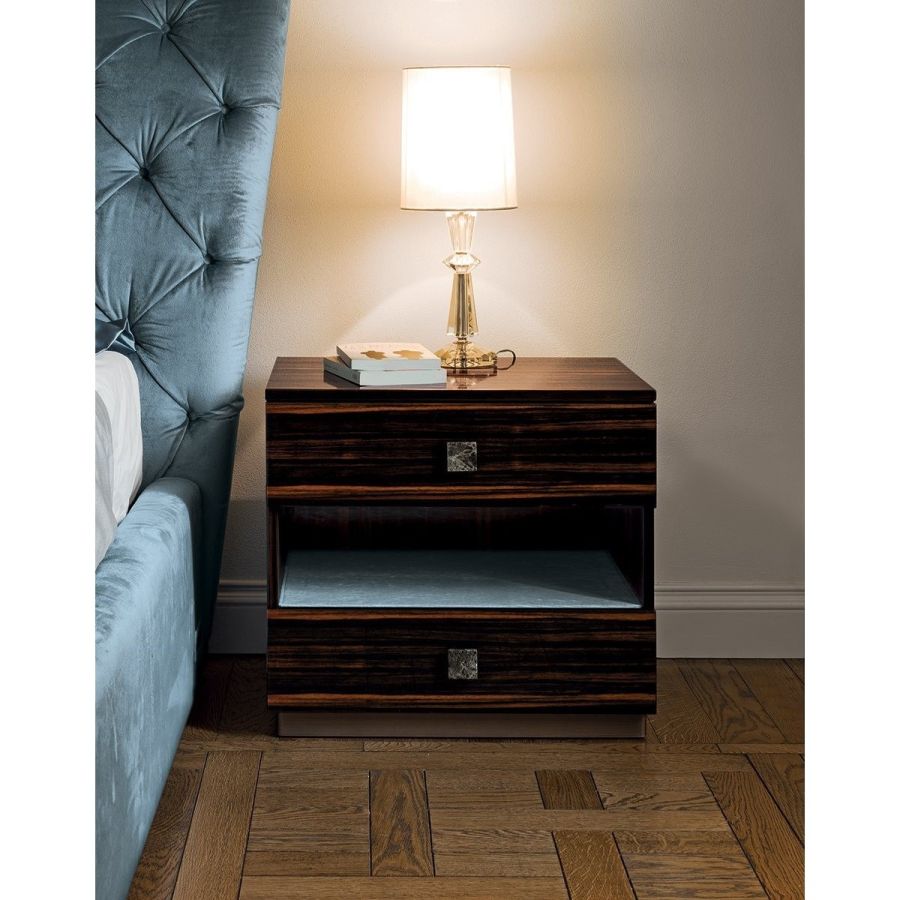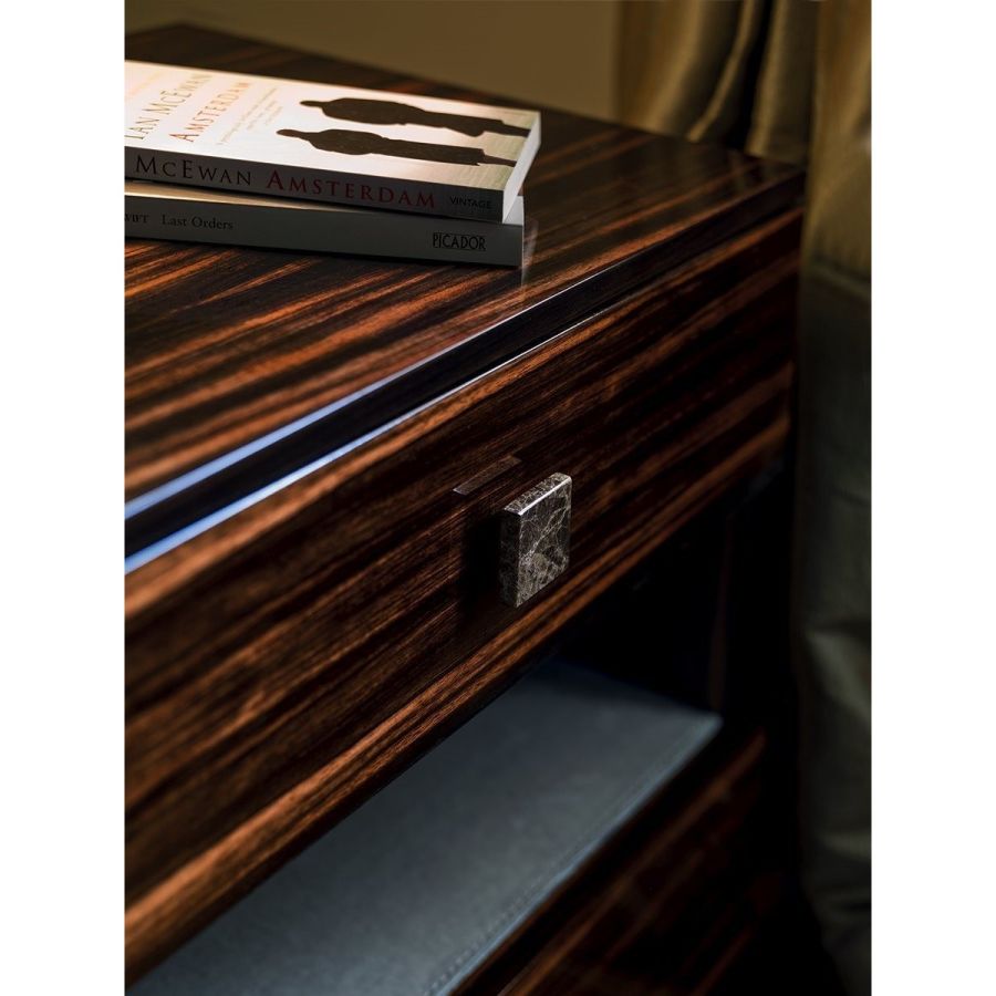 Bedside table with 2 drawers in wood in the finishes: glossy lacquered wood in range colours, glossy/matt Maple, glossy/matt heat-treated Eucalyptus, glossy/matt Sycamore frisè, glossy/matt Ebony, glossy/matt Canaletto walnut. Central compartment with top covered in leather or velvet from the catalogue. Handles in marble or hide, base painted bronze.