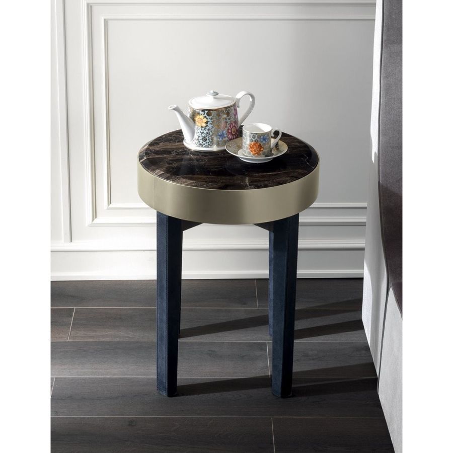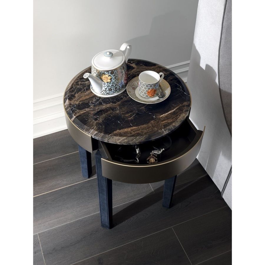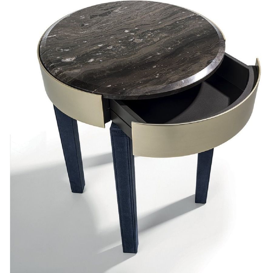 Night stand with small drawer, metal edge in the finishes: Satin nickel, Bright shaded brown, Black Rose gold, bright light gold, matt Champagne gold, bright chrome, bright black chrome, matt satin bronze,bright pink gold, matt pink gold. Legs covered in leather from the range or in wood: glossy lacquered wood in range colours, glossy/matt Maple, glossy/matt heat-treated Eucalyptus, glossy/matt Sycamore frisè, glossy/matt Ebony, glossy/matt Canaletto walnut. Top finish: bronze or smoky mirror glass painted black, legno a campionario, Marble mm 20 thick: White Carrara marble, Imperial Brown marble, Sahara Noir marble (glossy and matt polyester finish), Dover White marble, Panda White marble, Guatemala Green marble, Corteccia marble, Port Saint Laurent marble, Red Levanto marble, Bardiglio Nuvolato marble, ElegantBrown marble,- Shale Rosewood marble, Emperador Dark marble, Silver Wave marble, Agatha Black marble,Frappuccino marble, Calacatta marble, Fusion Light marble, Patagonia marble, Explosion Blue marble, Fusion Multicolor marble, Juliet Quartz marble, Calcite Azul marble.