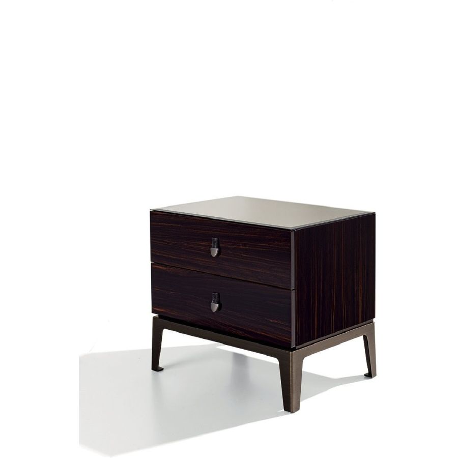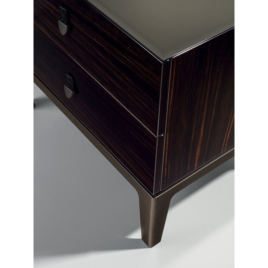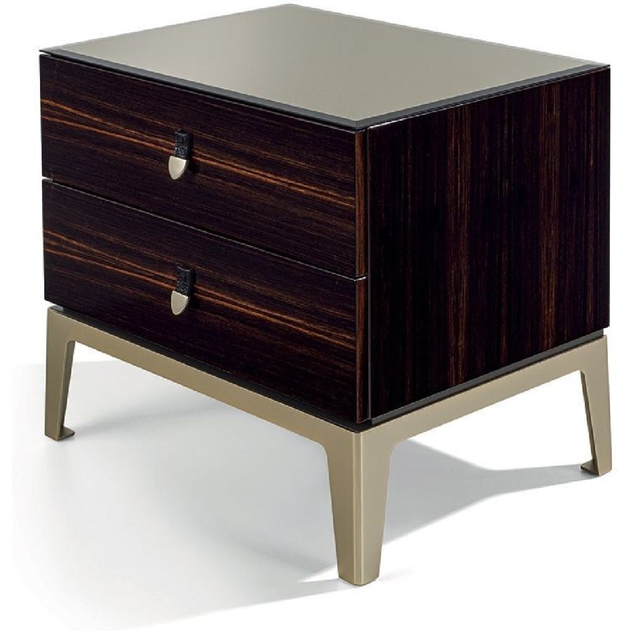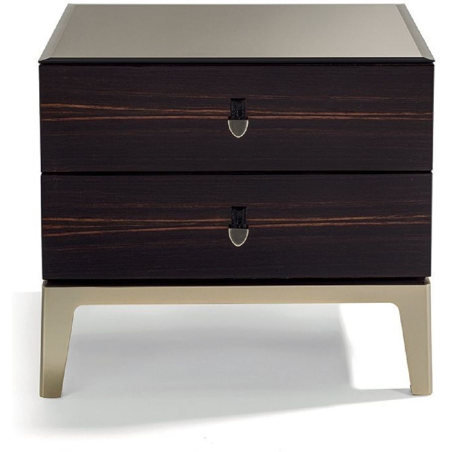 Bedside table with 2 drawers in wood in the finishes: glossy lacquered wood in range colours, glossy/matt Maple, glossy/matt heat-treated Eucalyptus, glossy/matt Sycamore frisè, glossy/matt Ebony, glossy/matt Canaletto walnut. Mirror finish top with bevelled edge in bronze or smoky. Laser cut ground metal bases inthe finishes: Satin nickel, Bright shaded brown, Black Rose gold, bright light gold, matt Champagne gold, bright chrome, bright black chrome, matt satin bronze, bright pink gold, matt pink gold. Handles in marble or hide.
