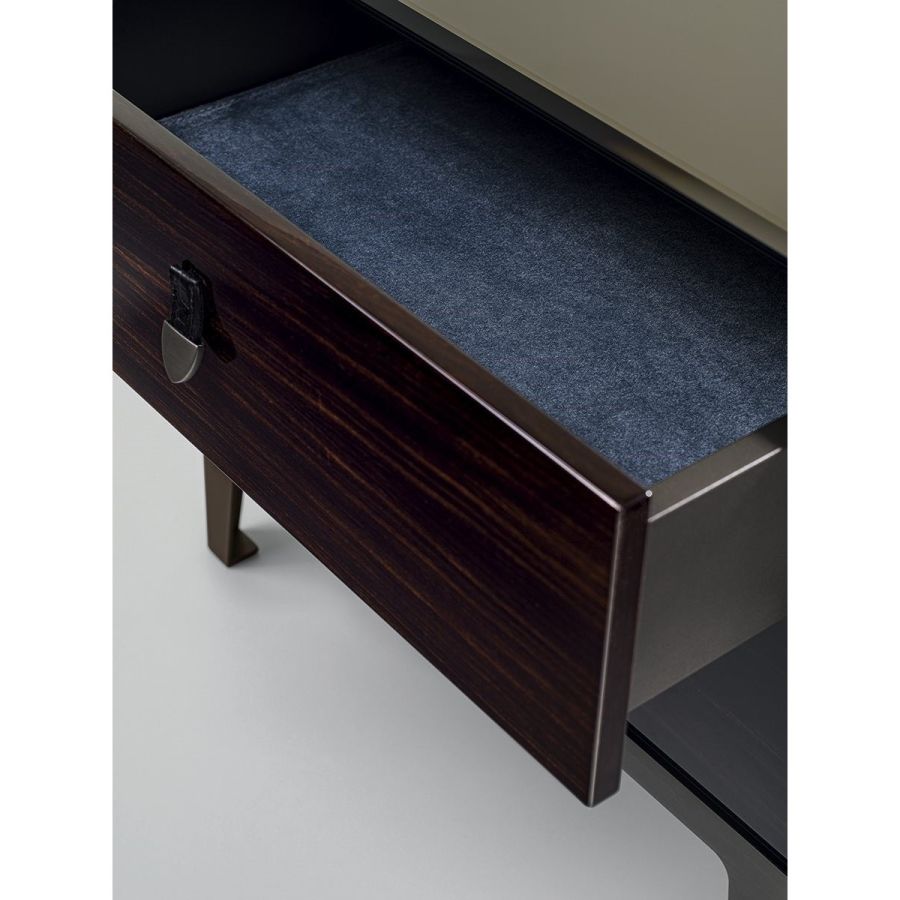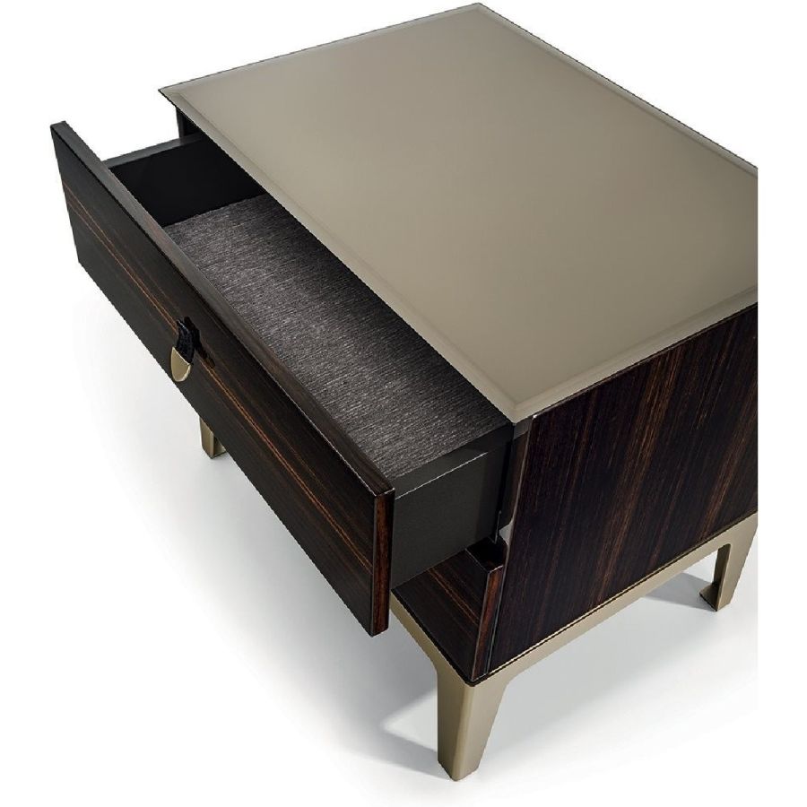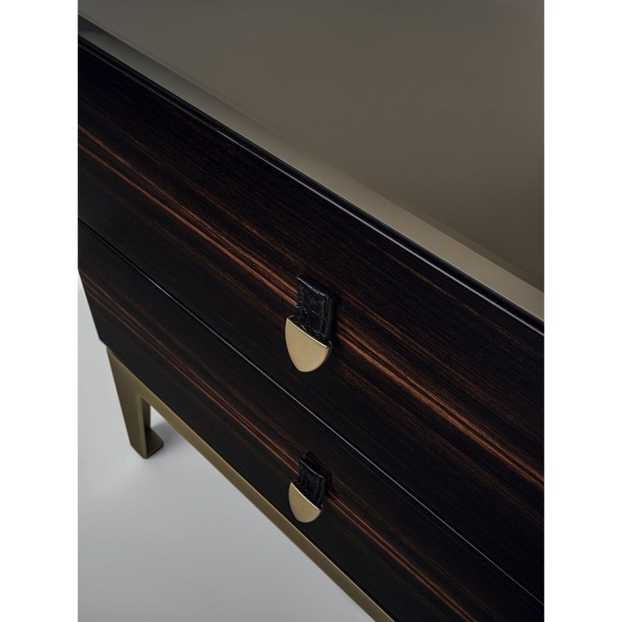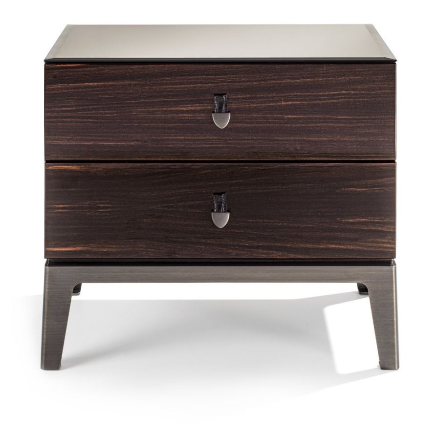 Bedside table with 2 drawers in wood in the finishes: glossy lacquered wood in range colours, glossy/matt Maple, glossy/matt heat-treated Eucalyptus, glossy/matt Sycamore frisè, glossy/matt Ebony, glossy/matt Canaletto walnut. Mirror finish top with bevelled edge in bronze or smoky. Laser cut ground metal bases inthe finishes: Satin nickel, Bright shaded brown, Black Rose gold, bright light gold, matt Champagne gold, bright chrome, bright black chrome, matt satin bronze, bright pink gold, matt pink gold. Handles in marble or hide.