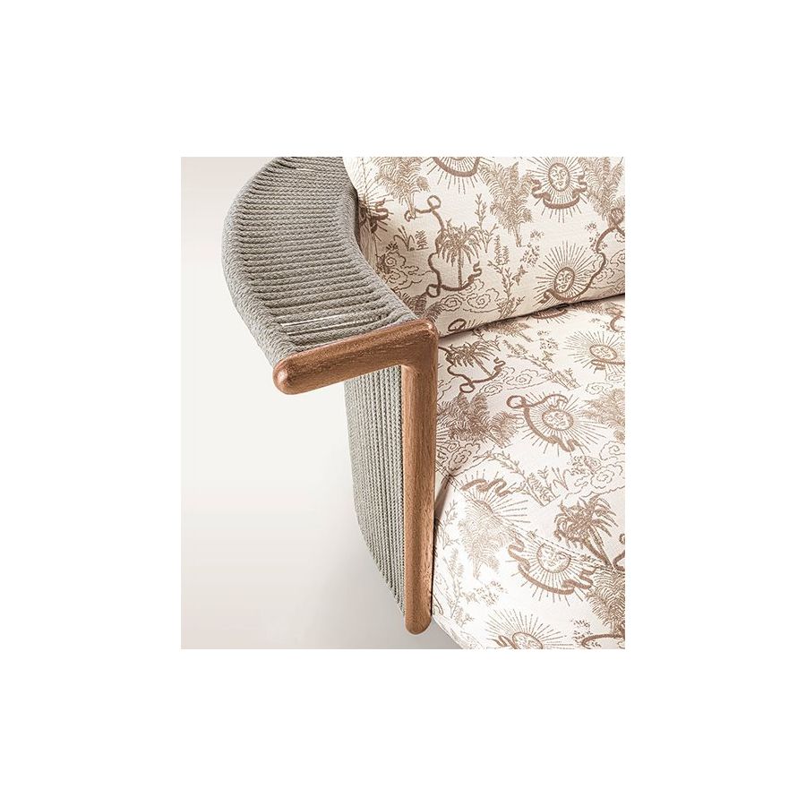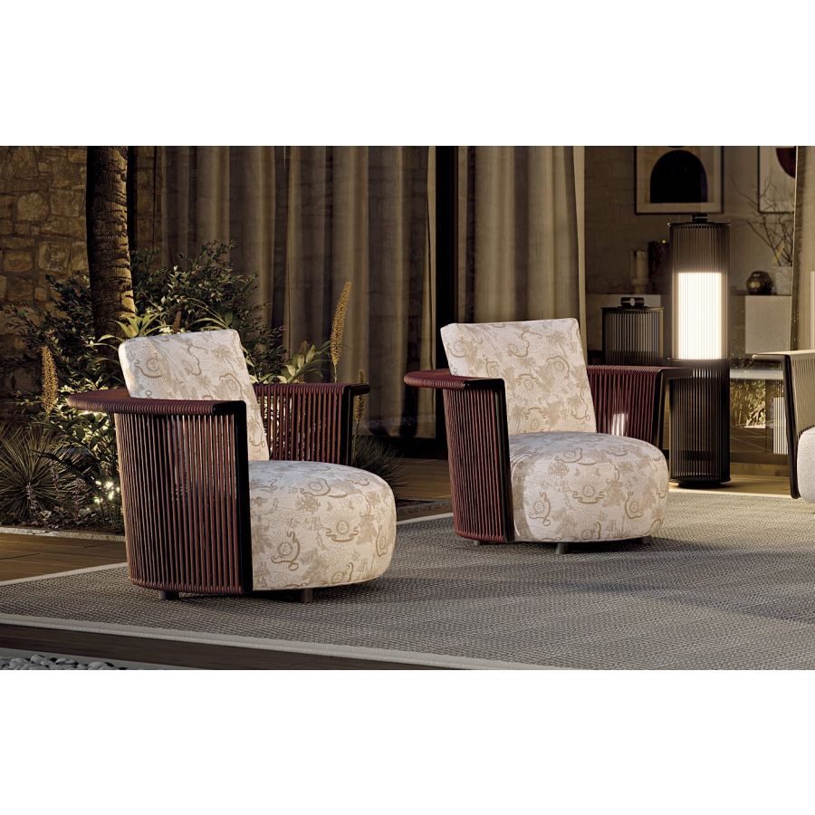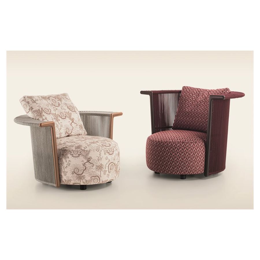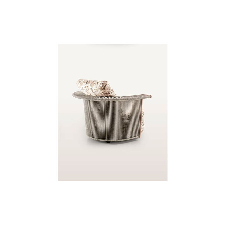 Armchair in a high and low version. The load-bearing structure is in epoxy-powder-coated304 stainless steel, finely and manually woven with a fabric rope in the same colour. The seat is in pinewood, with PVC slats covered in special triple-density “draining” polyurethane foams in breathable water-repellent white covers to eliminate any dampness. The back cushion is in Rollofill polyester, covered with a breathable water-repellent white lining. The arm rests are fitted with elegantly shaped ends in Iroko wood, coloured with special water based paints. All the fabric covers for both the seats and back cushions are removable.