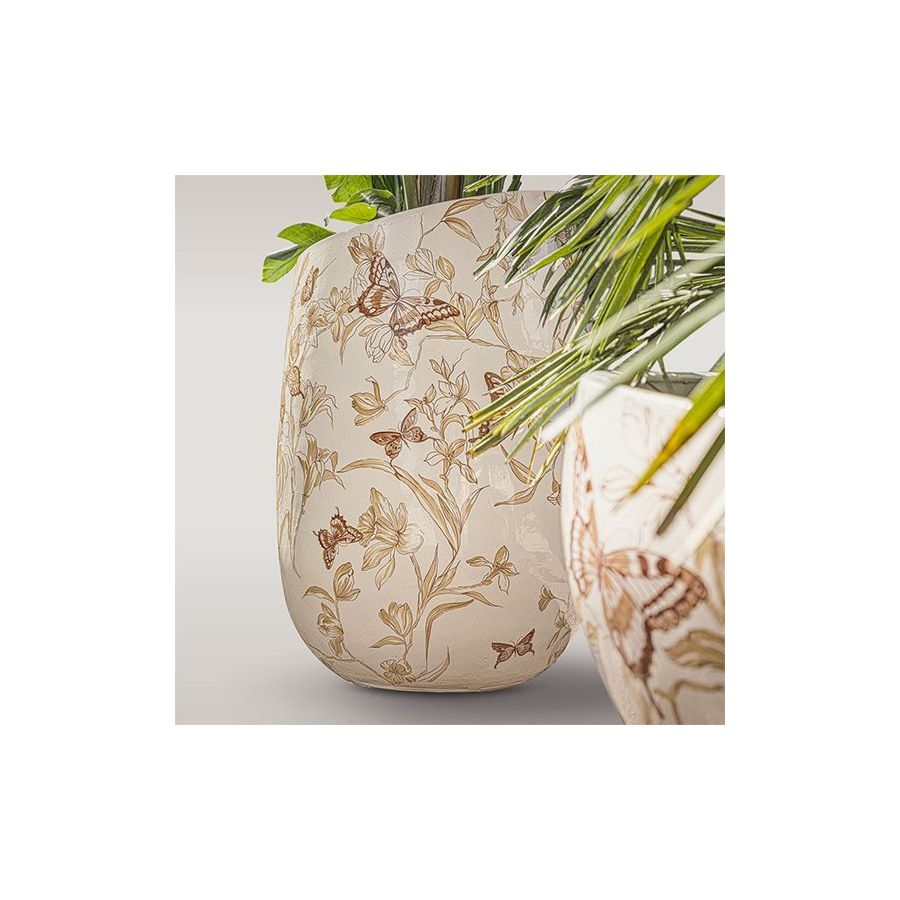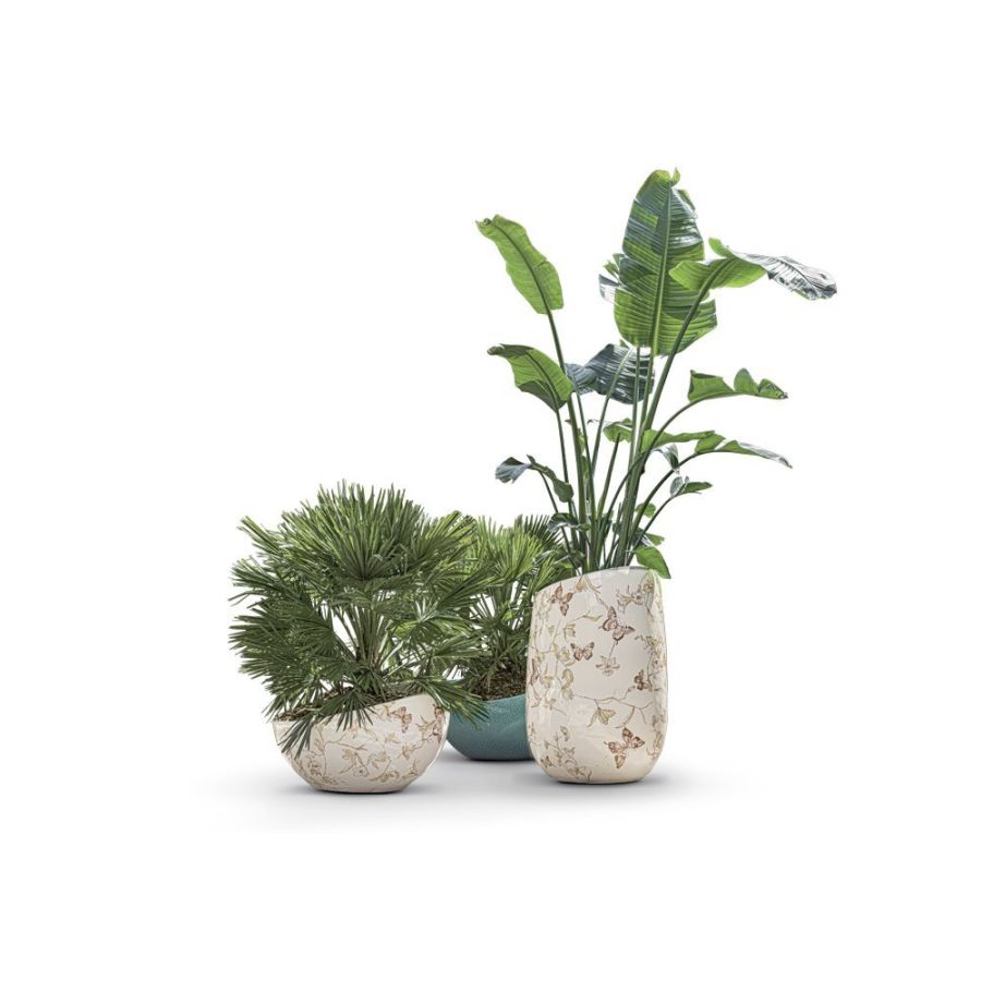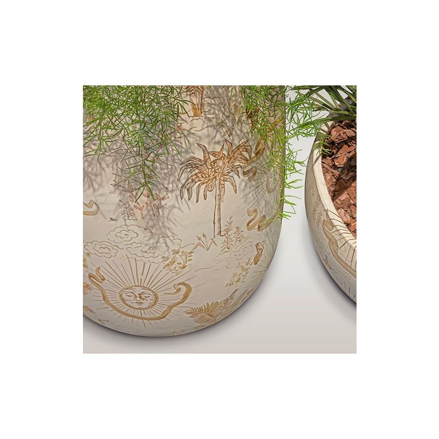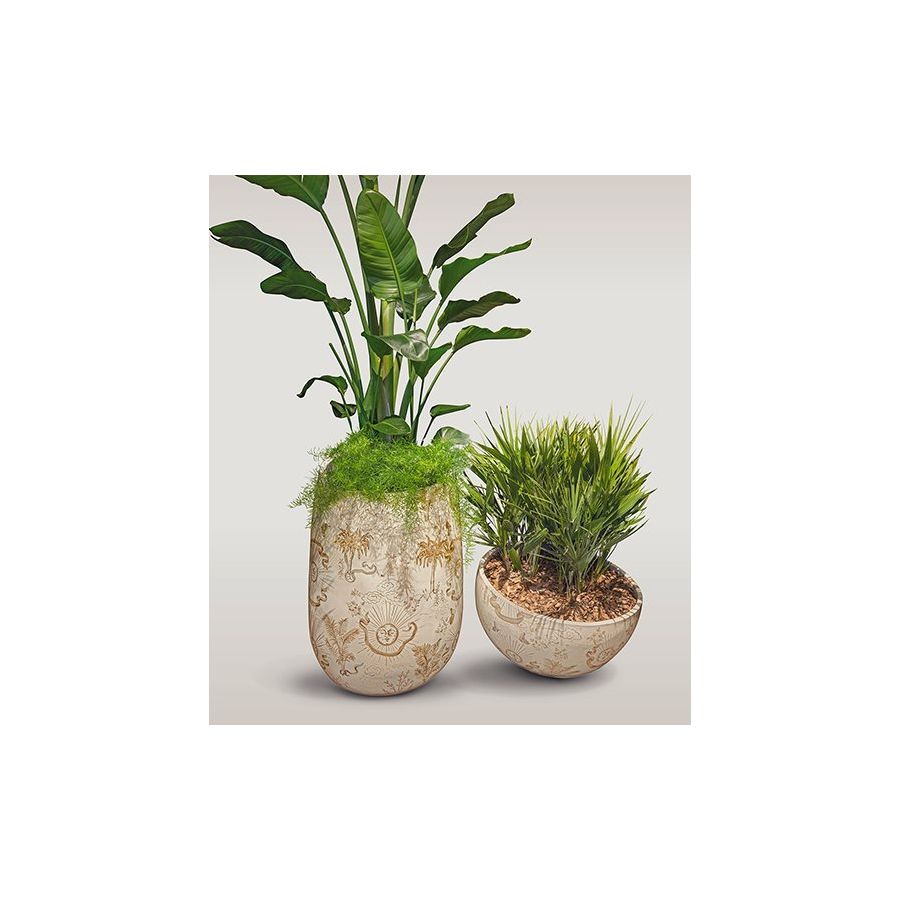 Plant and flower cachepots available in two heights. Made of glazed ceramic, either in a solid color or featuring two exclusive hand-painted illustrations.