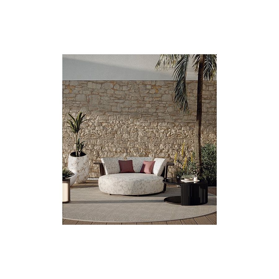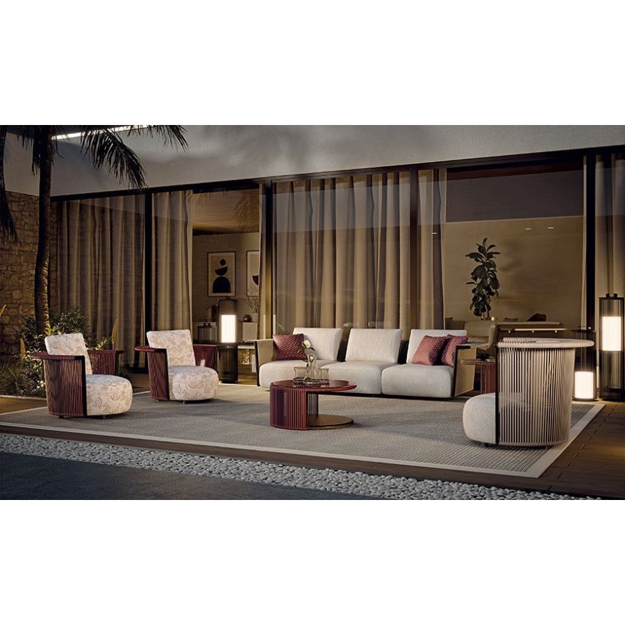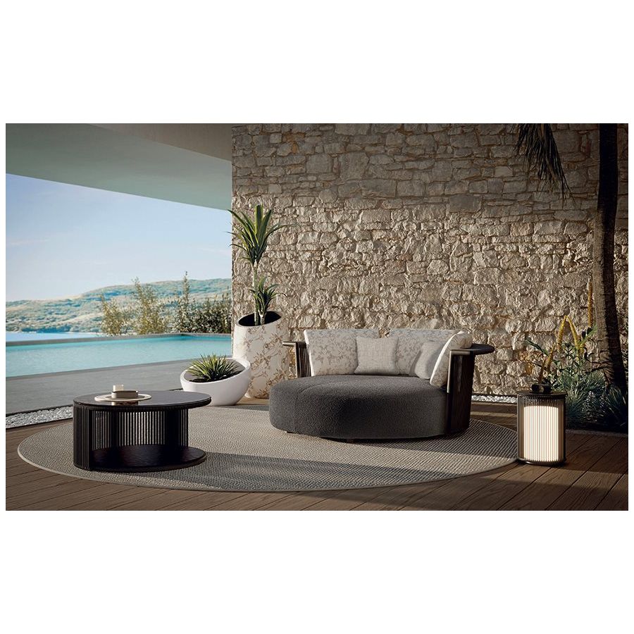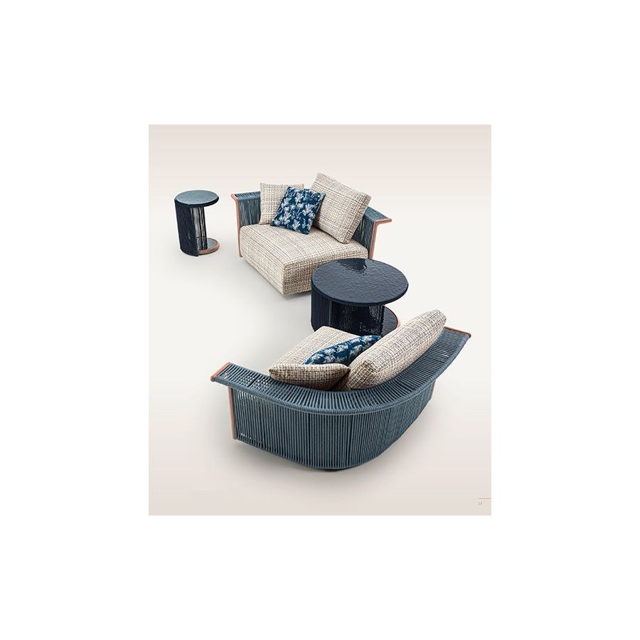 A collection made up of individual elements that can be put together to make straight, curved or corner sofas. The load-bearing structure is in epoxy-powder-coated 304 stainless steel, finely and manually woven with a fabric rope in the same colour. The seat is in wood, with PVC slats covered in special triple-density “draining” polyurethane foams in breathable water-repellent white covers to eliminate any dampness. The back cushion is in Rollo fill polyester, covered with a breathable water-repellent white lining. The structure is fitted with elegantly shaped ends in Iroko wood, in either a natural or dark tinted finish. All the fabric covers for both the seats and back cushions are removable.