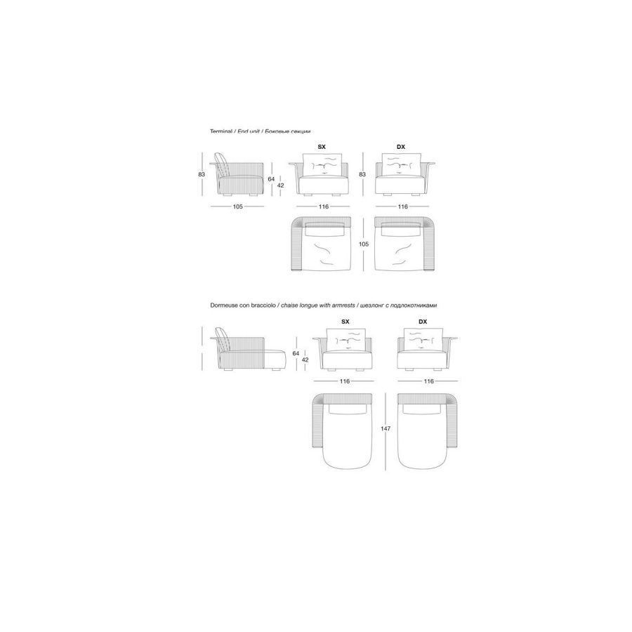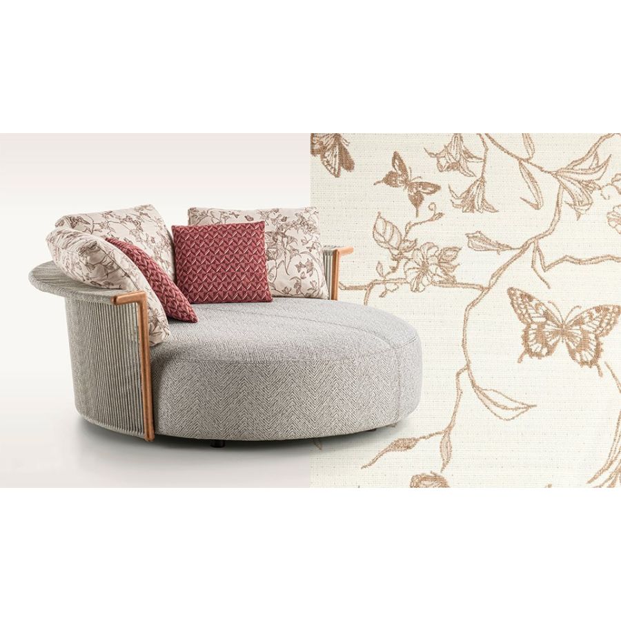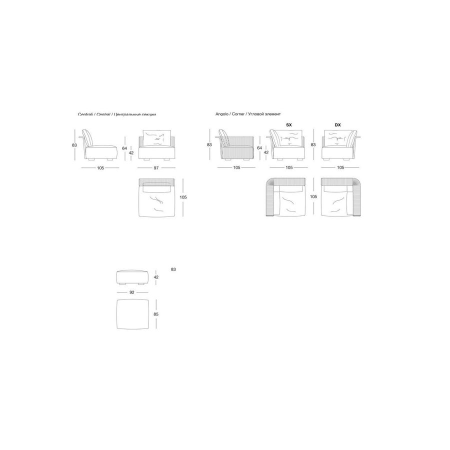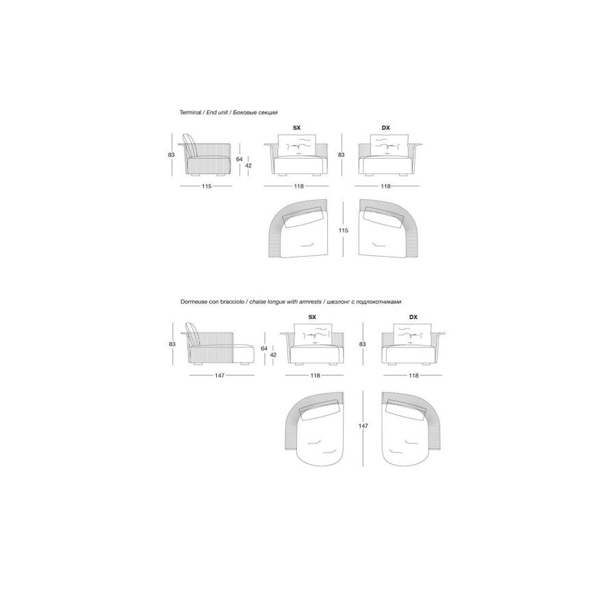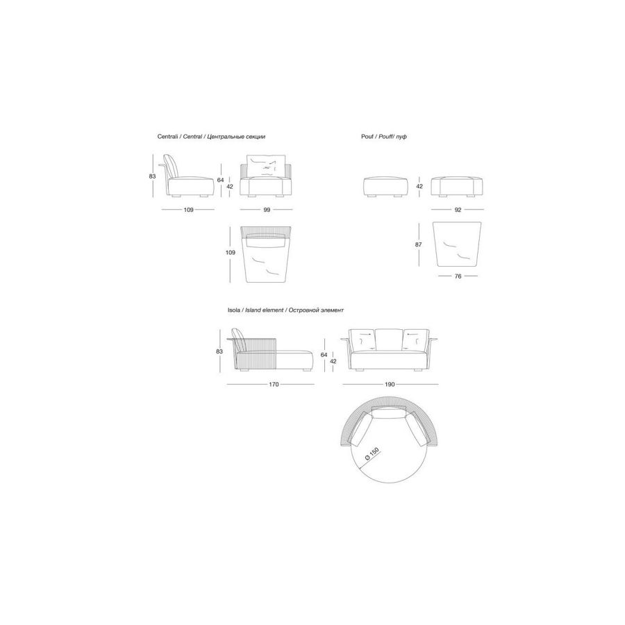 A collection made up of individual elements that can be put together to make straight, curved or corner sofas. The load-bearing structure is in epoxy-powder-coated 304 stainless steel, finely and manually woven with a fabric rope in the same colour. The seat is in wood, with PVC slats covered in special triple-density “draining” polyurethane foams in breathable water-repellent white covers to eliminate any dampness. The back cushion is in Rollo fill polyester, covered with a breathable water-repellent white lining. The structure is fitted with elegantly shaped ends in Iroko wood, in either a natural or dark tinted finish. All the fabric covers for both the seats and back cushions are removable.