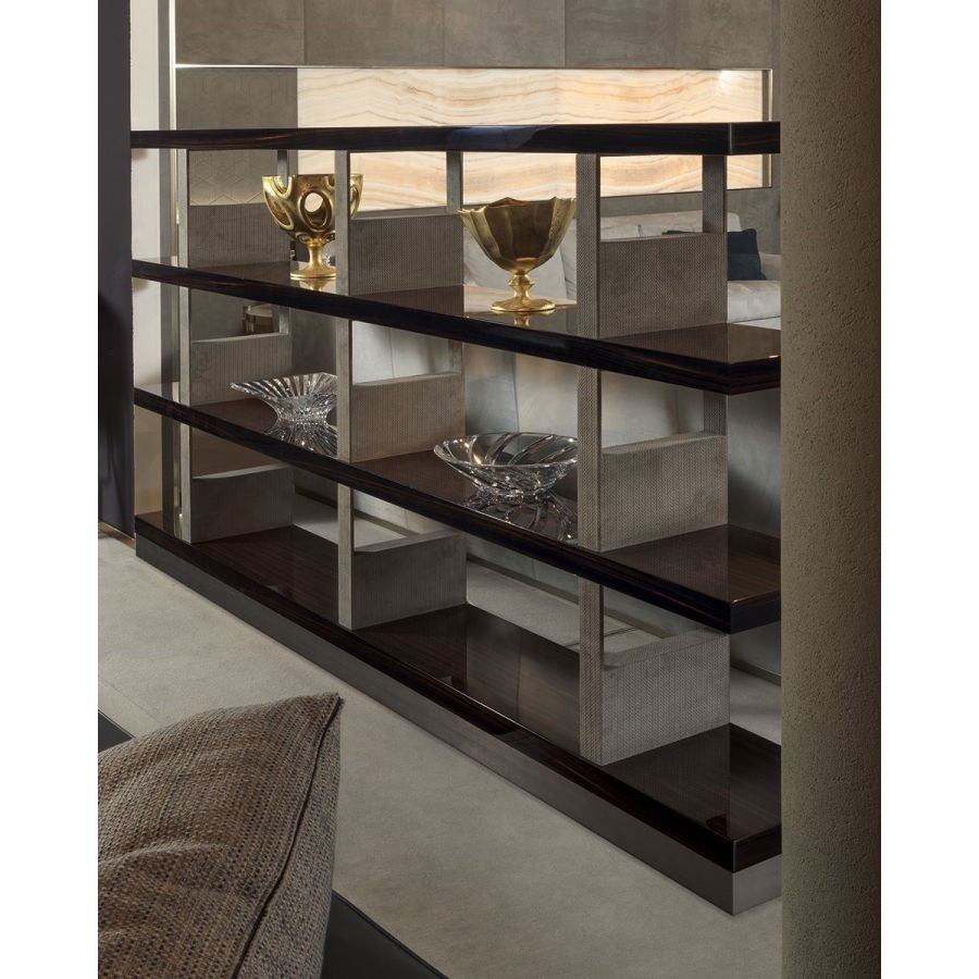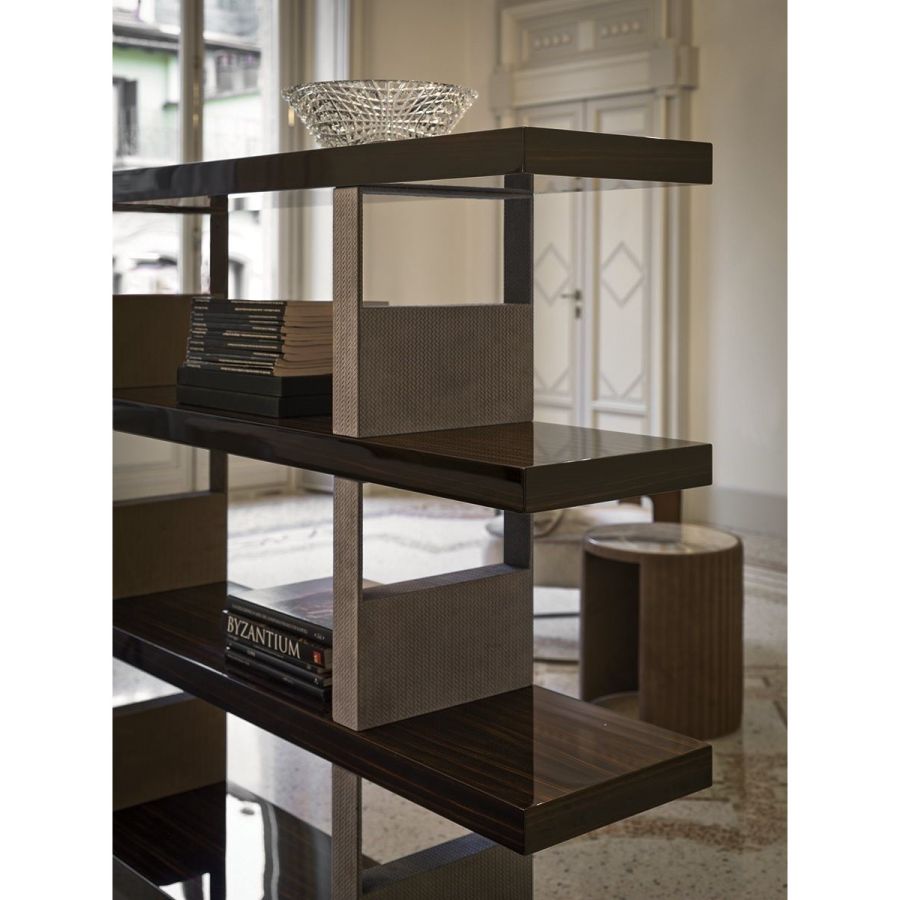 Modular bookcase made up of shelves in two lengths, assembled with supports / dividers in metal covered in leather from the range. Shelf finishes: - glossy lacquered wood in range colours, - glossy/matt Maple, - glossy/matt heat-treated Eucalyptus, - glossy/matt ebony, - glossy/matt Canaletto walnut, - glossy/matt Sycamore frisè. Metal base.