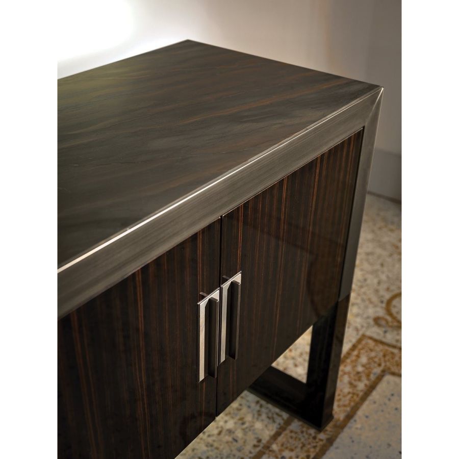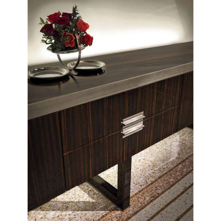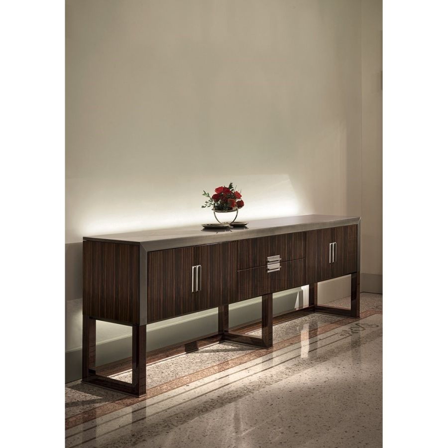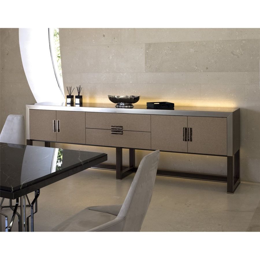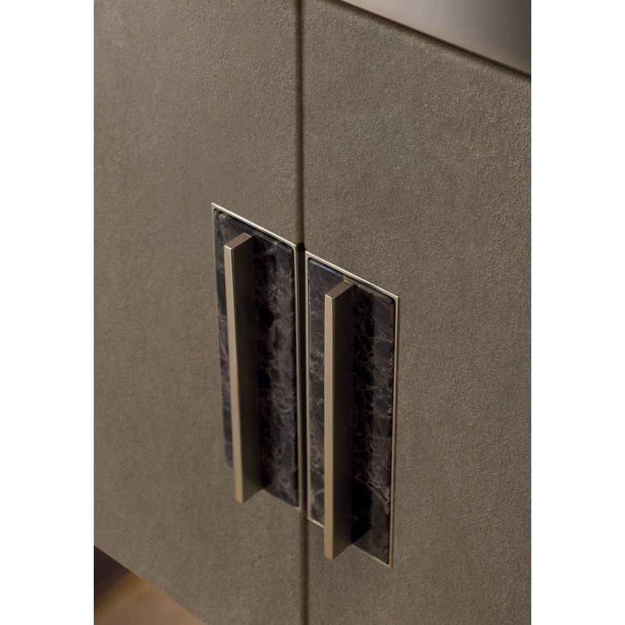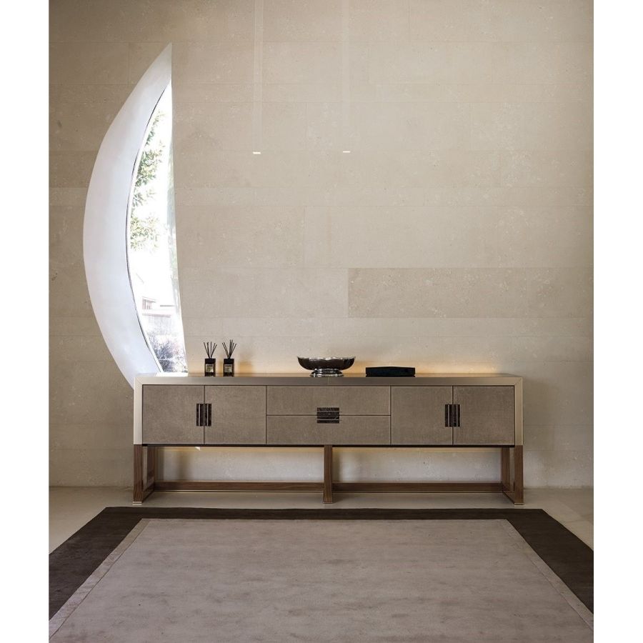 Cabinet with doors and drawers, legs and frame available in the following types of wood: glossy lacquered wood in range colours, glossy/matt Maple, glossy/matt heat-treated Eucalyptus, glossy/matt Sycamore frisè, glossy/matt Ebony, glossy/matt Canaletto walnut. Drawer fronts covered in leather or cashmere Loro Piana Interiors from the range or in the same type of wood as the frame. Profile of base and front cornice in ground metal in the finishes: Satin nickel, bright shaded brown, Black Rose gold, bright light gold, matt Champagne gold, bright chrome, bright black chrome, matt satin bronze, bright pink gold, matt pink gold. Top finish: bronze or smoky mirror with 20 mm bevel, black painted glass with 20 mm bevel, glossy lacquered wood in range colours, glossy/matt ebony, glossy/matt Canaletto walnut, glossy/matt Sucupira Luxury, White Carrara marble, Imperial Brown marble, Sahara Noir marble (polyester finish), Dover White marble, Panda White marble, Guatemala Green marble, Corteccia marble, Port Saint Laurent marble, RedLevanto marble, Bardiglio Nuvolato marble, Elegant Brown marble, Shale Rosewood marble, EmperadorDark marble, Silver Wave marble, Agatha Black marble, Frappuccino marble, Calacatta marble, Fusion Light marble, Patagonia marble, Explosion Blu marble, Fusion Multicolor marble. Quarzo Juliet marble. Handle in marble from the range or like the top. On the back, two dimmable LED strips light the lower and upper part of the chest. They are turned on with a touch-sensitive switch. The effect is a strip of light that illuminates the wall.