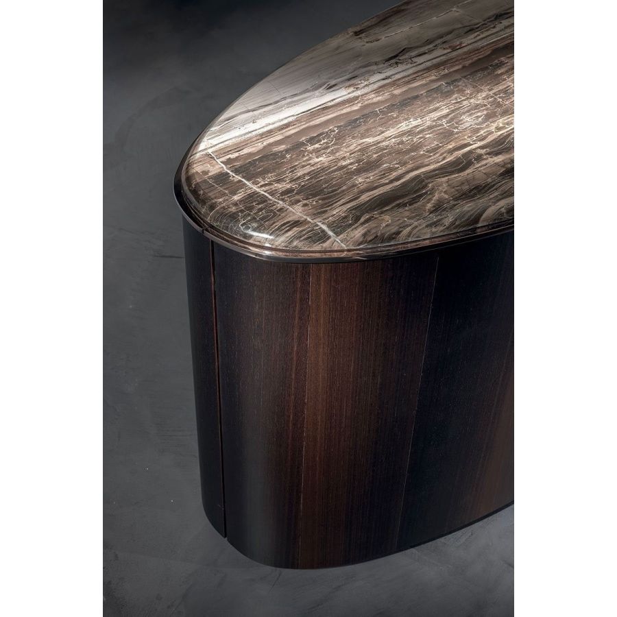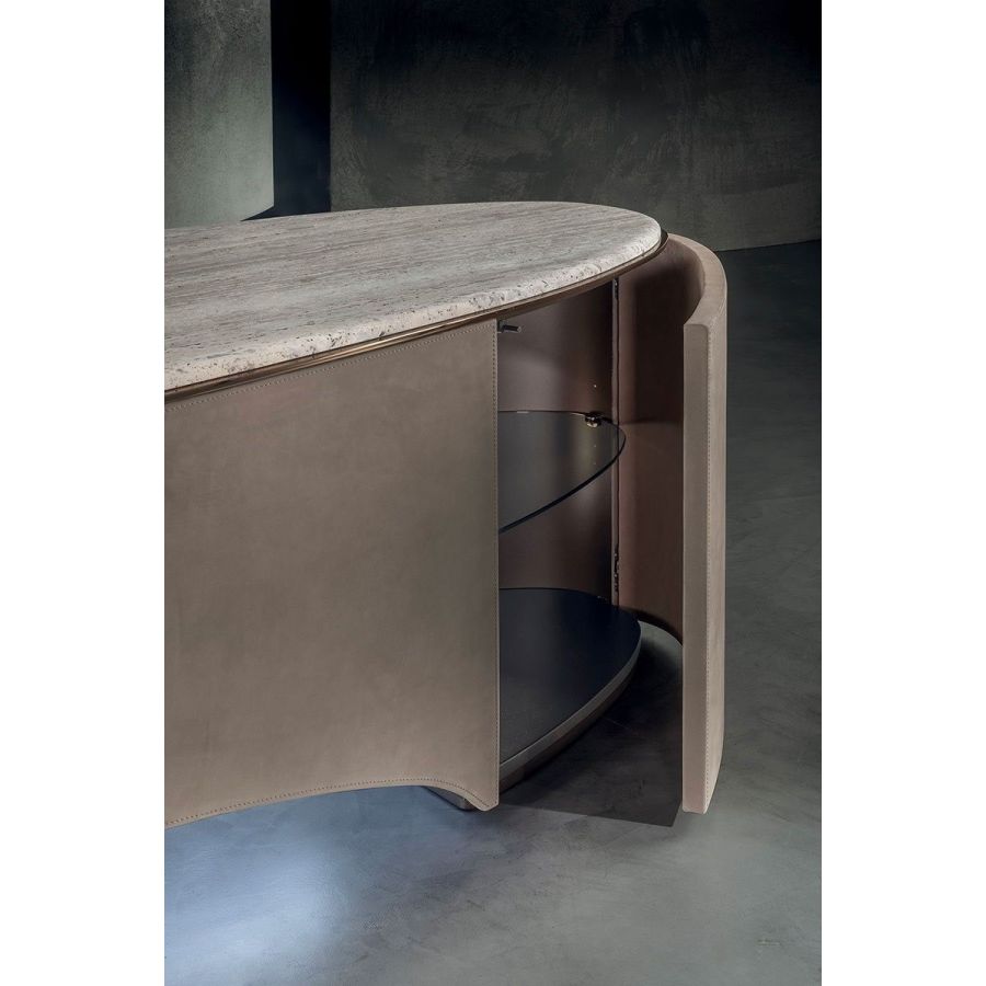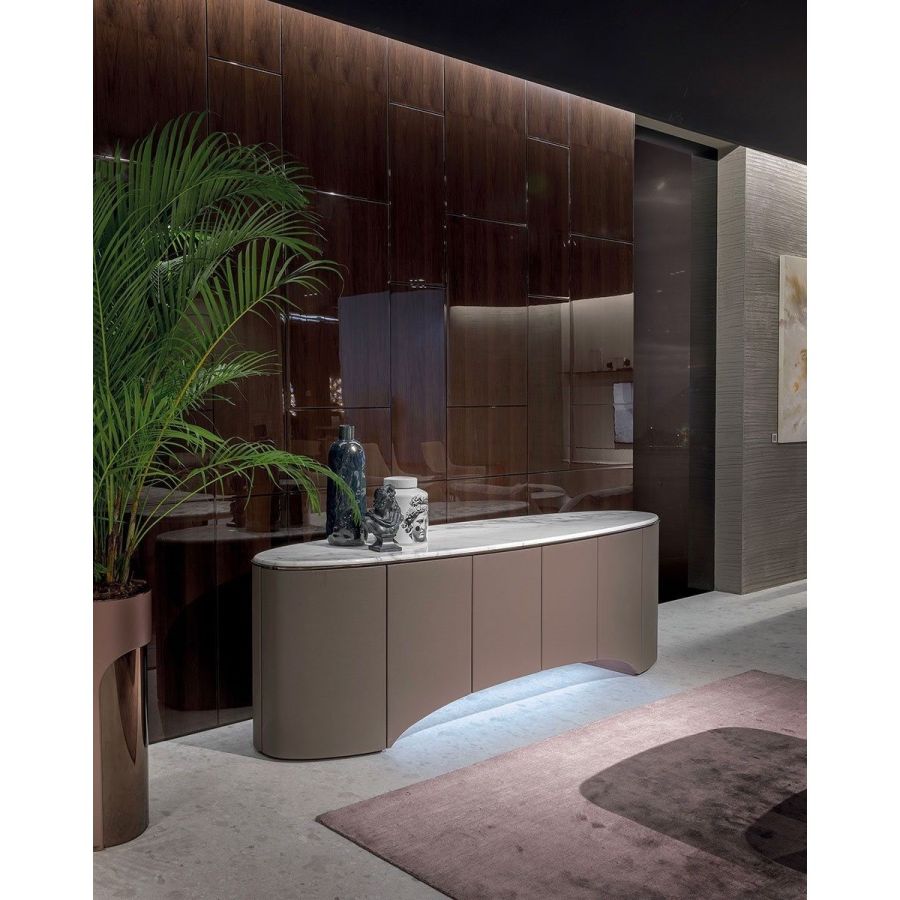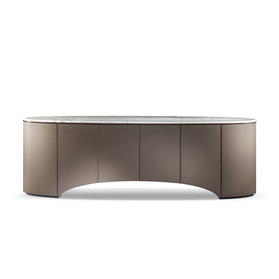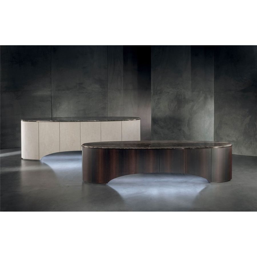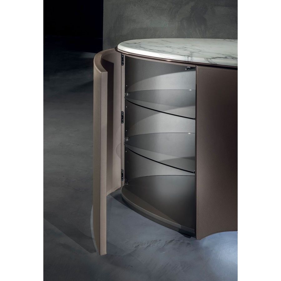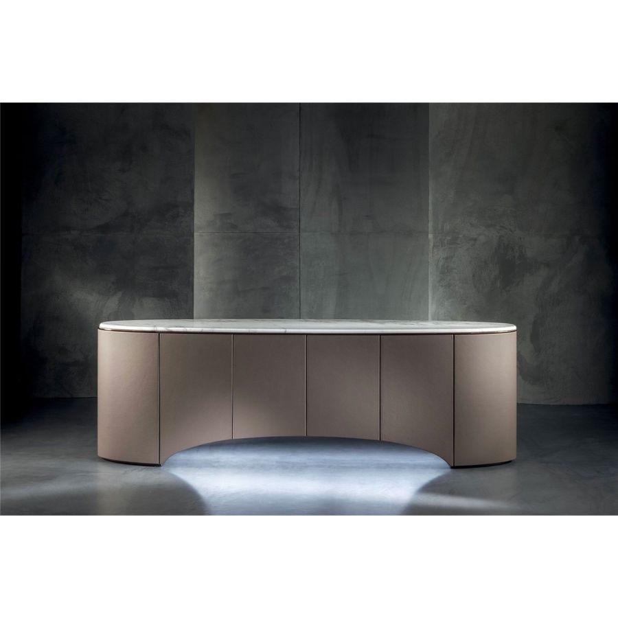 Elliptical cabinet with a wooden bridge structure in the finishes: Matt eucalyptus, Matt ebony, Matt sycamore frisè. Or covered in coloured leather from the catalogue. The cabinet has 6 doors with push-pull openings.The high version features 2 drawers with leather interiors (the drawer fronts are similar to the outside structure if covered, or if the structure is in wood, the drawers are covered in P.3 version leather). The elliptical top is in marble with a 20 mm thick half bullnose edge: Travertino, Silver Beola, Cipollino marble, Arabescato Orobico marble, Silver Stream marble, White Carrara marble, Imperial Brown marble, ElegantBrown marble, Sahara Noir marble (polyester finish), Dover White marble, Guatemala Green marble, RedLevanto marble, Shale Rosewood marble, Emperador Dark marble, Silver Wave marble, Agatha Black marble, Frappuccino marble, Calacatta marble, Patagonia marble, Juliet Quartz marble. Under the top, there is a cantilevered metal profile in the finishes: Satined/bright Champagne, Bright/satined Burnished,Shaded copper, Bright/satined shaded brown, Bright/satined Black rose, Bright/satined light gold, Bright/satined chrome, Bright/satined black chrome, Matt satined bronze. The central base is lit with dimmableLED lights.
