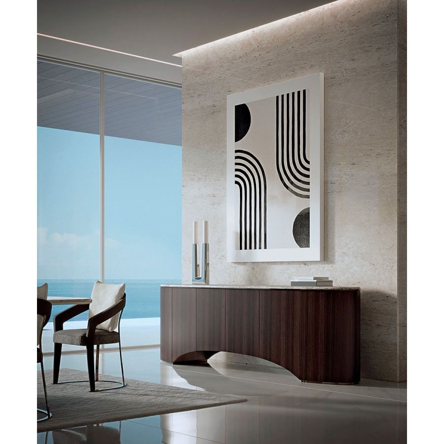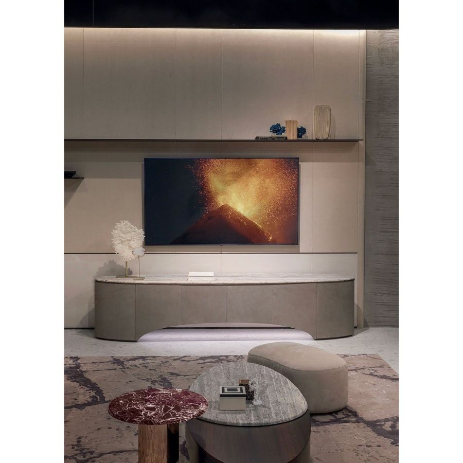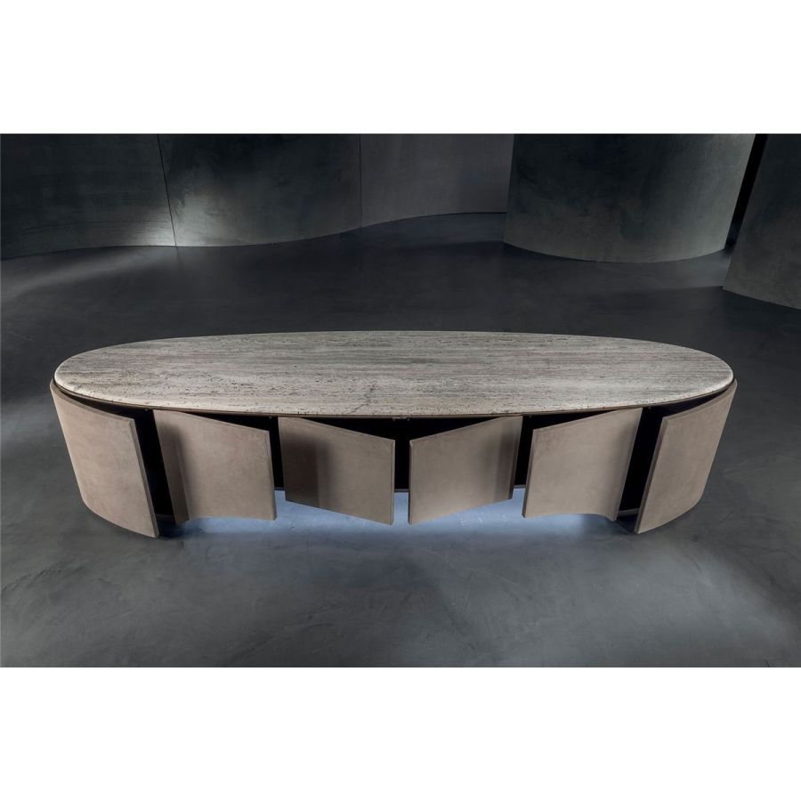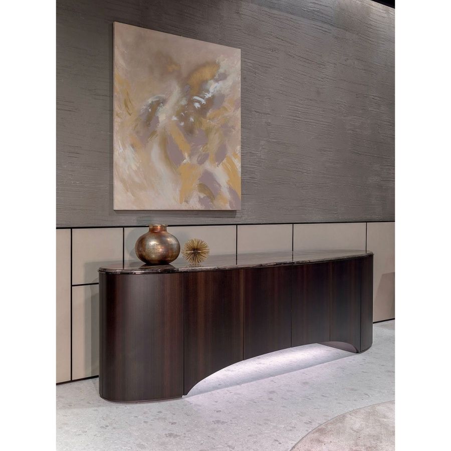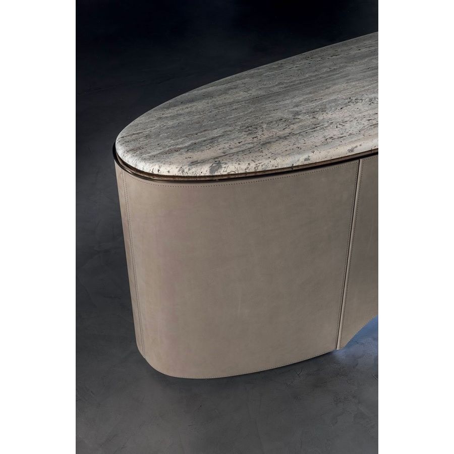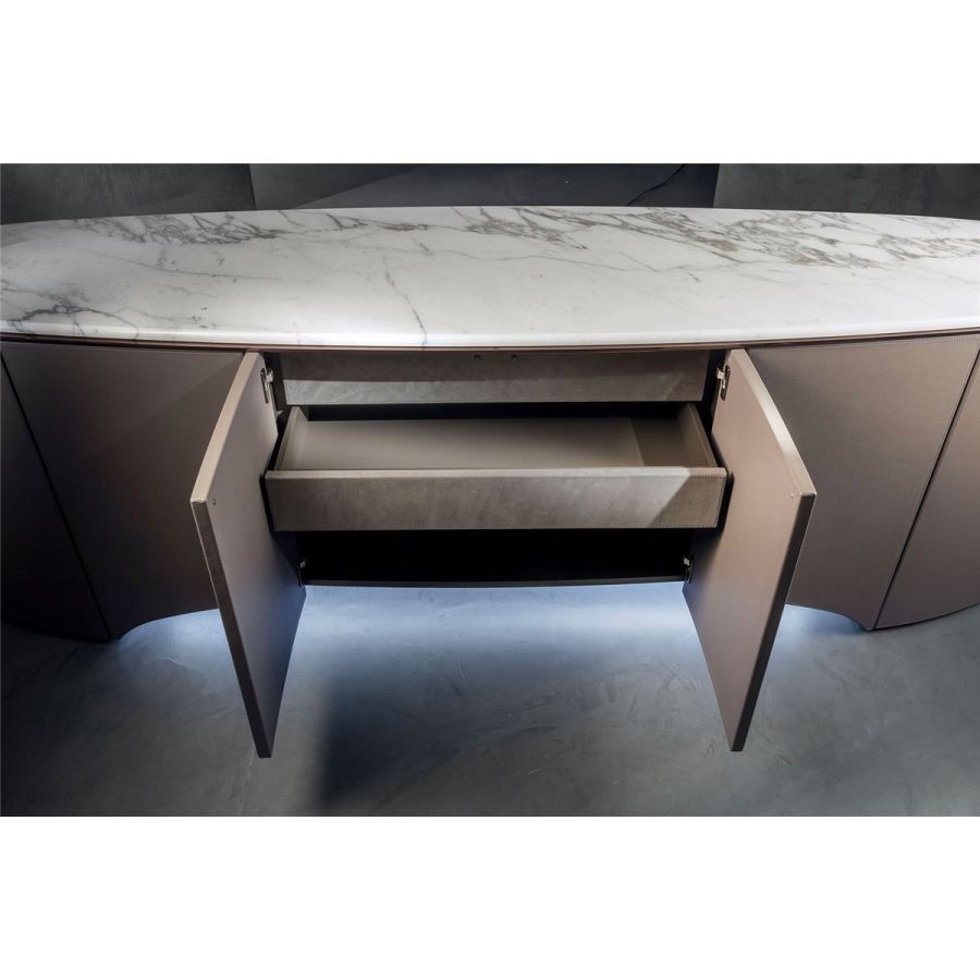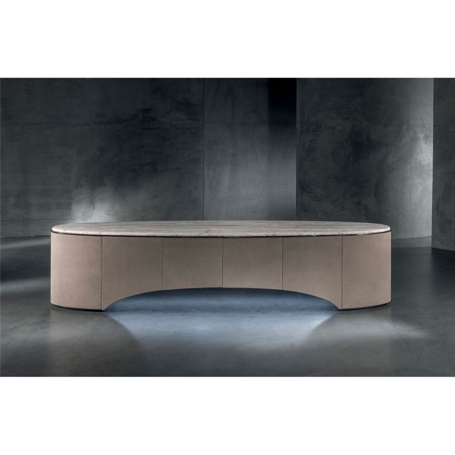 Elliptical cabinet with a wooden bridge structure in the finishes: Matt eucalyptus, Matt ebony, Matt sycamore frisè. Or covered in coloured leather from the catalogue. The cabinet has 6 doors with push-pull openings.The high version features 2 drawers with leather interiors (the drawer fronts are similar to the outside structure if covered, or if the structure is in wood, the drawers are covered in P.3 version leather). The elliptical top is in marble with a 20 mm thick half bullnose edge: Travertino, Silver Beola, Cipollino marble, Arabescato Orobico marble, Silver Stream marble, White Carrara marble, Imperial Brown marble, ElegantBrown marble, Sahara Noir marble (polyester finish), Dover White marble, Guatemala Green marble, RedLevanto marble, Shale Rosewood marble, Emperador Dark marble, Silver Wave marble, Agatha Black marble, Frappuccino marble, Calacatta marble, Patagonia marble, Juliet Quartz marble. Under the top, there is a cantilevered metal profile in the finishes: Satined/bright Champagne, Bright/satined Burnished,Shaded copper, Bright/satined shaded brown, Bright/satined Black rose, Bright/satined light gold, Bright/satined chrome, Bright/satined black chrome, Matt satined bronze. The central base is lit with dimmableLED lights.