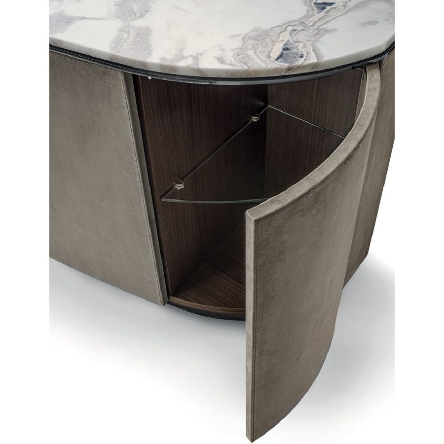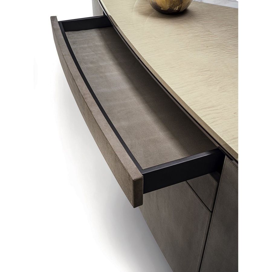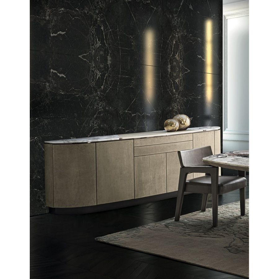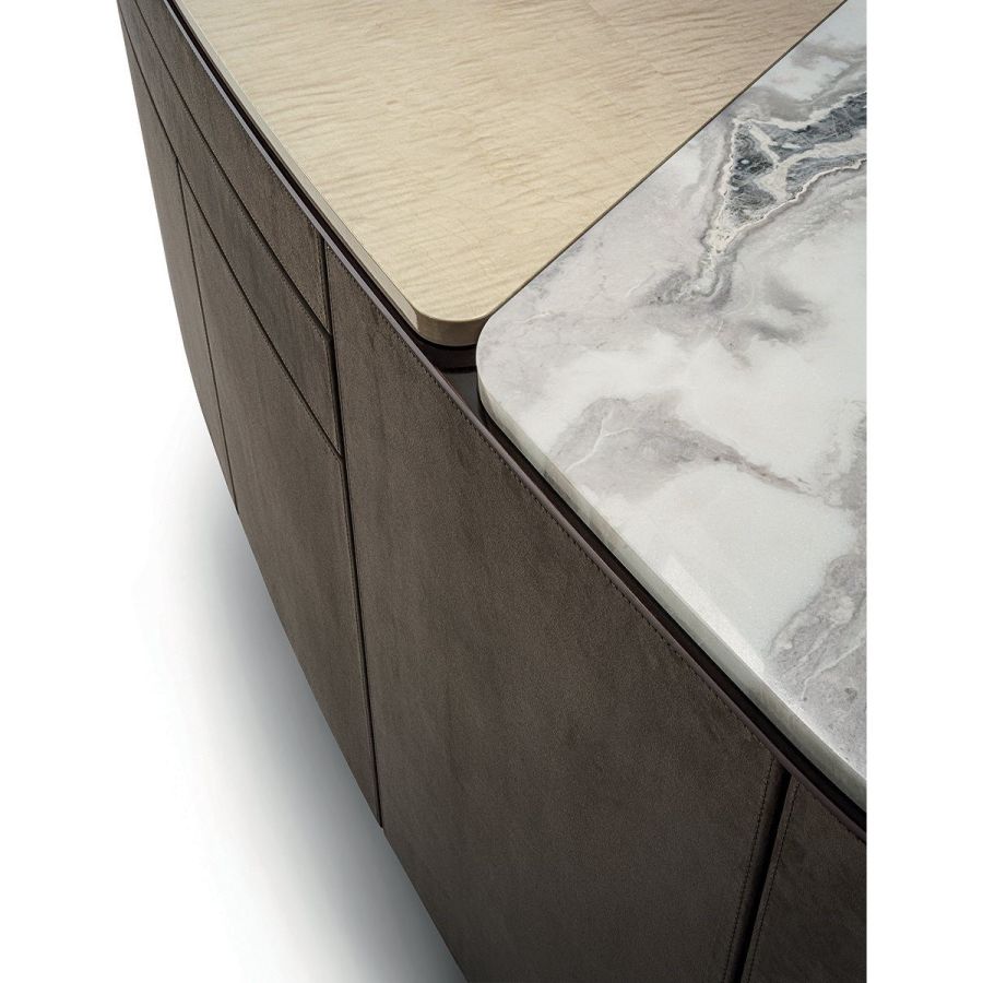 The cabinet’s generous size makes it a versatile and functional piece of furniture. The cabinet features wooden doors and front drawers upholstered in leather with a contoured and trisected top made of multiple materials: a specific characteristic of the Keope collection.