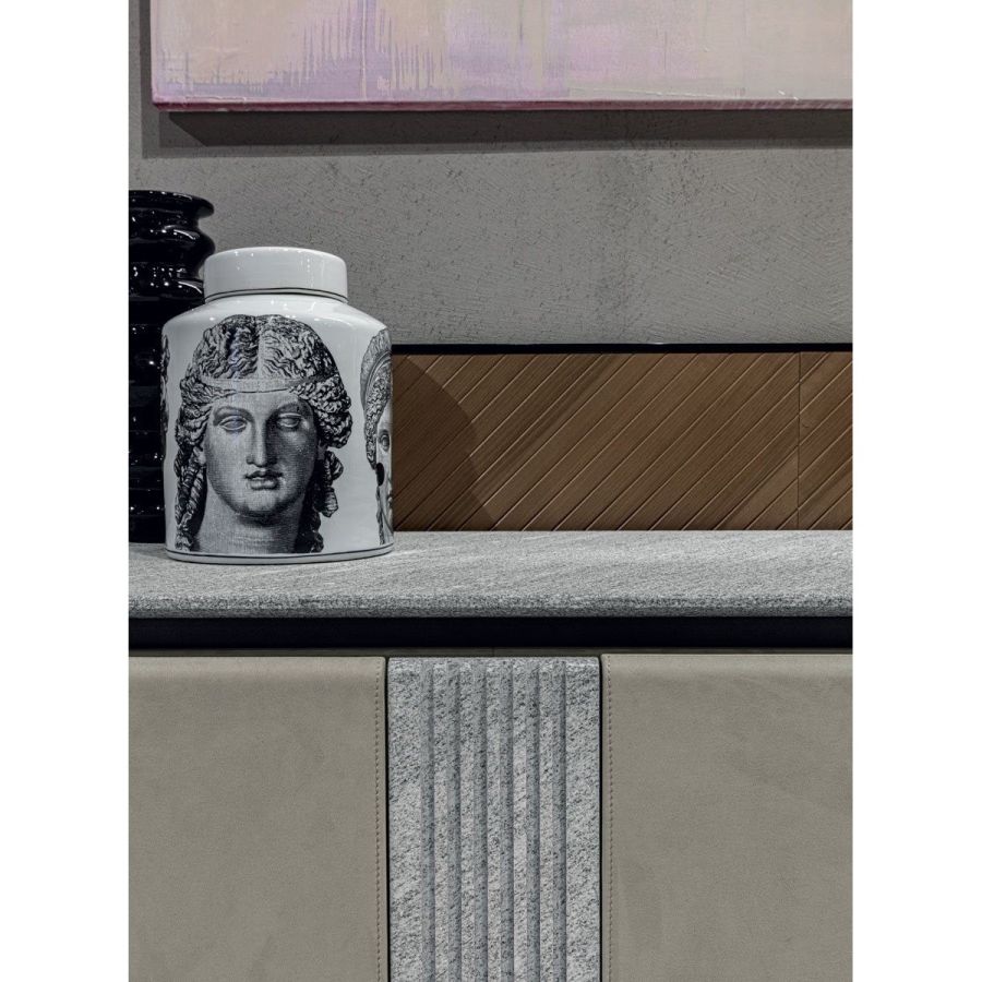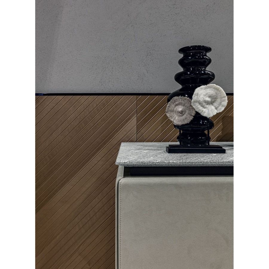 This cabinet has a wood structure is in glossy/matt Maple, glossy/matt heat-treated Eucalyptus, glossy/matt Ebony, glossy/matt medium Canaletto walnut, glossy/matt Sycamore frisè, or covered in leather from the categories P.3 Tecsuede/P.6 Soffio. The container surface is decorated with marble inserts (it is best to match these with the top) in the finishes: Silver beola stone, Cipollino marble, Arabescato Orobico marble, Silver Stream marble, White Carrara marble, Imperial Brown marble, Guatemala Green marble, Elegant Brown marble, Red Levanto marble, Shale Rosewood marble, Emperador Dark marble, Silver Wave marble, Agatha Black marble, Calacatta marble. The marble top comes in the listed above, or in wood: glossy/matt Maple, Glossy/matt heat-treated Eucalyptus, glossy/matt Ebony, Glossy/matt medium Canaletto walnut, glossy/matt Sycamore frisè, A crystal shelf is positioned inside. An internal drawer is optional. The cabinet is finished on all sides.