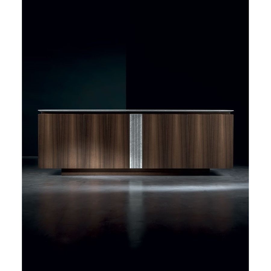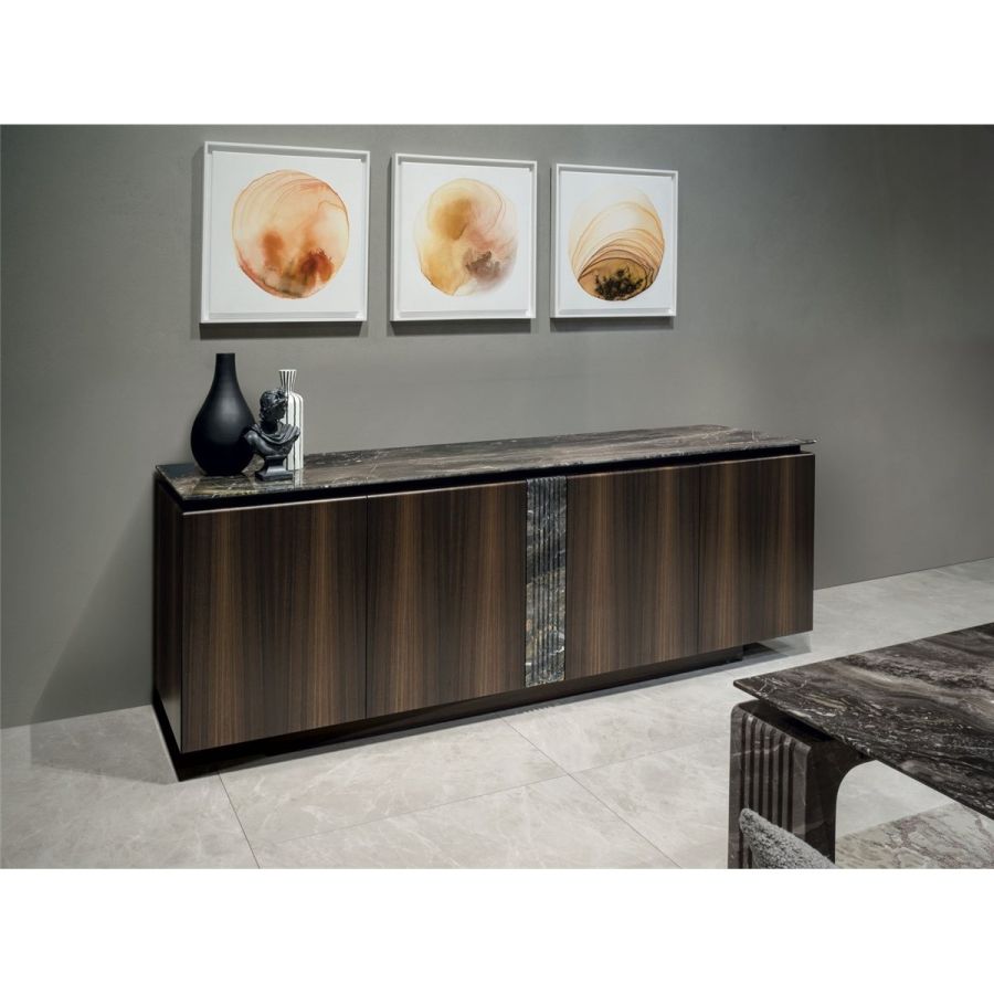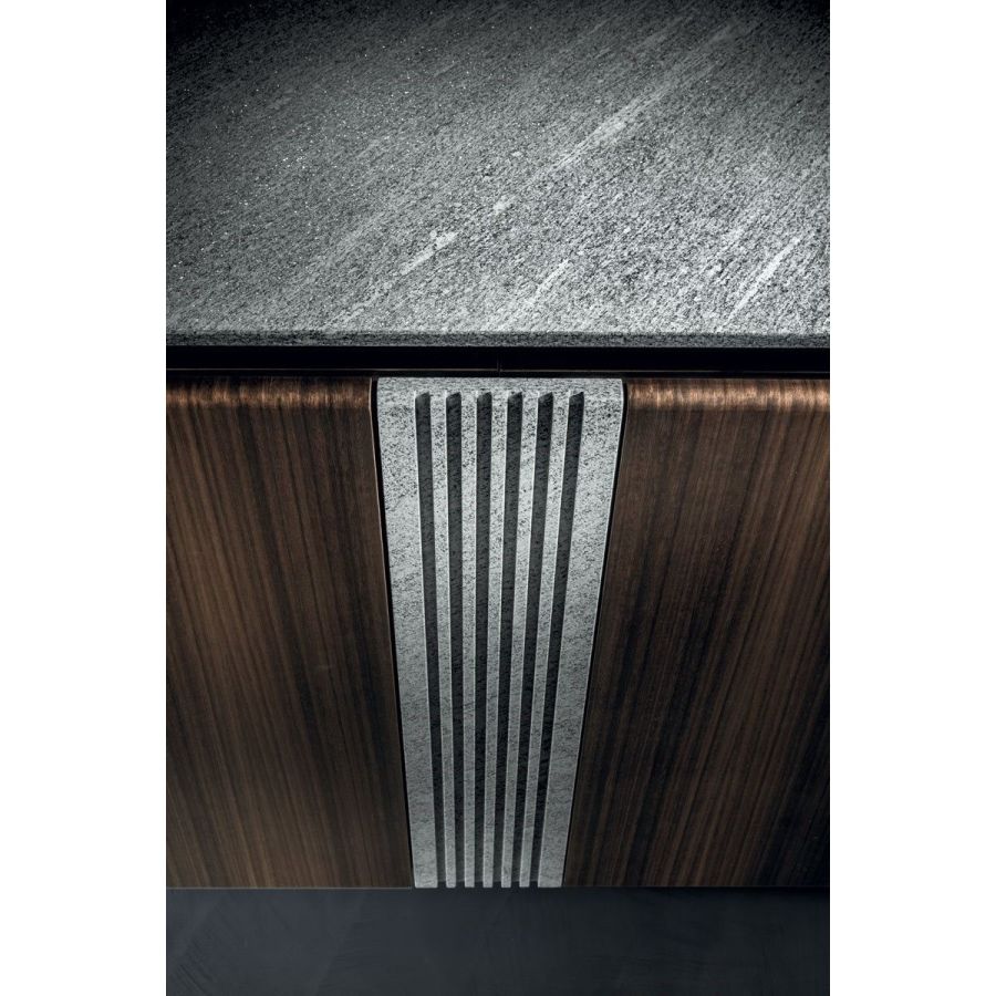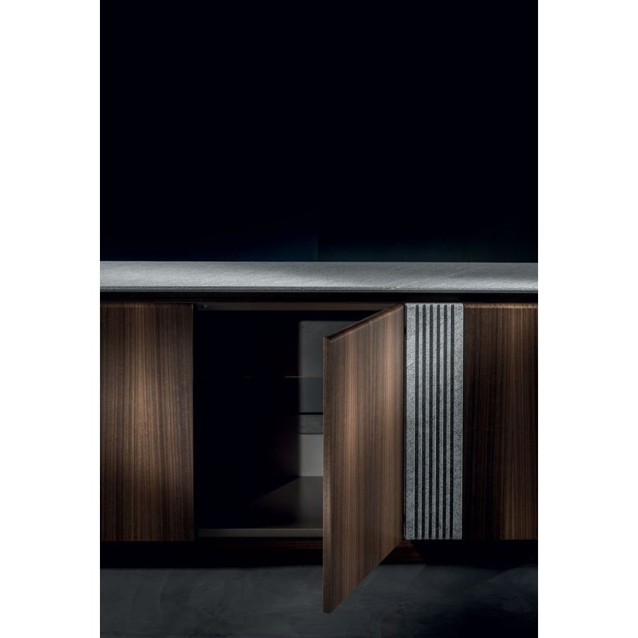 Kimmel is a cabinet developed horizontally for the dining area to use with the Dominic table: expressions of fine cabinetry and technology, they share fine quality materials. The original design that runs through the central insert of this unit recalls the grooved leg of the table. Designed to convey simplicity, they contrast with the choice of sophisticated and very precious materials.