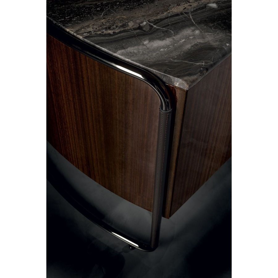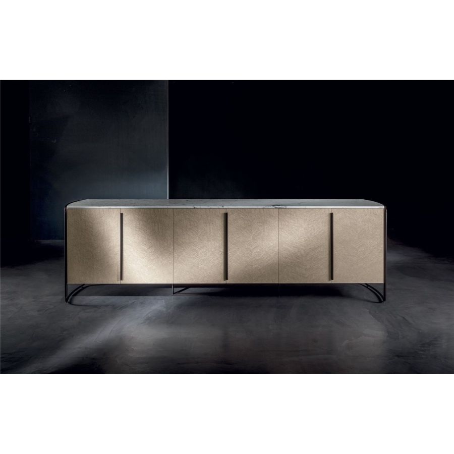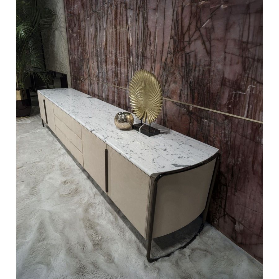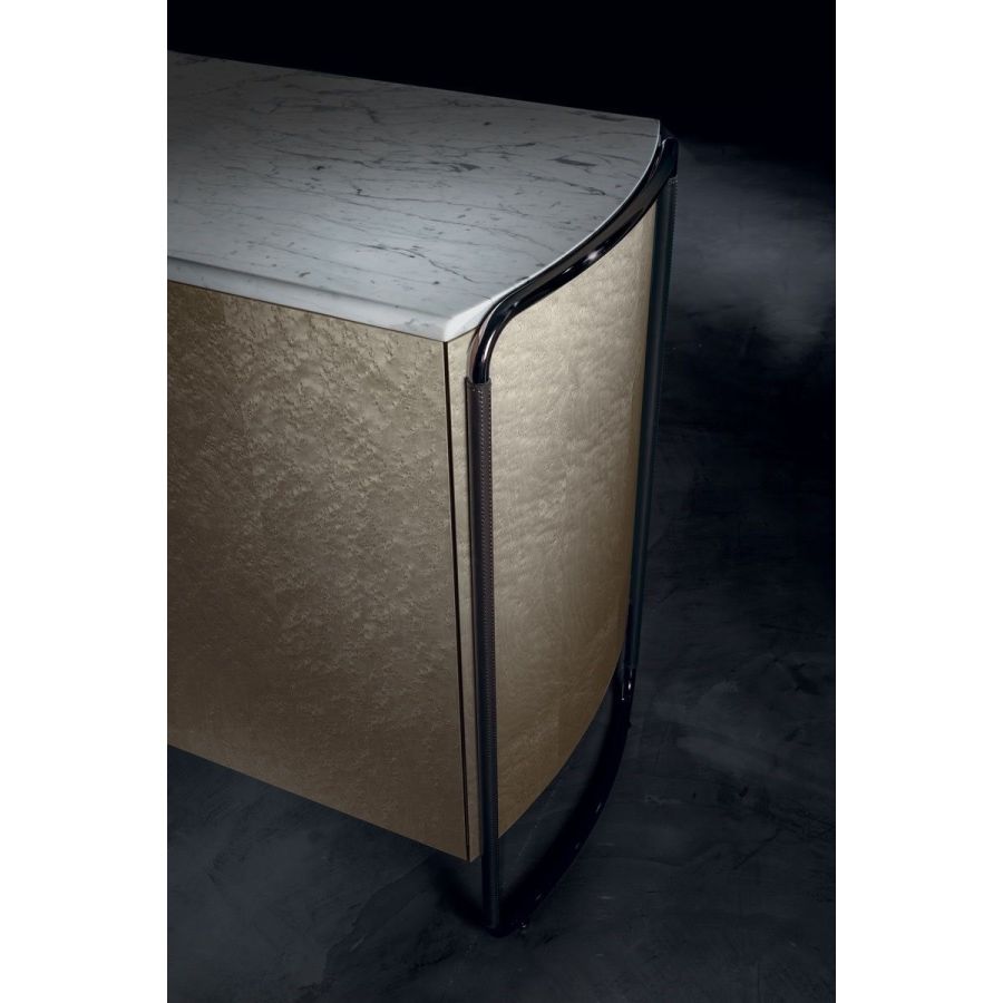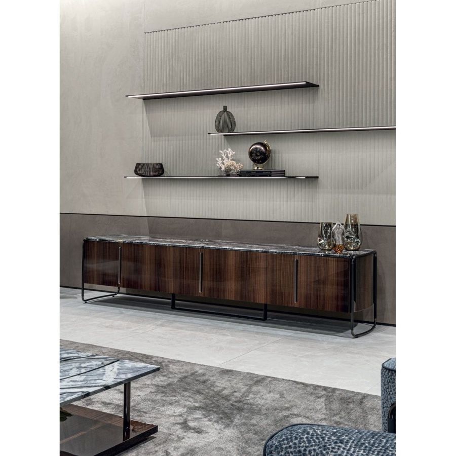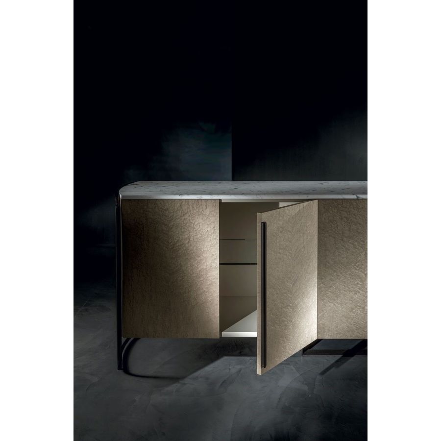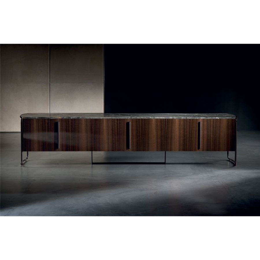 Collection of living room furniture characterized with rounded tubular metal parts, available in two heights and two widths, and comprising a storage container unit with drawers and doors. The wood structure is in glossy/matt Maple, glossy/matt heat-treated Eucalyptus, glossy/matt Ebony, glossy/matt medium Canaletto walnut, glossy/matt Sycamore frisè, or covered in leather from the categories P.3 Tecsuede/P.6 Soffio. The external sides are in tubular metal, slightly curved like a hug, in the finishes: Shaded copper, Bright shaded brown, Black Rose gold, bright light gold, Champagne gold, bright chrome, bright black chrome, matt satined bronze. The tubular metal parts, handles, and supporting base are partially covered in “Renova”, a particular type of recycled leather that is sustainable and anti-bacterial. Available in the colours shown in the catalogue. The top is available in wood 22 mm: glossy/matt Maple, Glossy/matt heat-treated Eucalyptus, glossy/matt Ebony, Glossy/matt medium Canaletto walnut, glossy/matt Sycamore frisè. Or in marble, thickness 20 mm: Silver beola stone, Cipollino marble, Arabescato Orobico marble, Silver Stream marble, White Carrara marble, Imperial Brown marble, Sahara Noir marble (polyester finish), Dover White marble, Guatemala Green marble, Red Levanto marble, Shale Rosewood marble, Emperador Dark marble, Silver Wave marble, Agatha Black marble, Frappuccino marble, Calacatta marble, Patagonia marble, Juliet Quartz marble. A crystal shelf is positioned inside. The cabinet is finished on all sides.