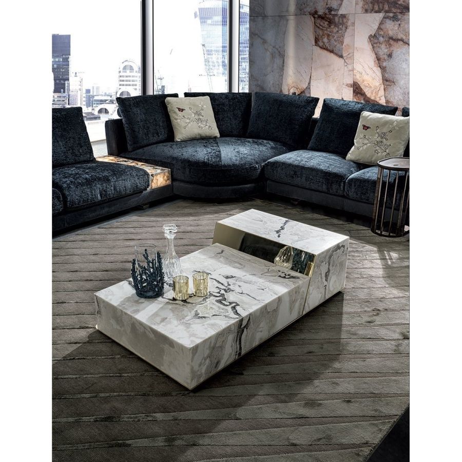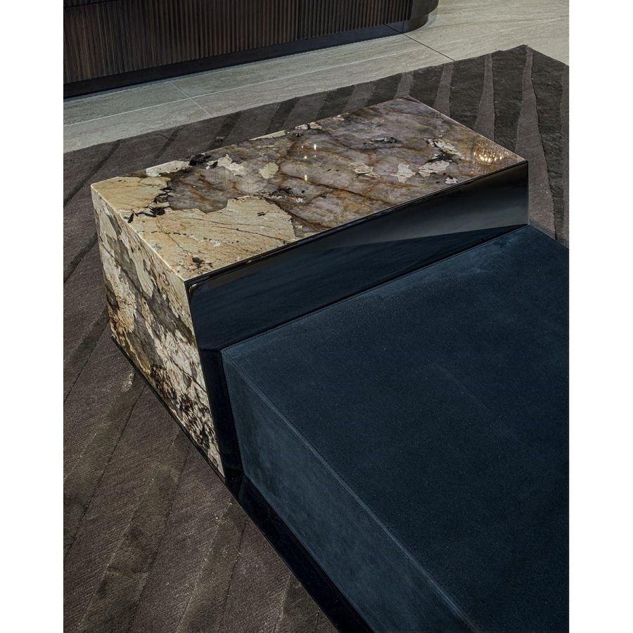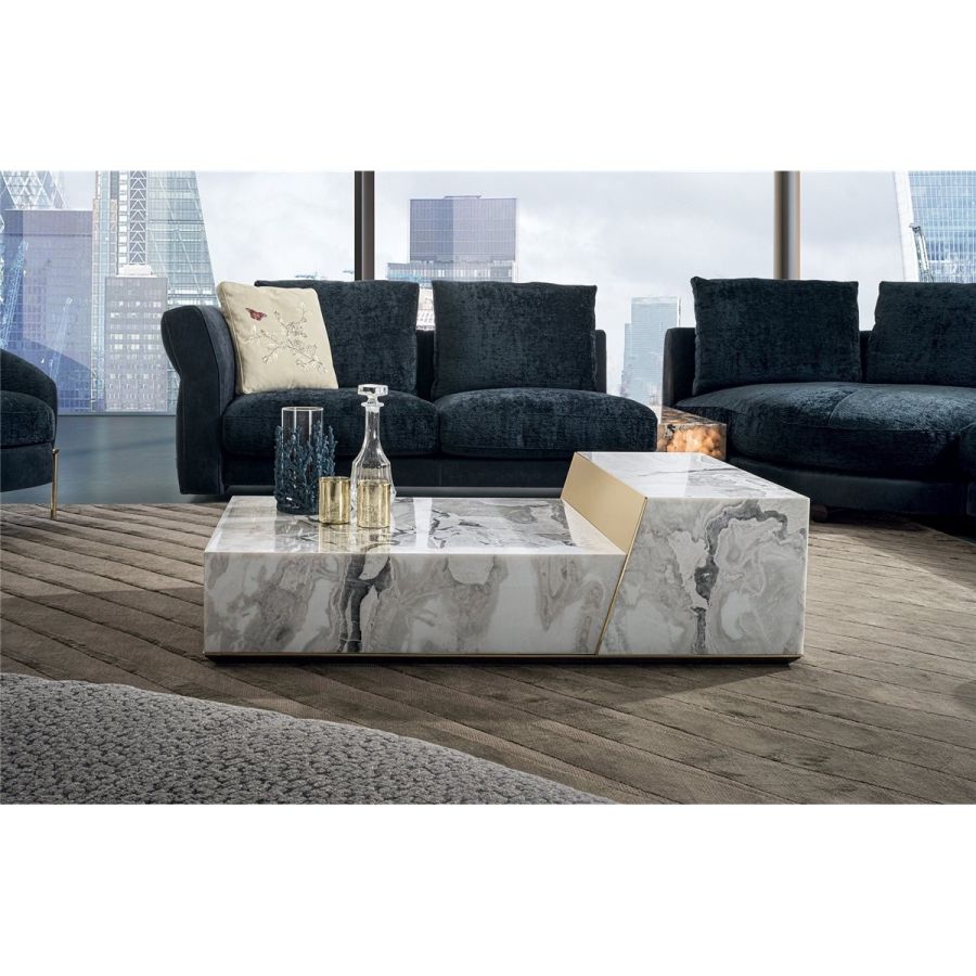 Low table made up of two box structure blocks of different heights with metal profiles in the finishes: Satin nickel, bright shaded brown, Black Rose gold, bright light gold, matt Champagne gold, bright chrome, bright black chrome, matt satin bronze, bright pink gold, matt pink gold. The low block can be covered in: leathers from the catalogue, glossy lacquered wood in range colours, glossy/matt Maple, glossy/mattheat-treated Eucalyptus, glossy/matt Sycamore frisè, glossy/matt Ebony, glossy/matt Canaletto walnut,White Carrara marble, Imperial Brown marble, Dover White marble, Panda White marble, Guatemala Green marble, Corteccia marble, Port Saint Laurent marble, Red Levanto marble, Bardiglio Nuvolato marble, ElegantBrown marble, Shale Rosewood marble, Emperador Dark marble, Silver Wave marble, Agatha Blackmarble, Frappuccino marble, Calacatta marble, Fusion Light marble, Patagonia marble, Explosion Blue marble,Fusion Multicolor marble, Juliet Quartz marble, Azul Macauba marble, Portoro marble, Red onyx, Ivory onyx, white onyx. The tall block can only be in marble/onyx in the finishes listed above.