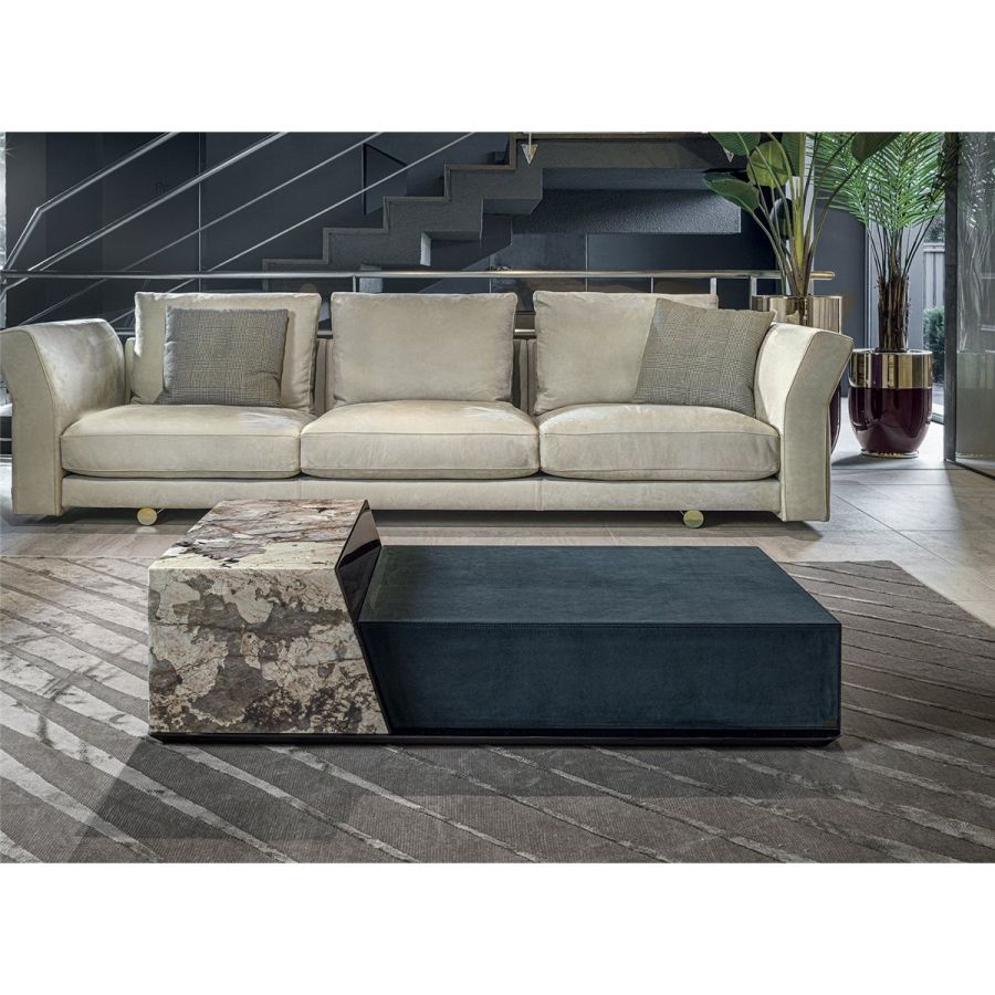 Bold is a low coffee table characterised by a minimalist aesthetic and by a number of unexpected material combinations. A highly decorative coffee table with a simple rectangular shape, it features a metal border that divides the volume into two parts and is available in various configurations: marble, leather, or wood.