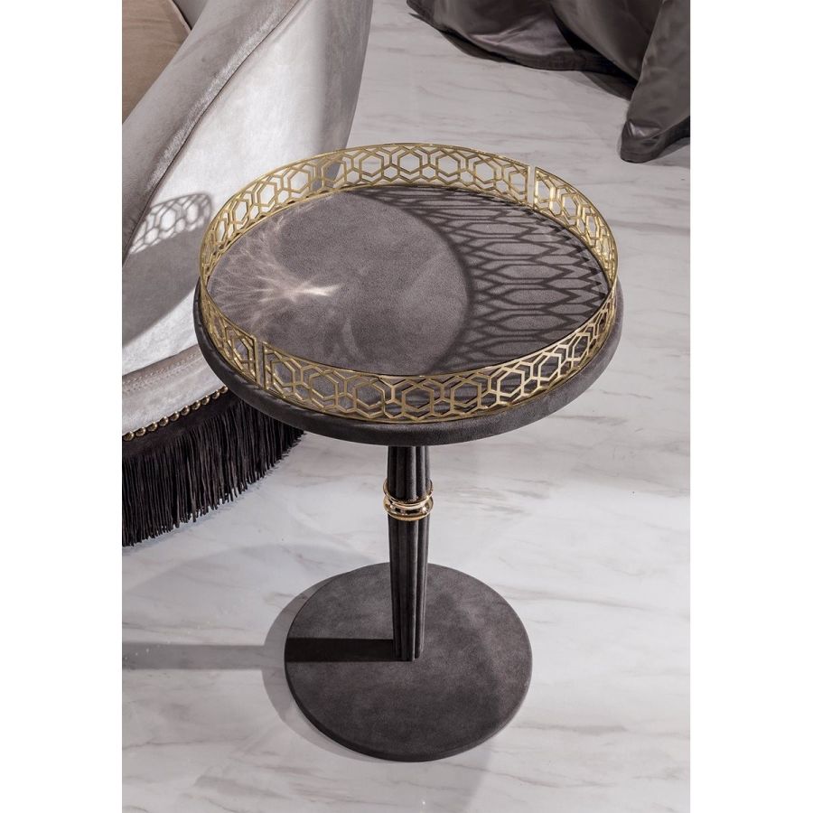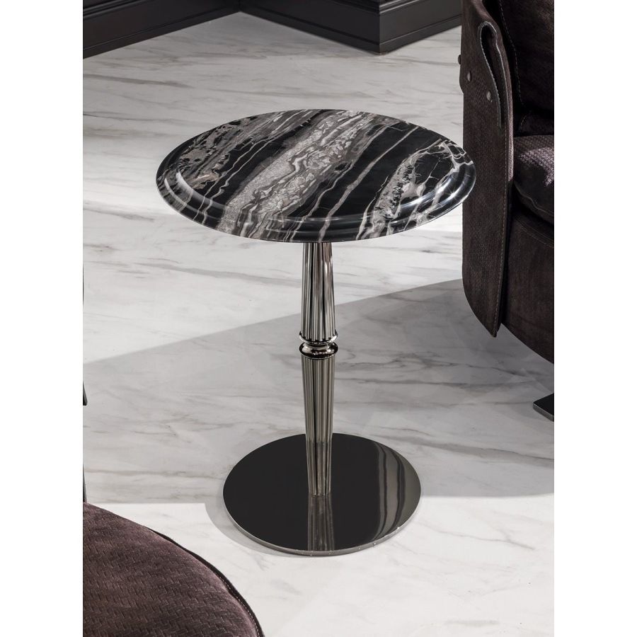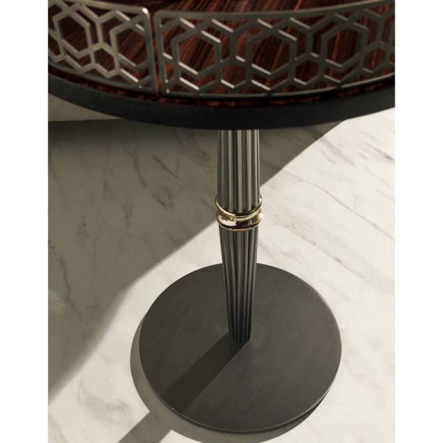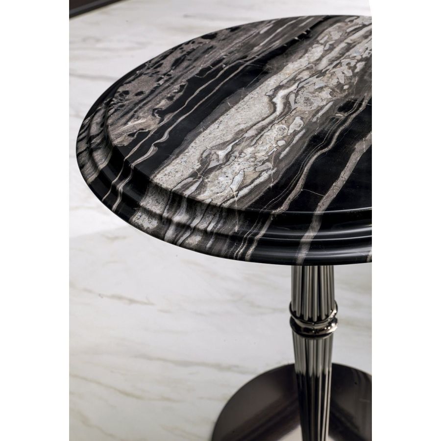 With the round Gueridon tables, Giuseppe Iasparra rewrites the aesthetics of the classic small service table, transforming it into a purposely eccentric object of high design. It is an attractive piece to use in different rooms, most of all between two chairs.The base consists of a grooved support column divided by a turned ring. The small table is available in two variants: one with marble top and another with the top in wood or leather with a decorative perimeter cornice.