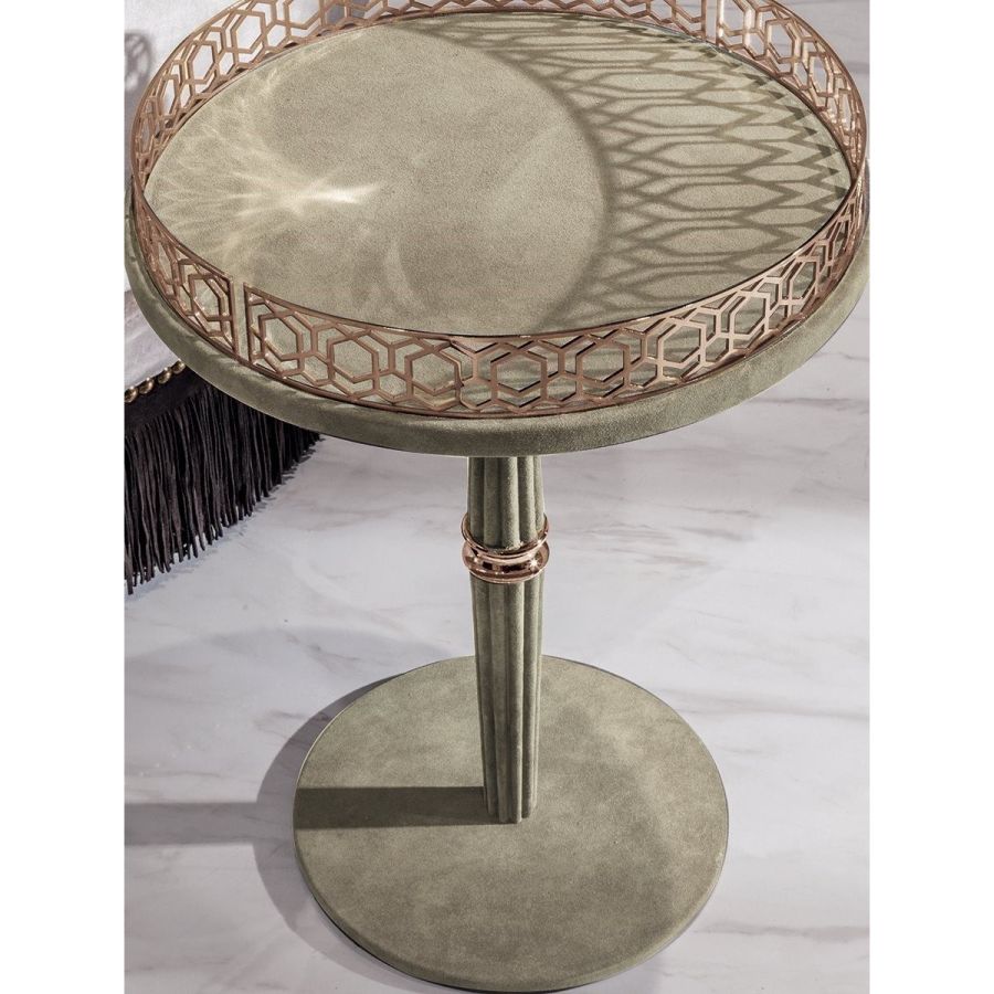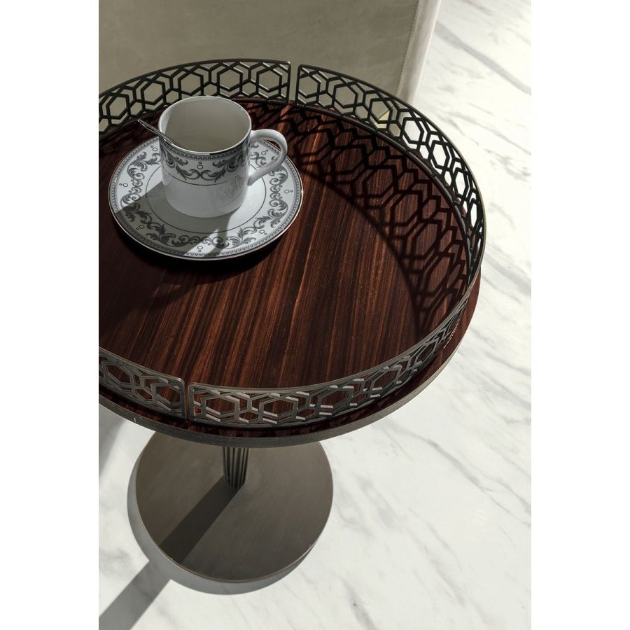 Small tables available in two versions with different tops. 1 - with shaped top in marble 20 mm thickness: White Carrara marble, Imperial Brown marble, Sahara Noir marble (glossy and matt polyester finish), Dover White marble, Panda White marble, Guatemala Green marble, Corteccia marble, Port Saint Laurent marble, Red Levanto marble, Bardiglio Nuvolato marble, ElegantBrown marble, Shale Rosewood marble, Emperador Dark marble, Silver Wave marble, Agatha Black marble, Frappuccino marble, Calacatta marble, Fusion Light marble, Patagonia marble, Explosion Blue marble, Fusion Multicolor marble, Juliet Quartz marble, Calcite Azul marble, Azul Macauba marble, Portoro marble. 2 - with top in wood or covered in leathers as in our sample set with a circular metal frame with laser cut “Sequence” decoration. Central column available in three variants: A - all in metal, like the base, B - fully covered in leathers as in our sample set, C - fully covered in leathers as in our sample set with a turned metal ring in the same finish as the base. Round base available in the finishes: Satin nickel, bright shaded brown, Black Rose gold, bright light gold, matt Champagne gold, bright chrome, bright black chrome, matt satin bronze, bright pink gold, matt pinkgold. Covered in leathers as in our sample set.