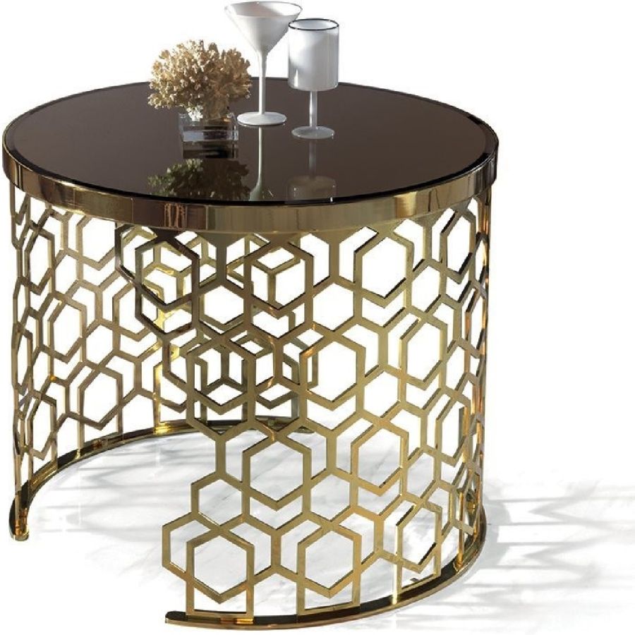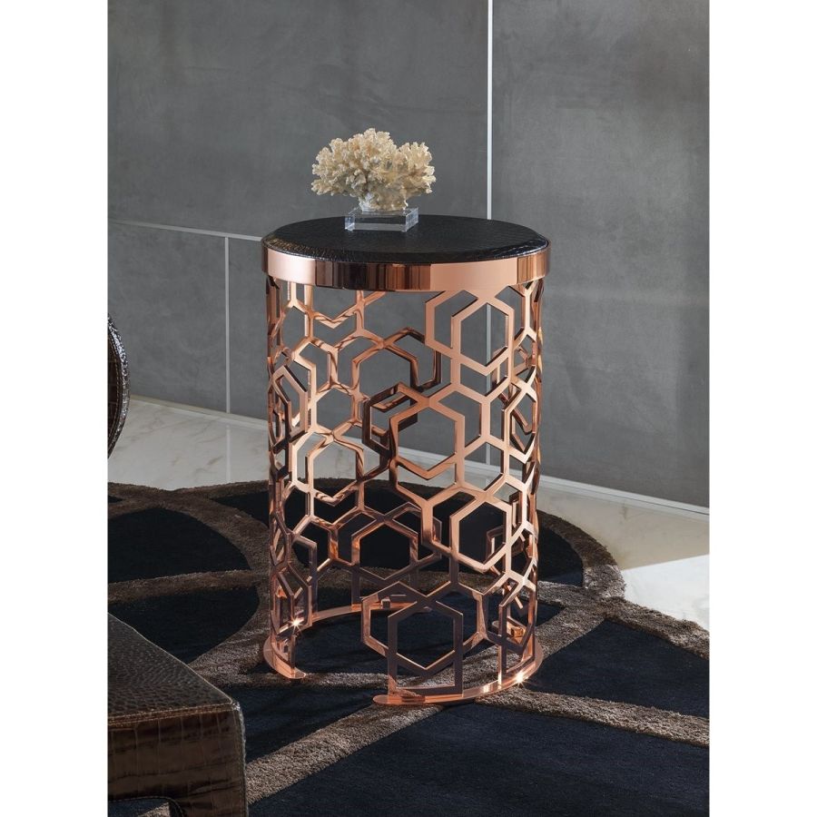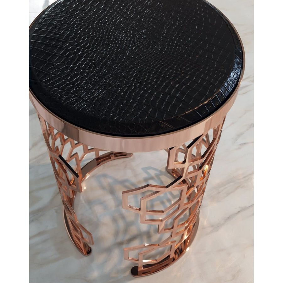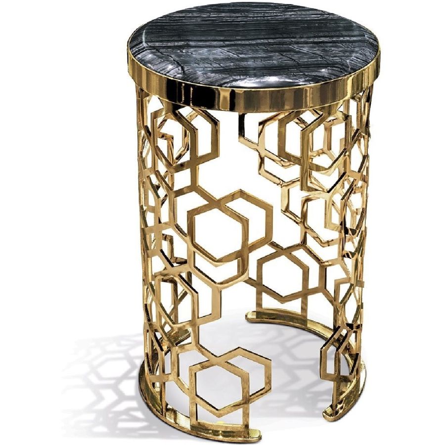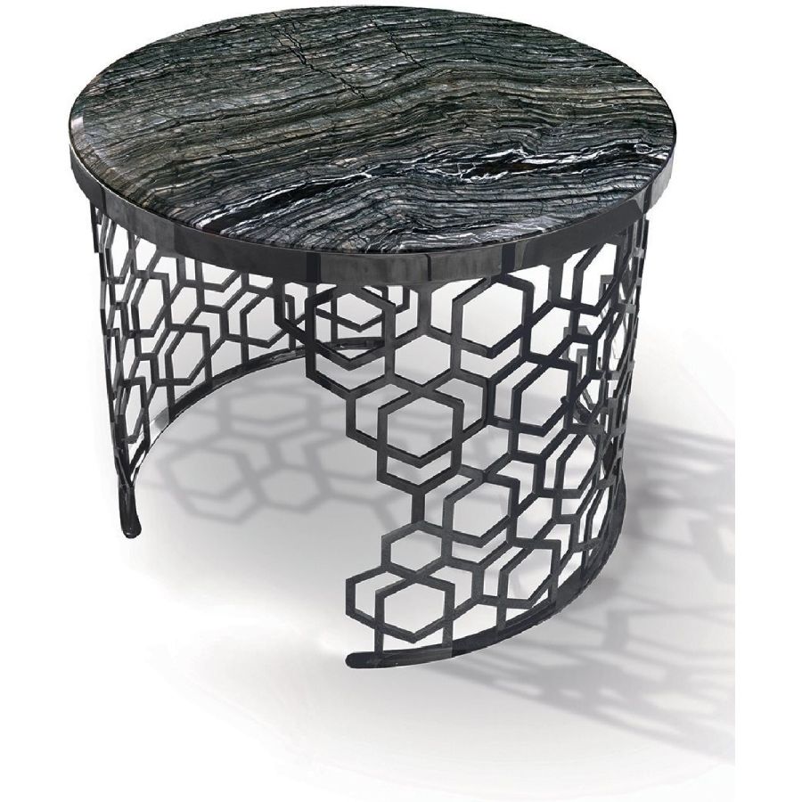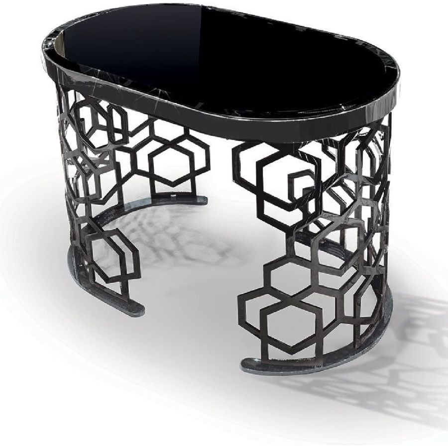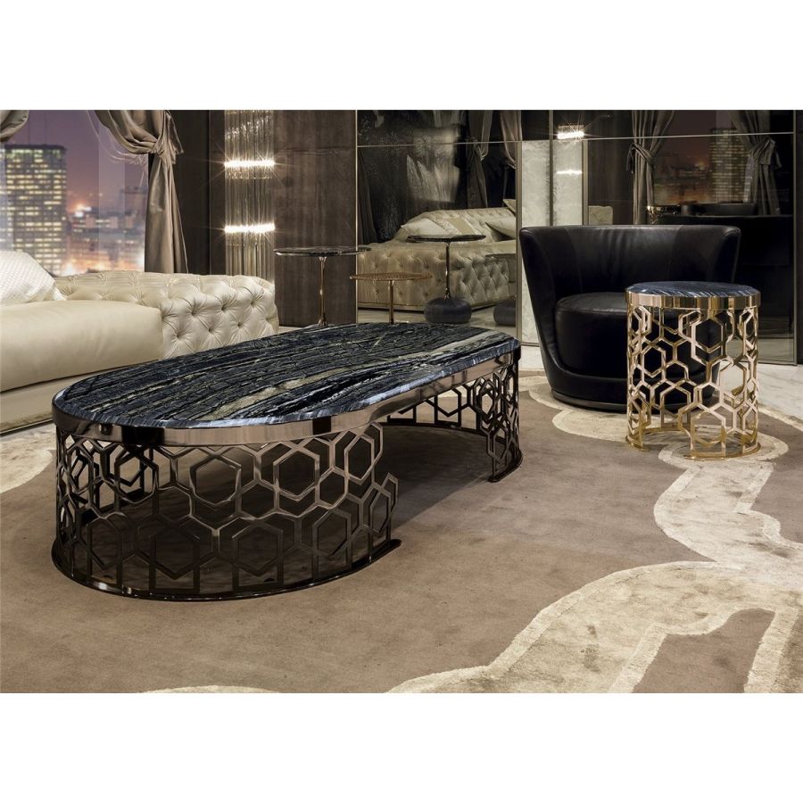 Small table with base formed from ground laser-cut metal with a curved “Sequence” decoration. Structure finish: Satin nickel, bright shaded brown, Black Rose gold, bright light gold, matt Champagne gold, bright chrome, bright black chrome, matt satin bronze, bright pink gold, matt pink gold. Top finish: White Carrara marble, Imperial Brown marble, Sahara Noir marble (glossy and matt polyester finish), Dover White marble, Panda White marble, Guatemala Green marble, Corteccia marble, Port Saint Laurent marble, Red Levanto marble, Bardiglio Nuvolato marble, Elegant Brown marble, Shale Rosewood marble, Emperador Dark marble, Silver Wave marble, Agatha Black marble, Frappuccino marble, Calacatta marble, Fusion Light marble, Patagonia marble, Explosion Blue marble, Fusion Multicolor marble, Juliet Quartz marble, Calcite Azul marble, Azul Macauba marble, Portoro marble.