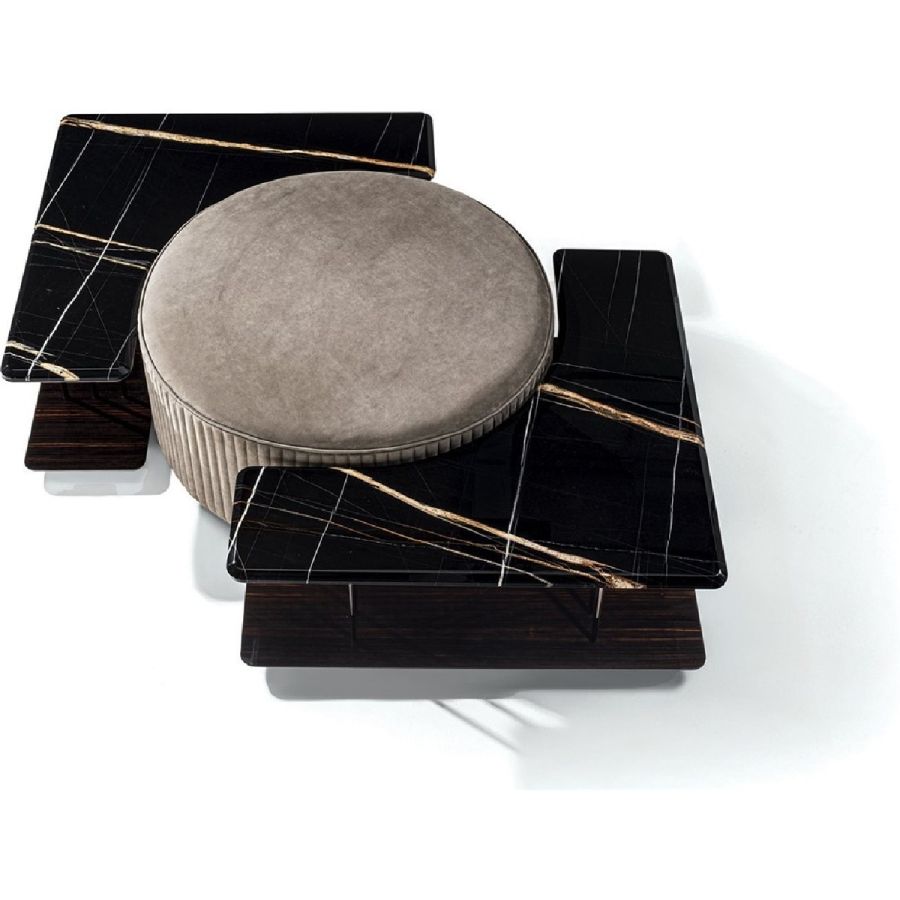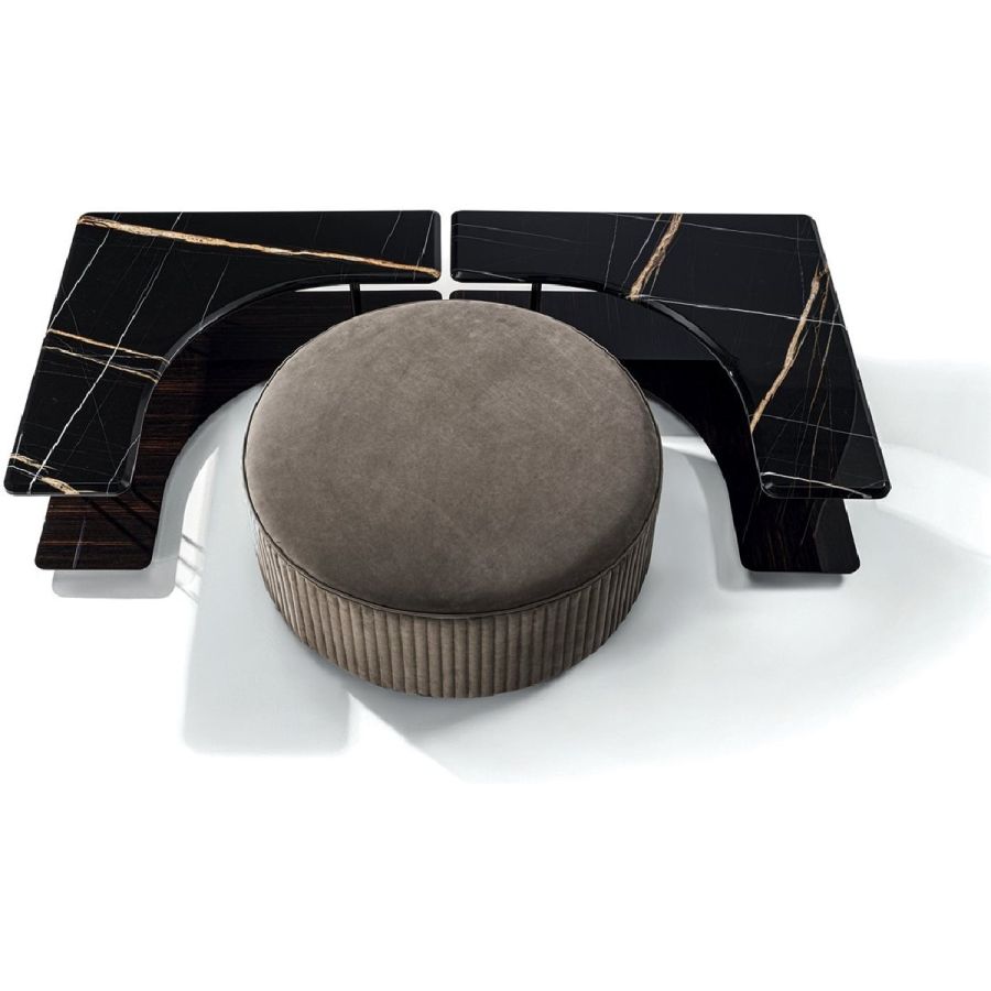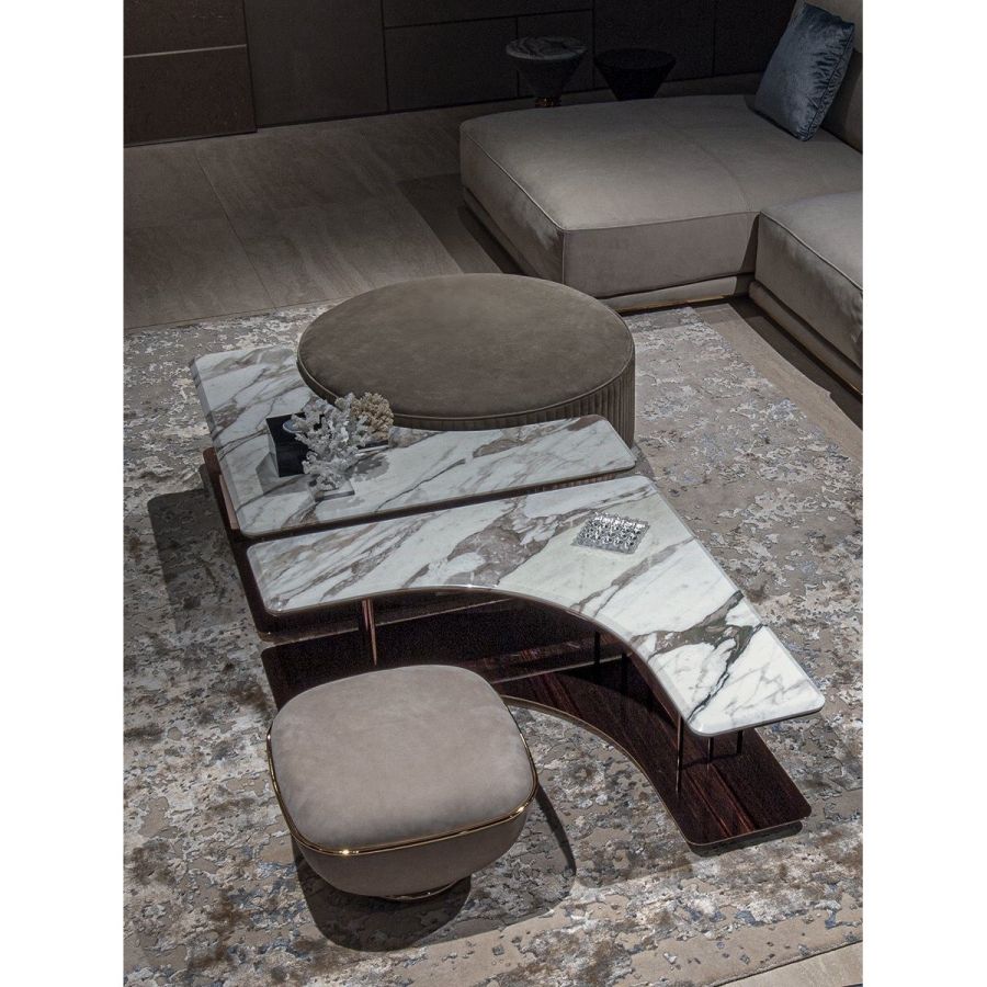 Small table with 50 cm radius concave compartment to accommodate a pouf or other accessories. The surface at the base is in wood: glossy/matt Maple, glossy/matt heat-treated Eucalyptus, glossy/matt ebony, Canaletto walnut stained glossy/matt Macadamia, glossy/matt Sycamore frisè, glossy lacquered wood in range colours. The top surface is the finishes: bronze or smoky mirror 5 mm with bevel. 20mm marble with20mm bevel: White Carrara marble, Imperial Brown marble, Sahara Noir marble (glossy and matt polyester finish), Dover White marble, Panda White marble, Guatemala Green marble, Corteccia marble, Port Saint Laurent marble, Red Levanto marble, Bardiglio Nuvolato marble, Elegant Brown marble, Shale Rosewood marble, Emperador Dark marble, Silver Wave marble, Agatha Black marble, Frappuccino marble, Calacatta marble, Fusion Light marble, Patagonia marble, Explosion Blue marble, Fusion Multicolor marble, Juliet Quartz marble, Azul Macauba marble, Red onyx, Ivory onyx, white onyx. The top is supported by columns Ø 14 mm in metal in the finishes: Satin nickel, bright shaded brown, Black Rose gold, bright light gold, matt Champagne gold, bright chrome, bright black chrome, matt satin bronze, bright pink gold, matt pink gold.
