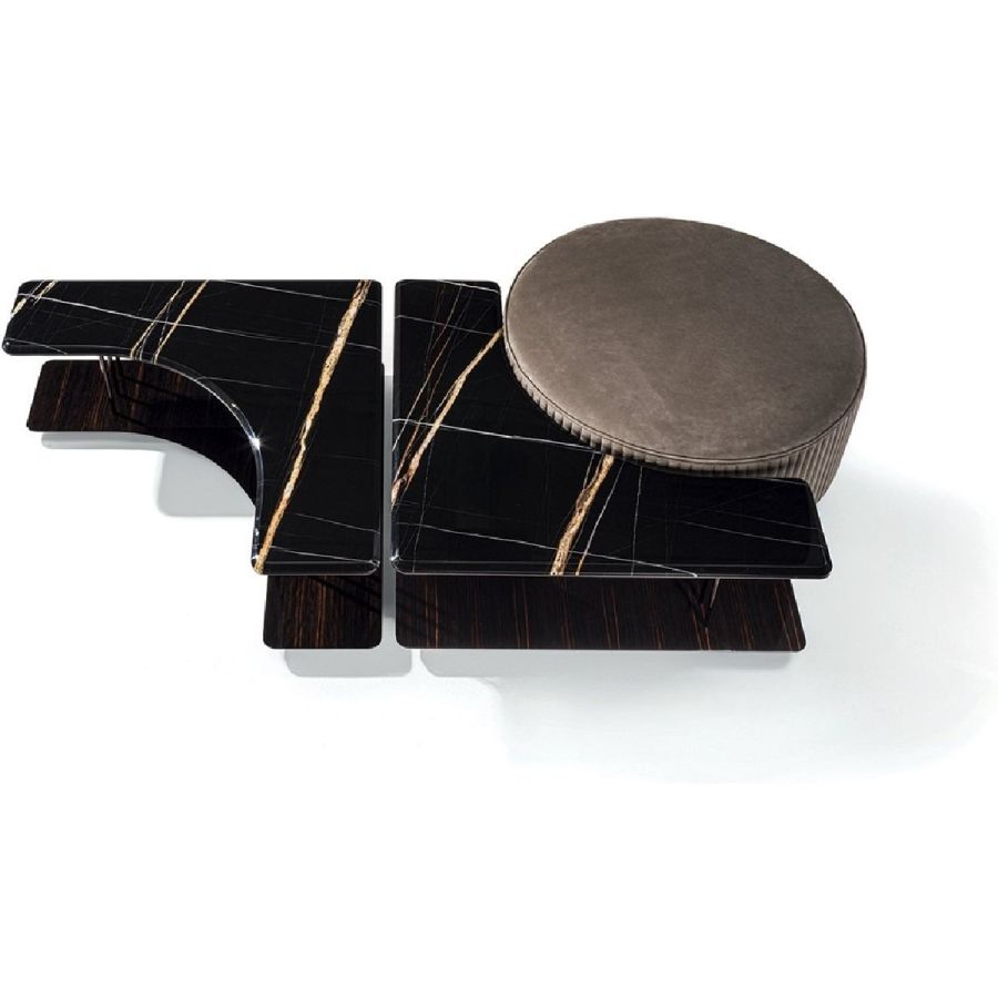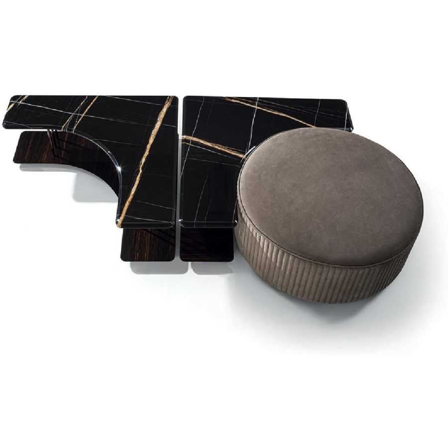The Saturn coffee tables are conceived as single pieces of furniture- as end tables for sofas - which can be combined with one another, to be used independently or paired with the Felix ottoman, creating interesting contrasts between soft and rigid materials and thus lending a dynamic quality to the various arrangements.