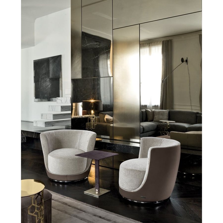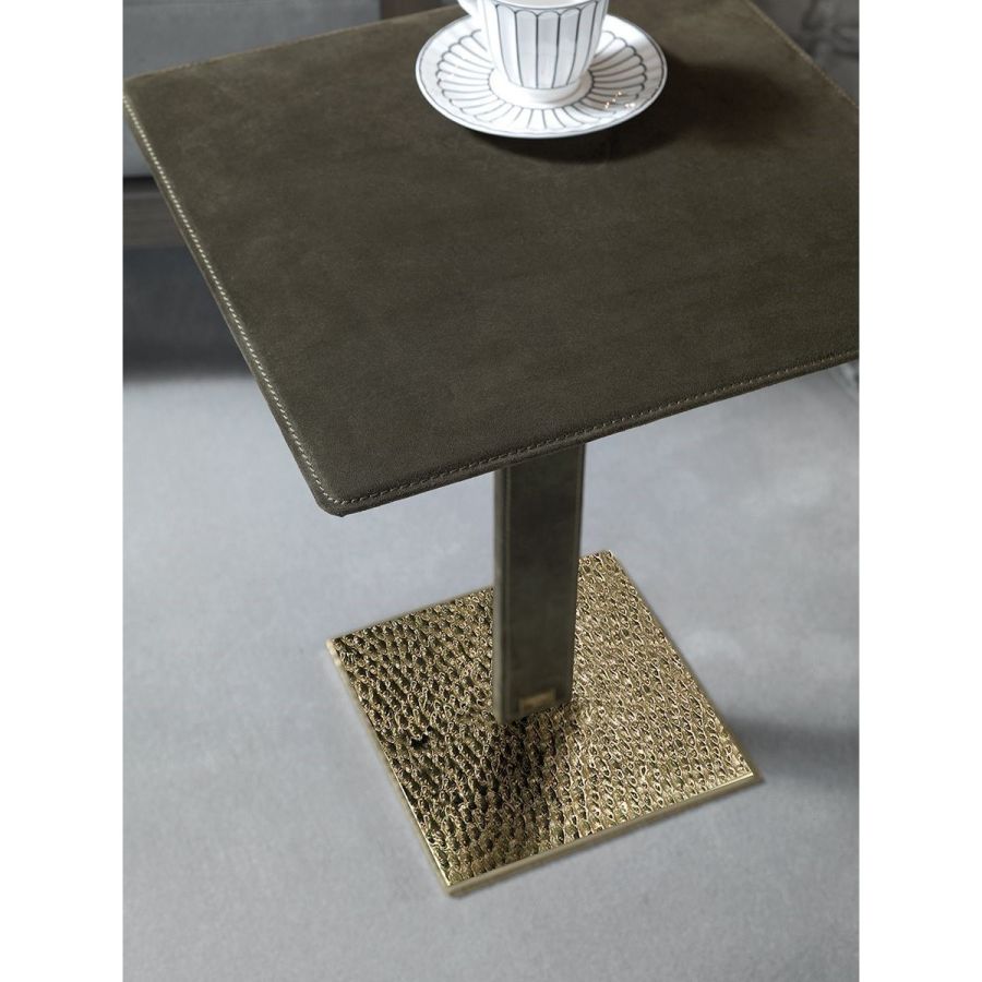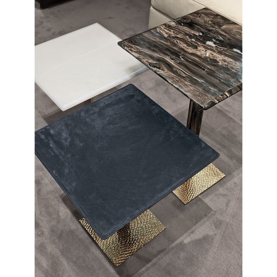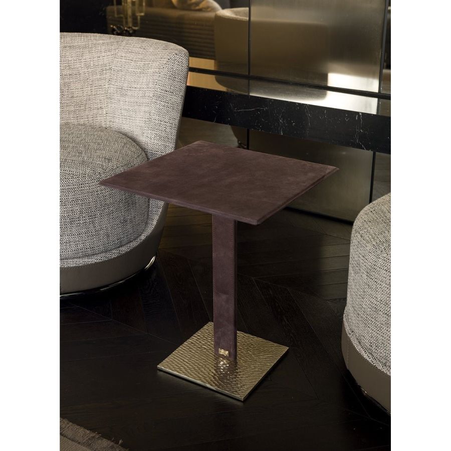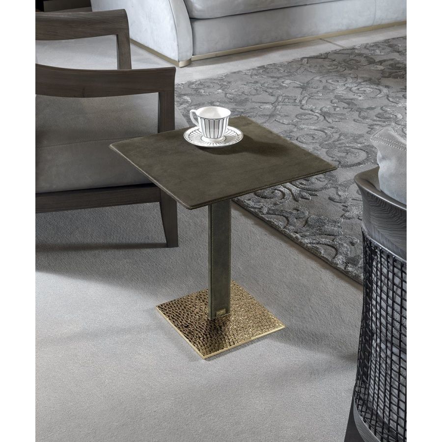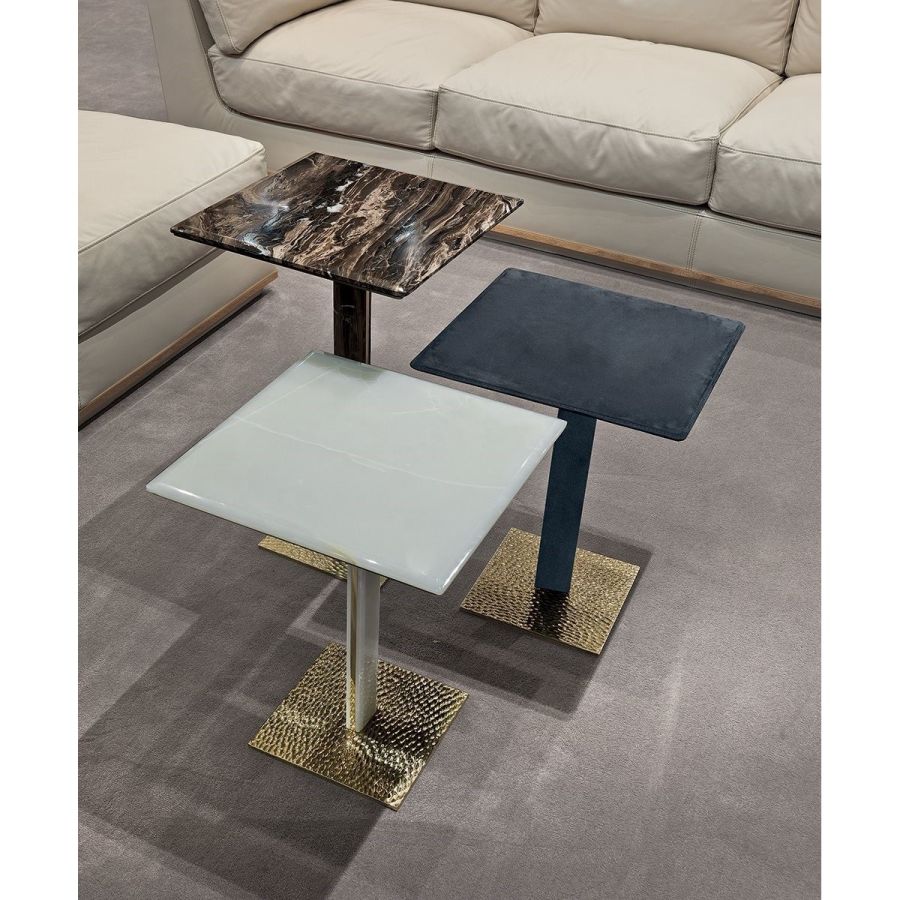 Square small service tables, functional because they are easy to move when needed, and precious because of the materials used to make them. They are an accessory that enhances the linear look of the sofa. The cast brass base is hand engraved, the tops and column are in marble or covered in Nabuck leather or suede.