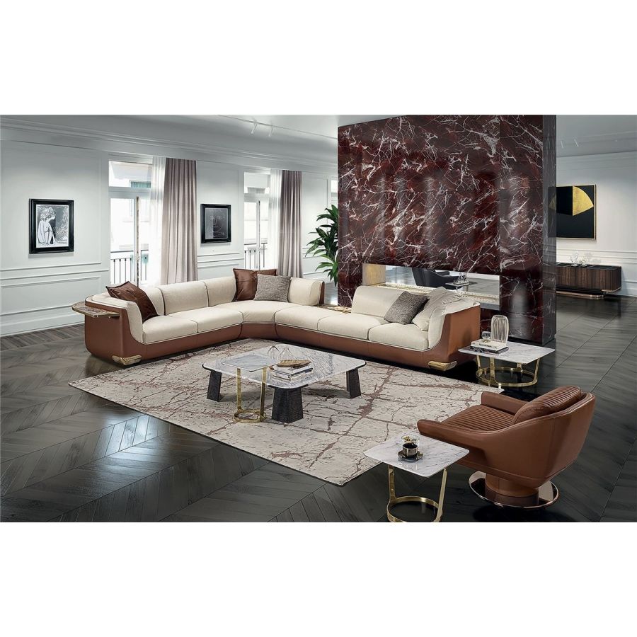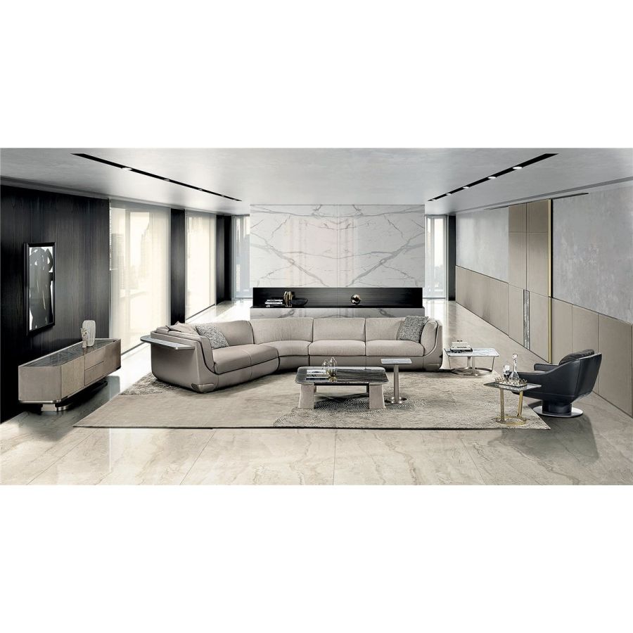 Wood frame with high-resistance elastic bands, covered in multi-thickness polyurethane foam. The seat cushions are in medium/firm multi-thickness polyurethane foam, with a final layer in Memory Foam, covered in 100% polyester fibre bonded with cotton blend cloth. The backrest cushions are in medium/soft multi-thickness polyurethane foam covered in sterilized goose down. A characteristic metal “shell” insert is at the base of each armrest, available in the finishes: Satin nickel,Bright shaded brown, Black Rose gold, bright light gold, matt Champagne gold, bright chrome, bright black chrome, matt satin bronze, bright pink gold, matt pink gold. As a supplement, a metal utility shelf (coordinated with the insert on the base) is available with a shaped marble or bronze or smoky mirror top. Given the special manufacturing process, the structure upholstery in leather or fabric/velvet is NOT removable, but the seat cushion upholstery can be removed easily.
