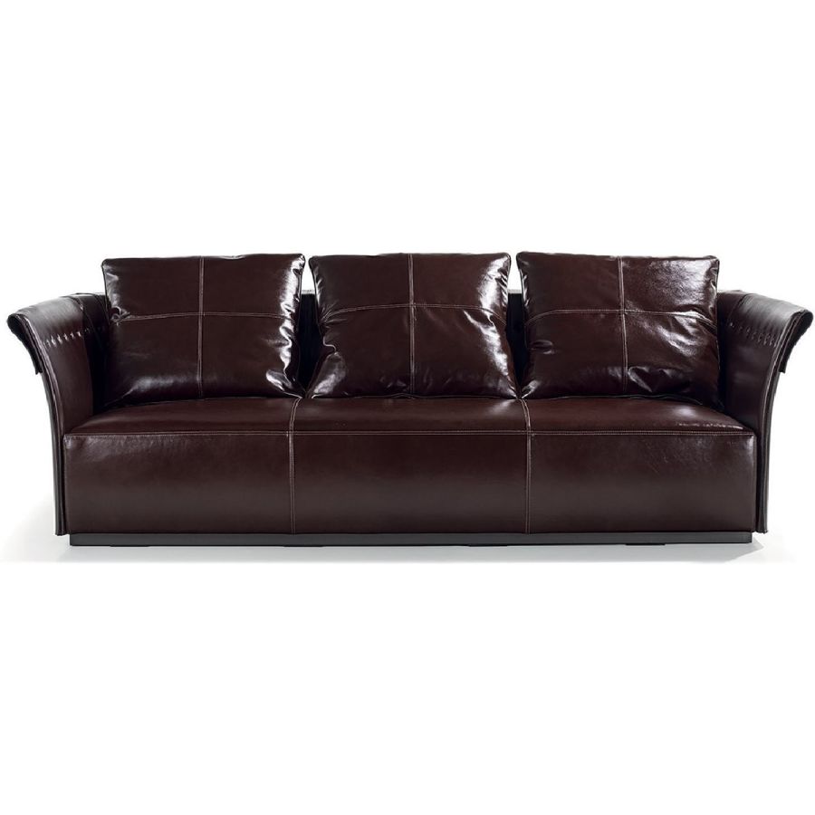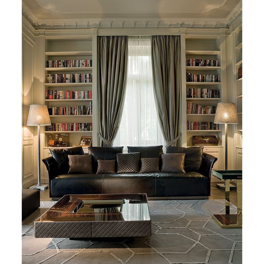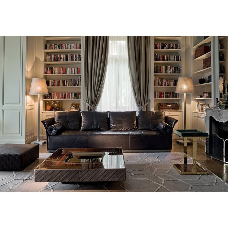 Iron armrest frame with moulded polyurethane foam. Wood backrest frame covered in double density polyurethane foam. Wood seat with elastic bands covered in triple density polyurethane foam with upper layer of Memory Foam to guarantee comfort and resistance to crushing. The entire sofa is covered with a soft quilted cover of sterilised goose down. Given the particular upholstery process, the backrest and armrest structures are only available with leather upholstery finished with plain coloured buttons or Swarovski crystal buttons. The seat and backrest cushions can be either in leather or fabric. Base in painted, oven cured metal in bronze or black. Given the particular process, the frame and seat covers - both in leather and fabric - are not removable, but backrest cushion covers are.