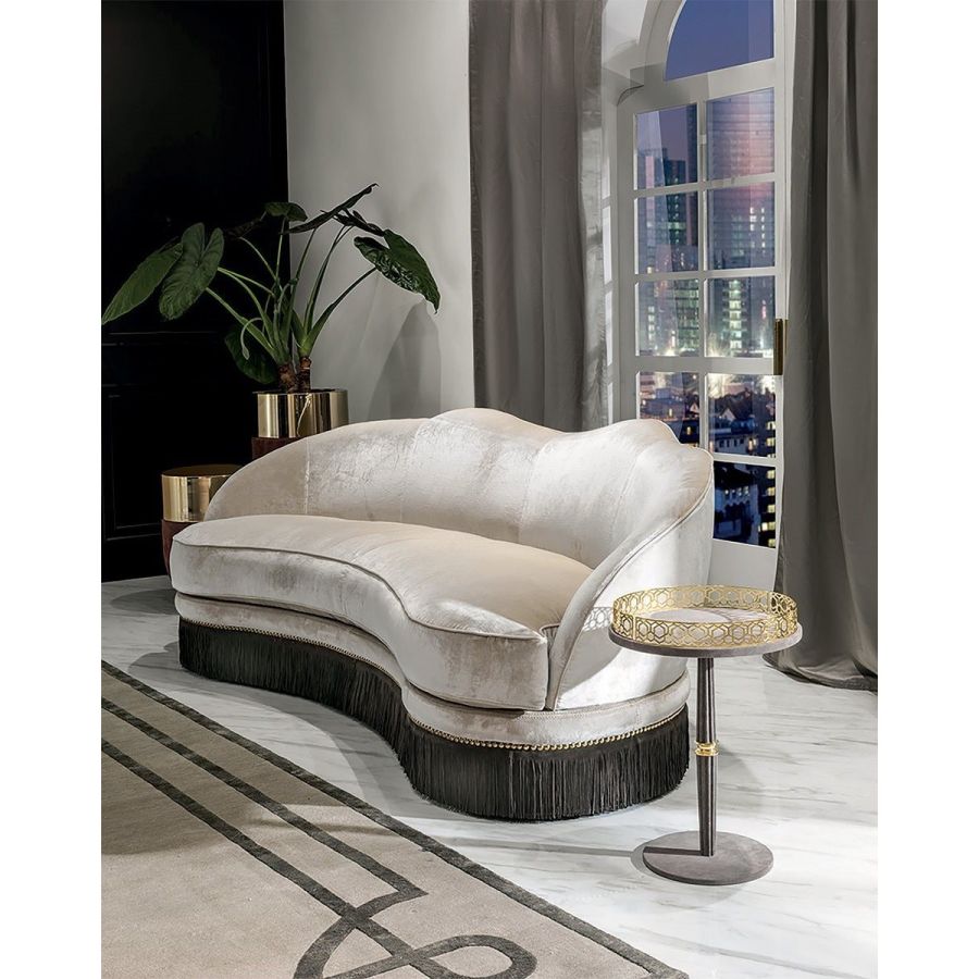 Daisy emerges from the desire to create a small formal sofa that can feel at home in a freer style dictated by curved lines. A characterising not is the row of close-set buttons on the base with neo-classical style suede fringes.