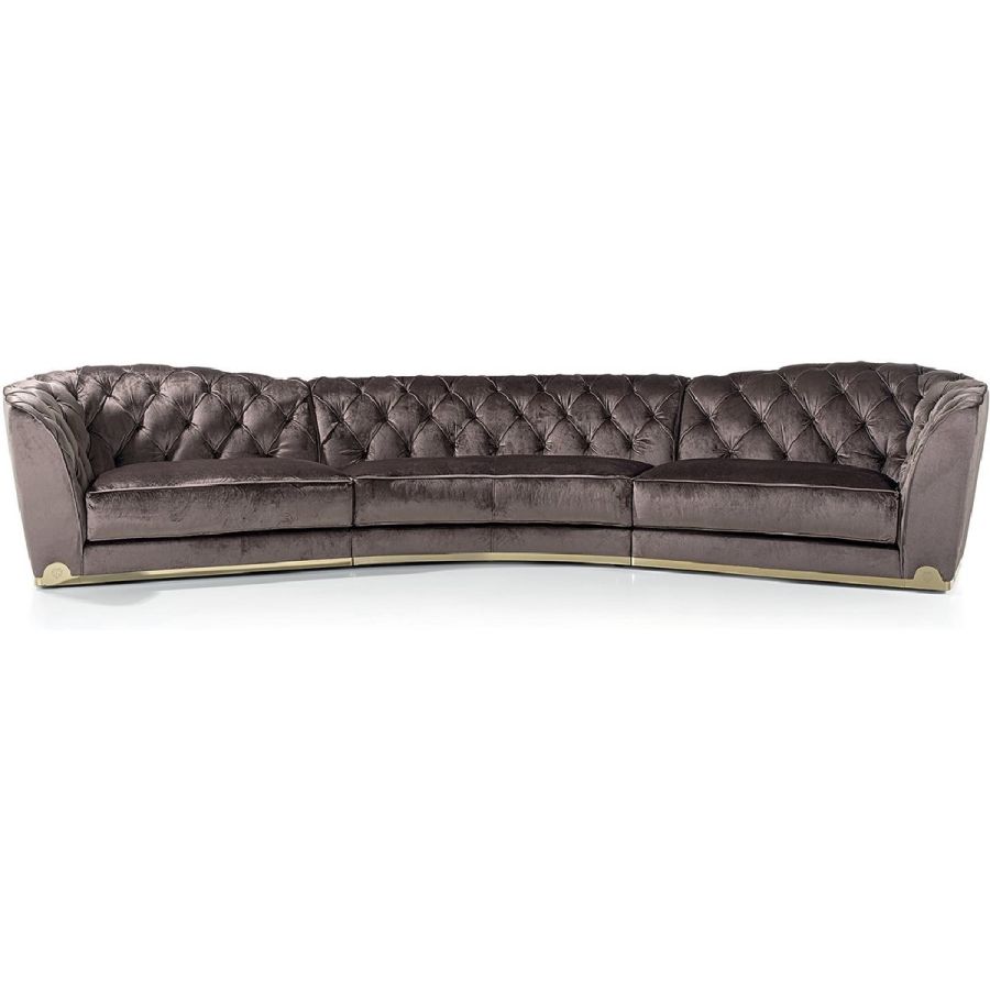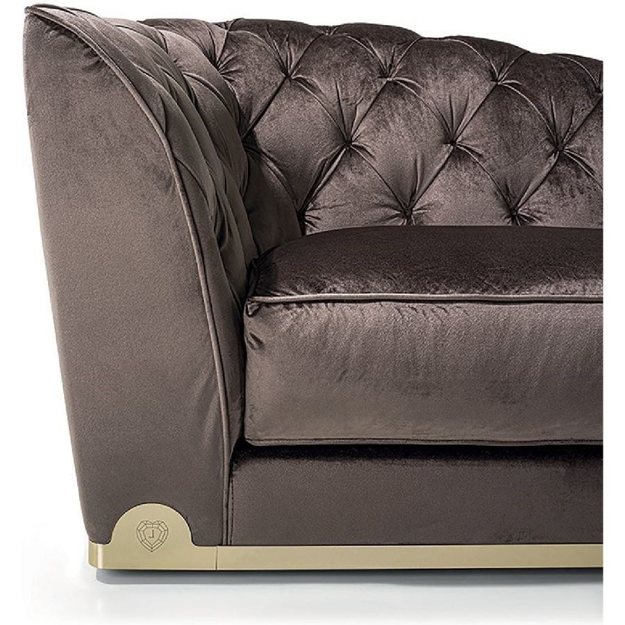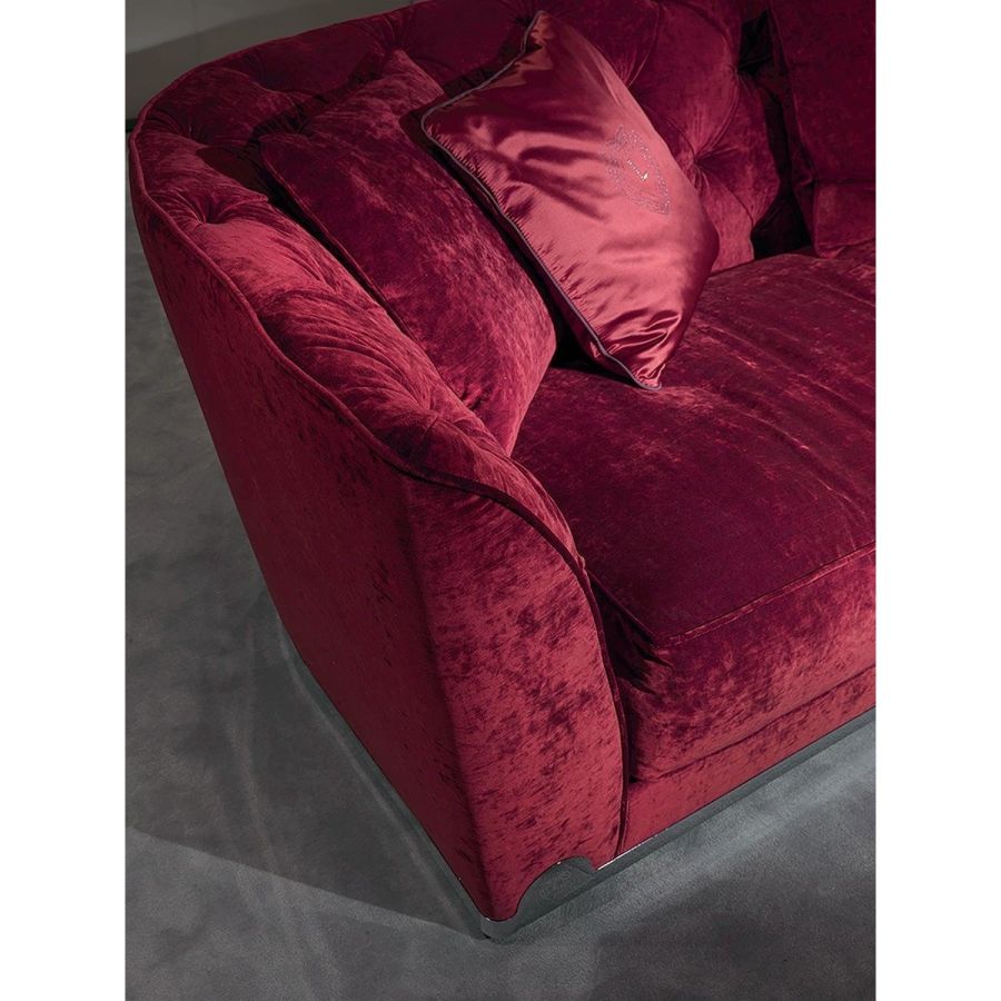 Frame in wood with elastic bands, covered in multi-thickness polyurethane foam. Seat cushion in sterilised goose down with insert in multi-thickness polyurethane foam and reinforcements in “Visco Soft”, a particular soft, durable padding. The internal backrest is finished in a “Capitonné” pattern, with buttons in the same colour as the upholstery or with “Swarovski” crystals. The sofa edging can be in finely finished braided leather. Fabric and leather frame covers are not removable because of the particular manufacturing process. At the base of the sofa, there is a metal border with laser logo in the finishes: Satin nickel, bright shaded brown, bright light gold, matt Champagne gold, bright chrome, bright black chrome, matt satin bronze, bright pink gold, matt pink gold, Black Rose gold. Sofa with reduced depth (90 cm).