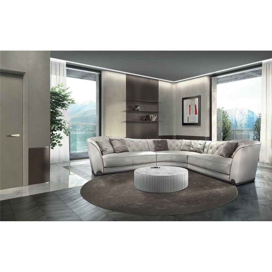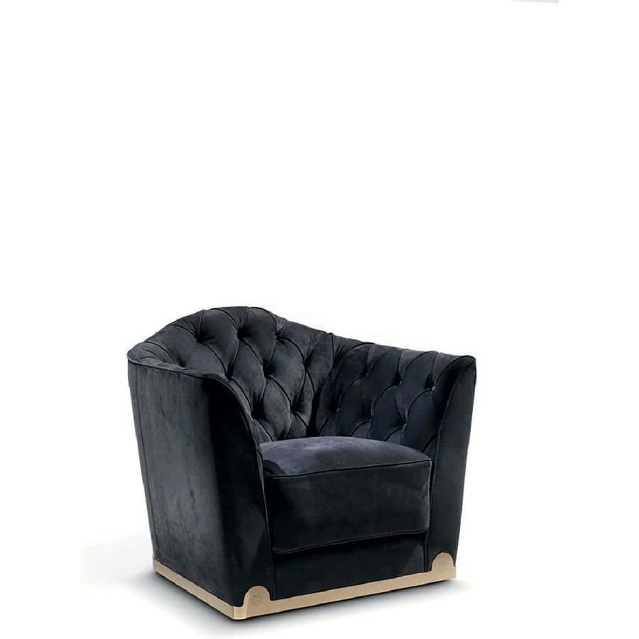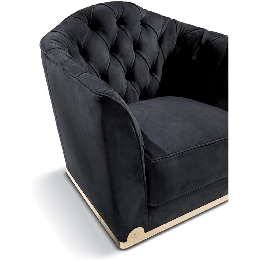 A collection of sofas that has an unequalled backrest with a “wavy” Capitonné tufted upholstery. This takes the form of a fan at the height of the slightly widened armrests. In sober classic taste, Grace also includes a small armchair to set beside the sofa. The base padding is rather firm, but can be softened by a series of goose down-filled cushions that make the sofa more comfortable. The profiles are enhanced by leather edging and the base, in metal, is a hallmark of Loveluxe: an unmistakable sign of a handcrafted product 100% Made in Italy.