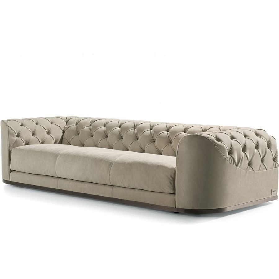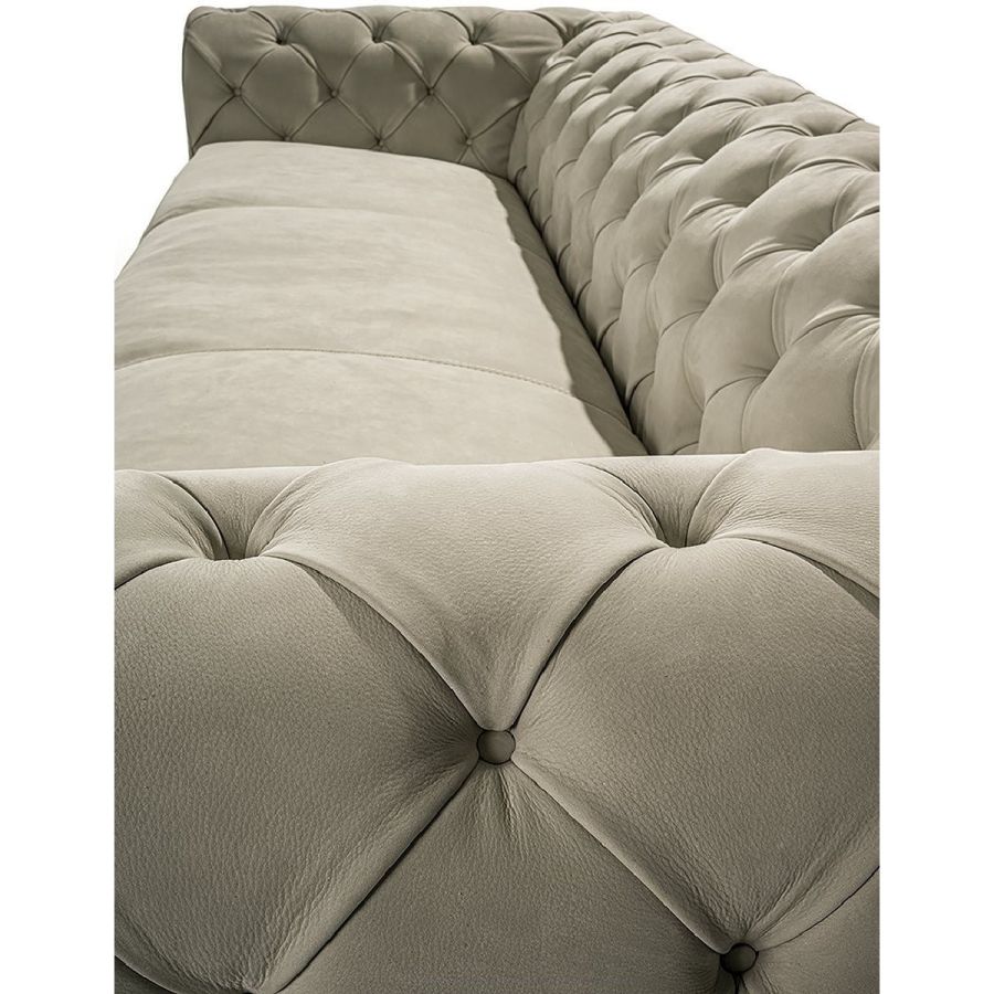 Frame in wood with elastic bands, covered in high density polyurethane foam. The backrest and part of the armrest is finished with tufted “Capitonné” handcrafted upholstery with plain coloured buttons or Swarovski crystal buttons. The seat cushion is covered in smooth triple density polyurethane foam, with a soft quilted cover in sterilised goose down. At the base of the sofa, there is a metal border in the finishes: Satin nickel, bright shaded brown, bright light gold, matt Champagne gold, bright chrome, bright black chrome, matt satin bronze, bright pink gold, matt pink gold, Black Rose gold. Given the particular process, the leather or fabric cover of the frame is not removable, but the seat cushion cover can be removed.