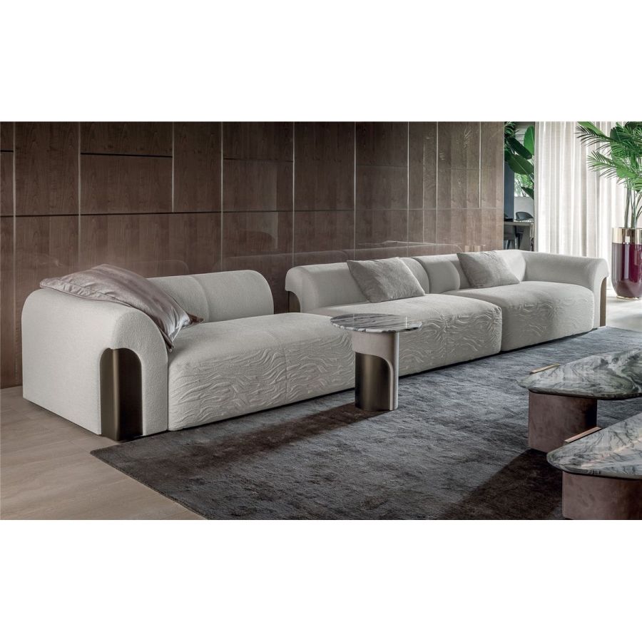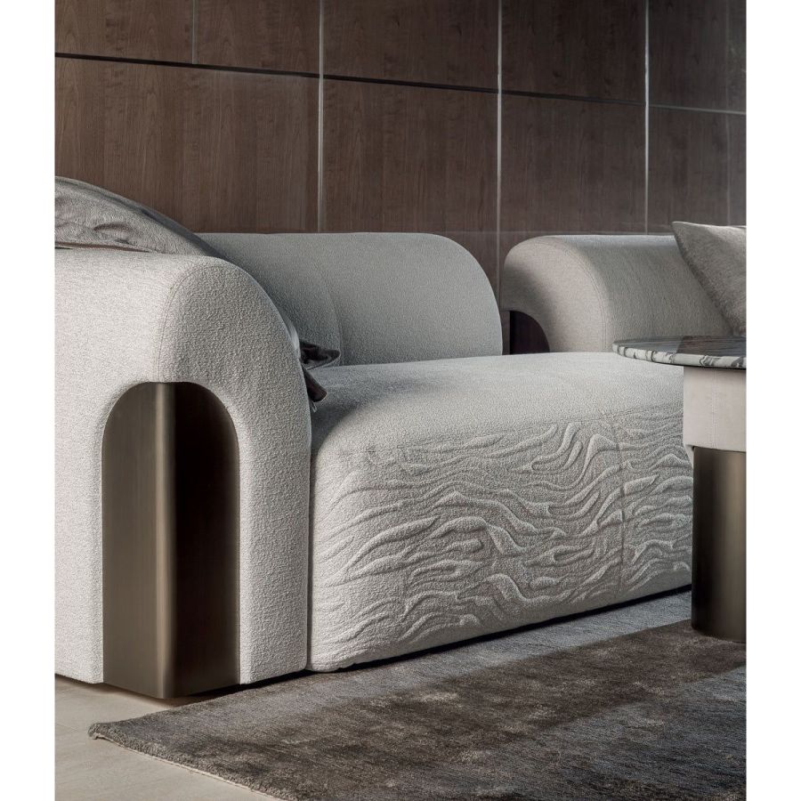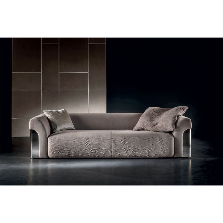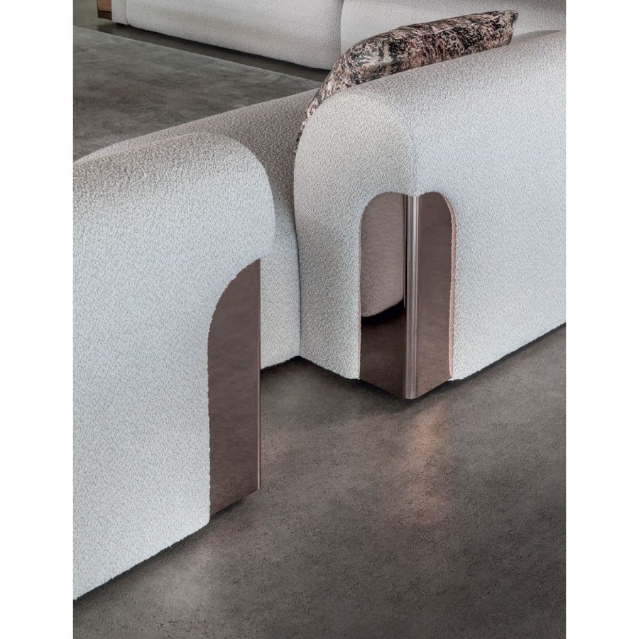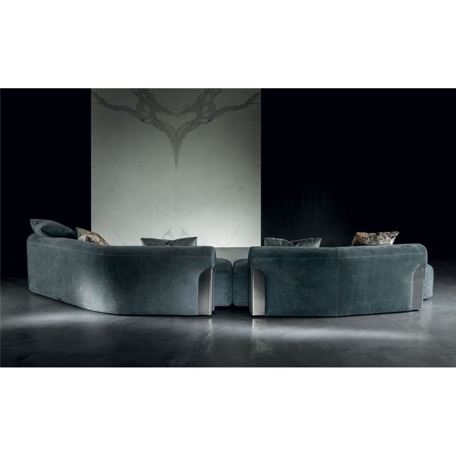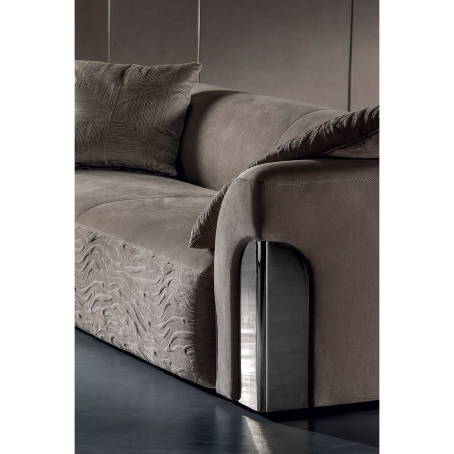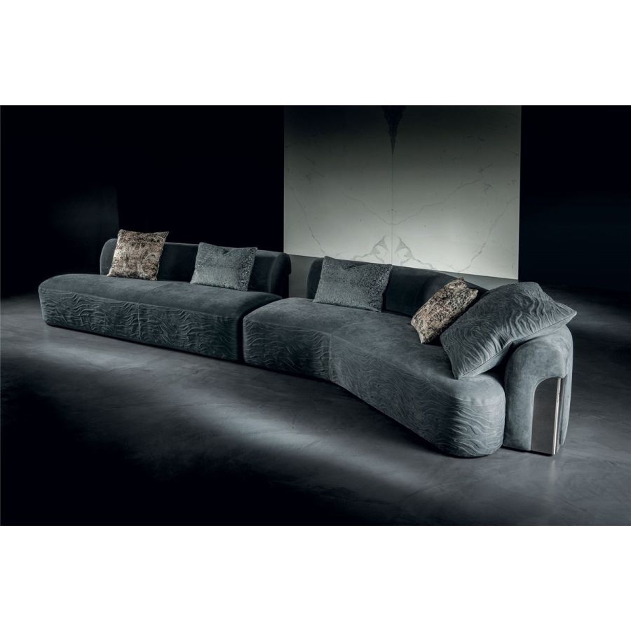 Sofa made up of elements with simple lines, ideal for linear or semiangular compositions. The open armrests and backrests have a chromed metal plate set into them, which enhances the curves in the various elements. This plate comes in the finishes: Shaded copper, Bright shaded brown, Black Rose gold, bright light gold, Champagne gold, bright chrome, bright black chrome, matt satined bronze. Comfort is a major priority for this piece. Special polyurethane foams were mixed together to provide softness, resilience, and crush resistance. The seats are supported at the base by special elastic PVC slats, in turn supported by a solid wooden structure. The most significant characteristic is an exclusive quilted “Groove” decoration that, on request, can decorate the front part of the various elements. Made by hand, it gives the product a three-dimensional effect and accents its exclusive originality. A series of decorative cushions in various sizes and finishes complete the collection. Given the particular assembly of the product, the upholstery is NOT removable.
