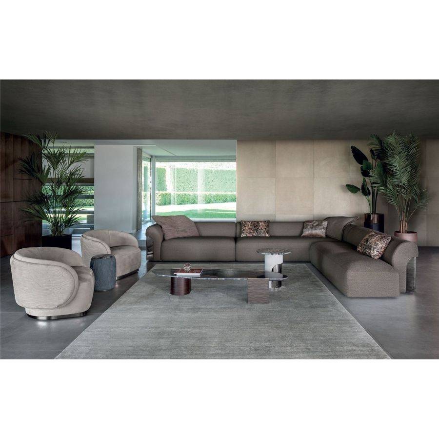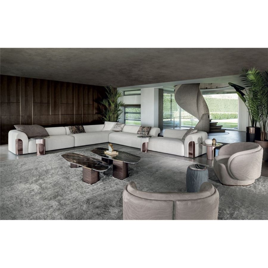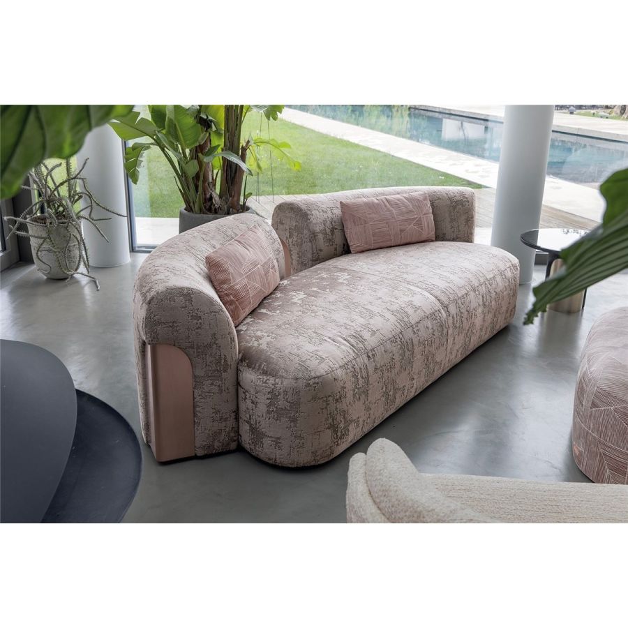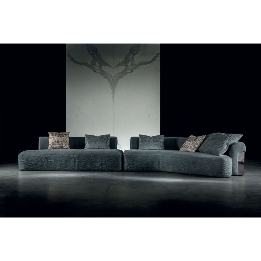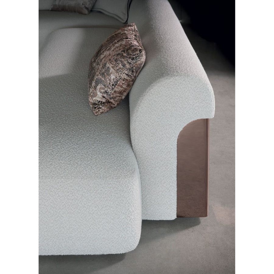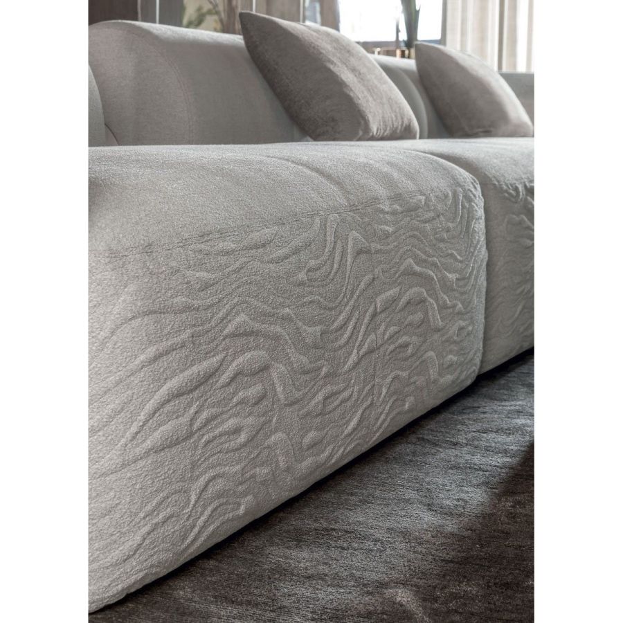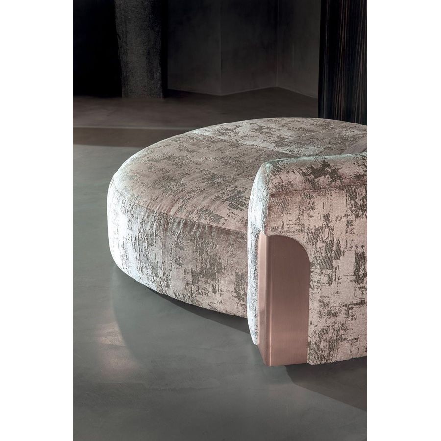 Sofa made up of elements with simple lines, ideal for linear or semiangular compositions. The open armrests and backrests have a chromed metal plate set into them, which enhances the curves in the various elements. This plate comes in the finishes: Shaded copper, Bright shaded brown, Black Rose gold, bright light gold, Champagne gold, bright chrome, bright black chrome, matt satined bronze. Comfort is a major priority for this piece. Special polyurethane foams were mixed together to provide softness, resilience, and crush resistance. The seats are supported at the base by special elastic PVC slats, in turn supported by a solid wooden structure. The most significant characteristic is an exclusive quilted “Groove” decoration that, on request, can decorate the front part of the various elements. Made by hand, it gives the product a three-dimensional effect and accents its exclusive originality. A series of decorative cushions in various sizes and finishes complete the collection. Given the particular assembly of the product, the upholstery is NOT removable.