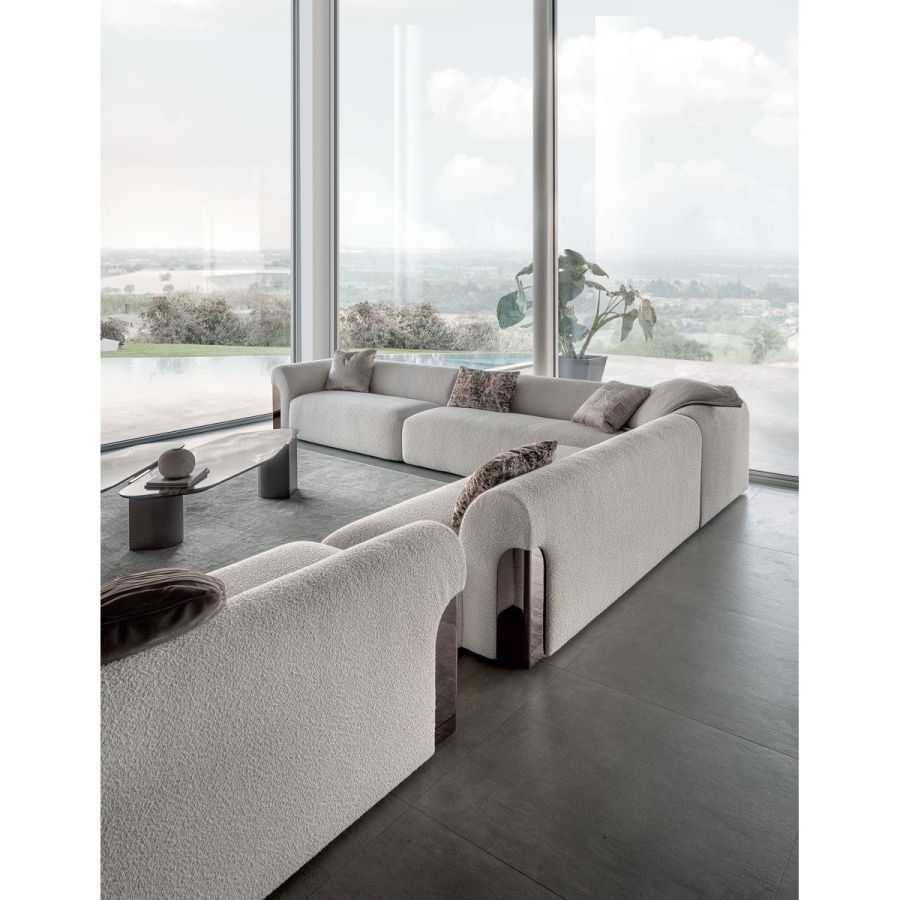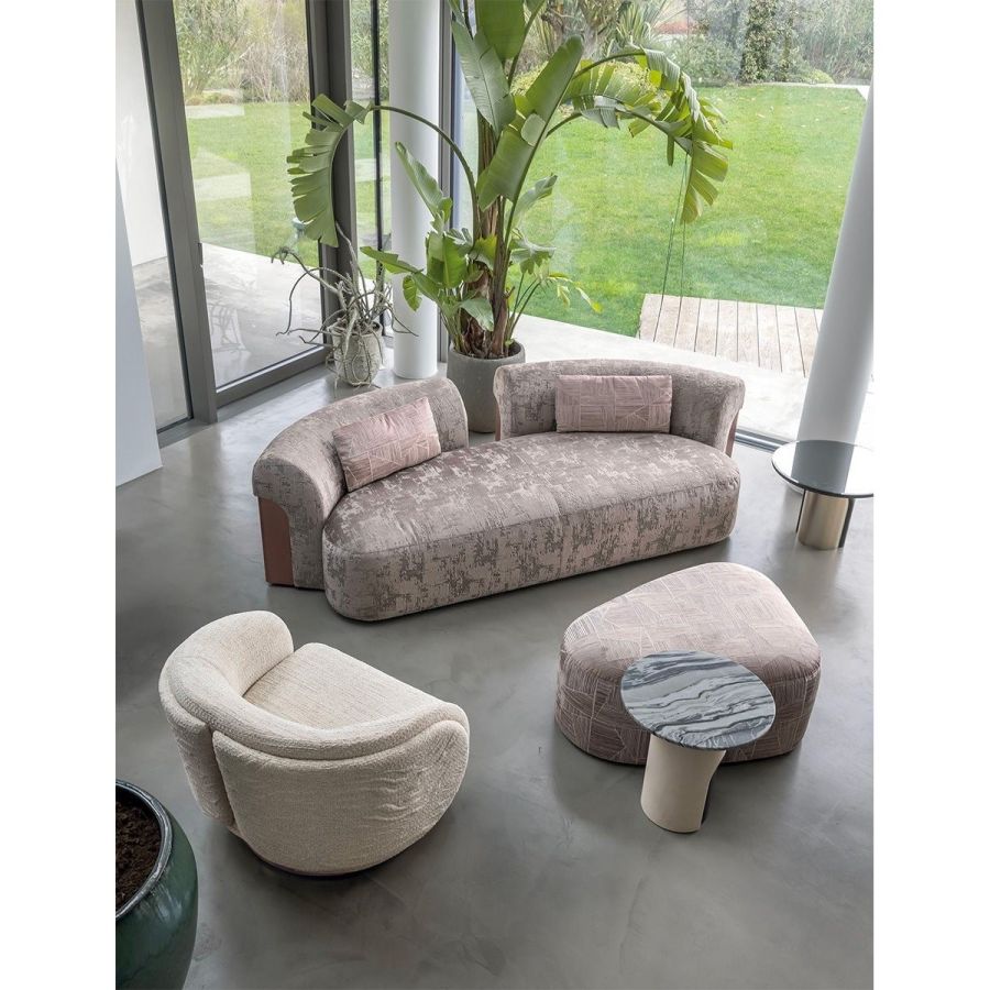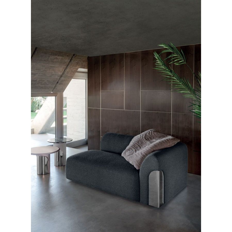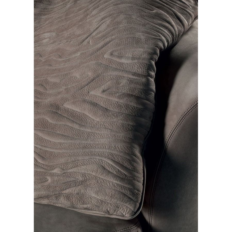 A sofa with a sinuous shape that recalls the female body. Made up of a number of elements, it guarantees maximum design freedom. The metal sheet set into the armrest lends elegance and refinement to the entire composition. Nip is a sofa with a one-piece seat, particularly ergonomic and comfortable thanks to its special padding. The front stripe can be featured by “Groove” quilting, an original animalier pattern.