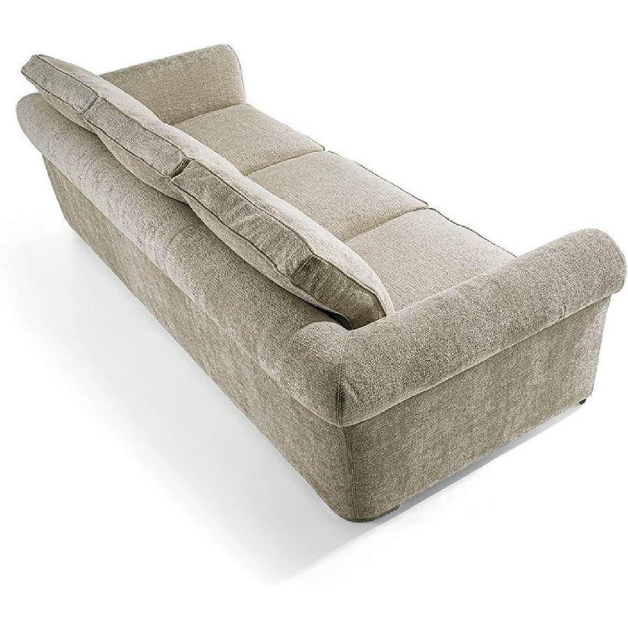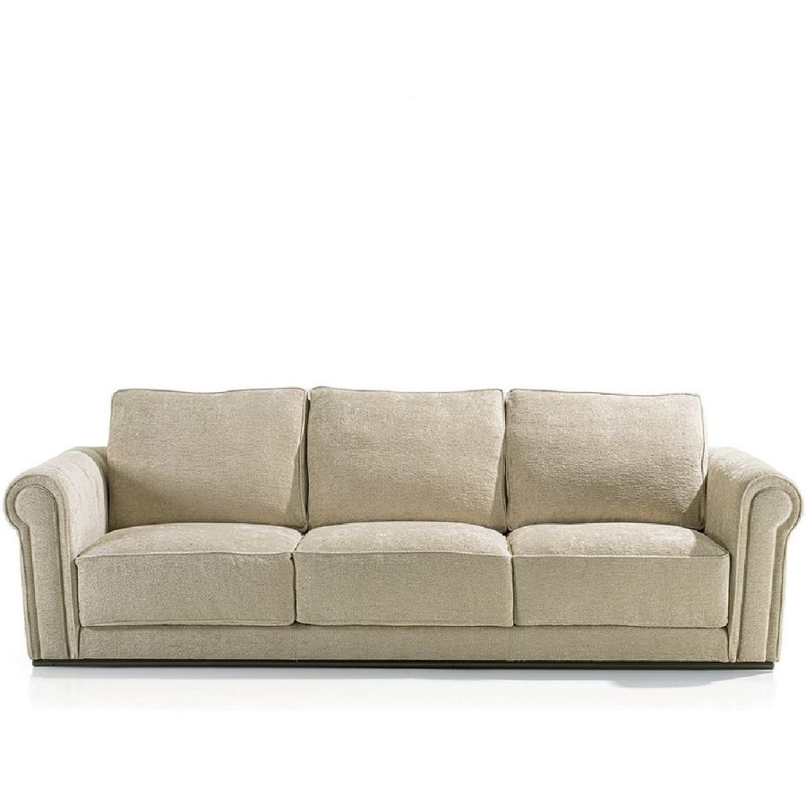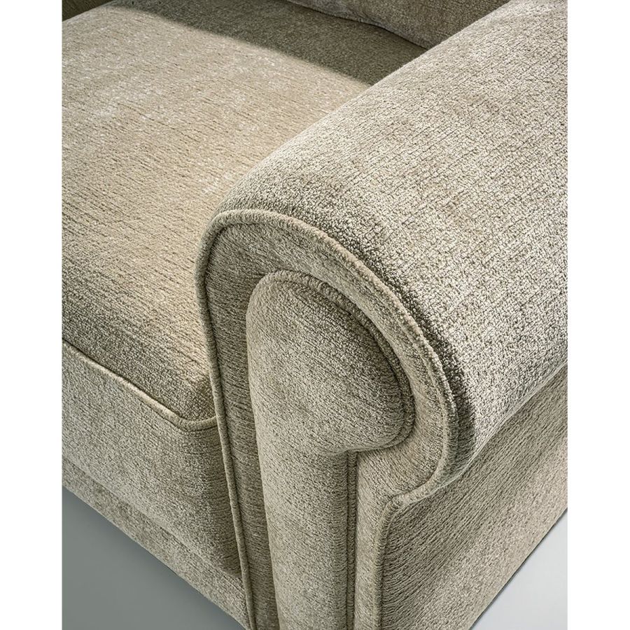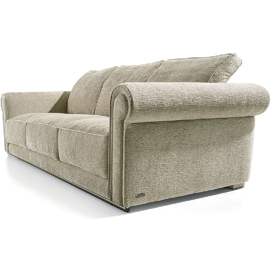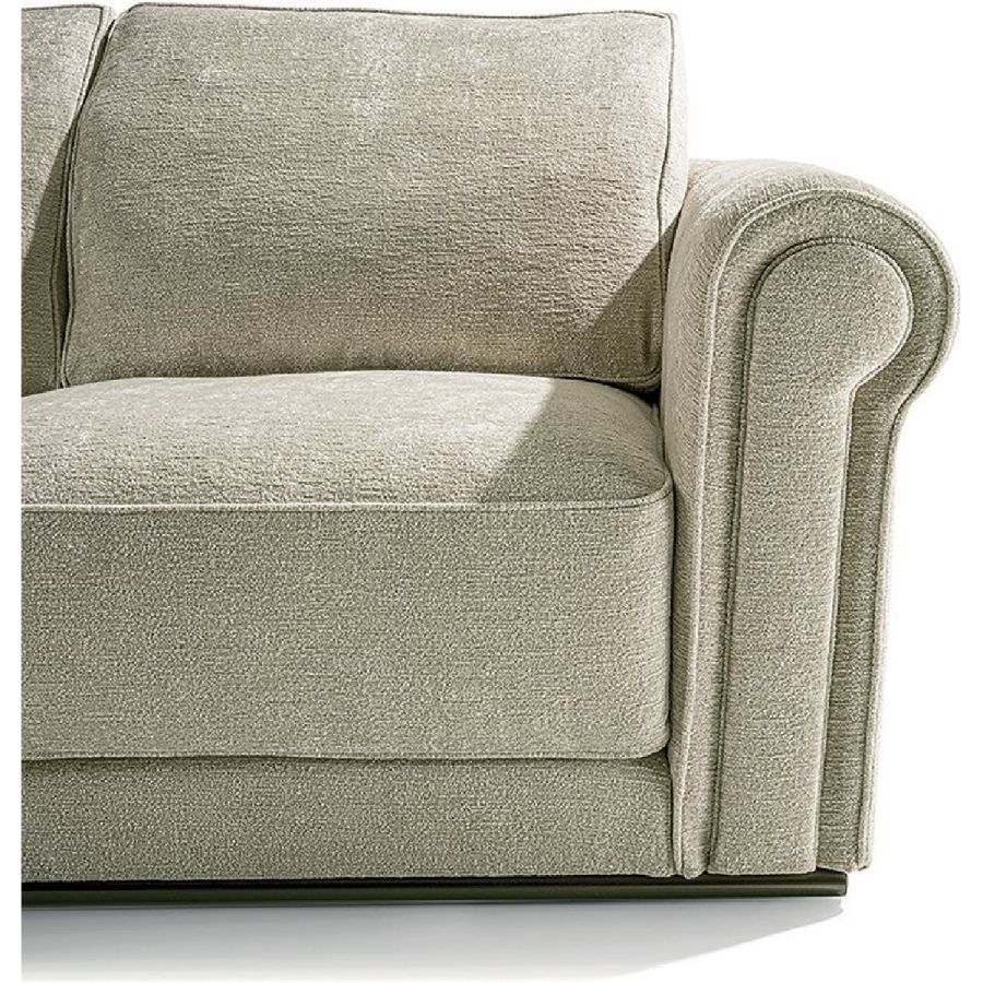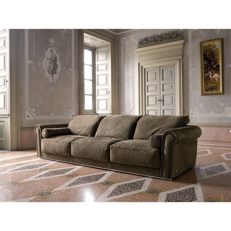 Wooden frame with elastic webbing covered with highdensity polyurethane foam in different thicknesses. Seat cushions of sterilized goose down and insert in polyurethane foam in different thicknesses reinforced with “Visco Soft”, a particular padding which provides better comfort and longer lasting life. Backrest cushions of sterilized goose down with insert in low-density polyurethane foam for greater comfort. Front aluminum base in polished aluminium or painted bronze. Back feet covered in the same material as the upholstery. Given the special processing of the arm, both the leather and fabric upholsteries are not removable on the structure, while cushions covers are removable. Sofa with reduced depth (105 cm).