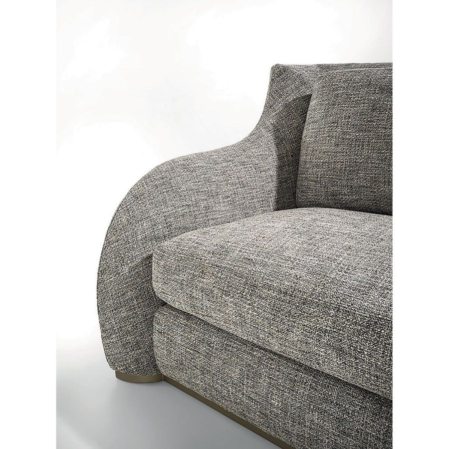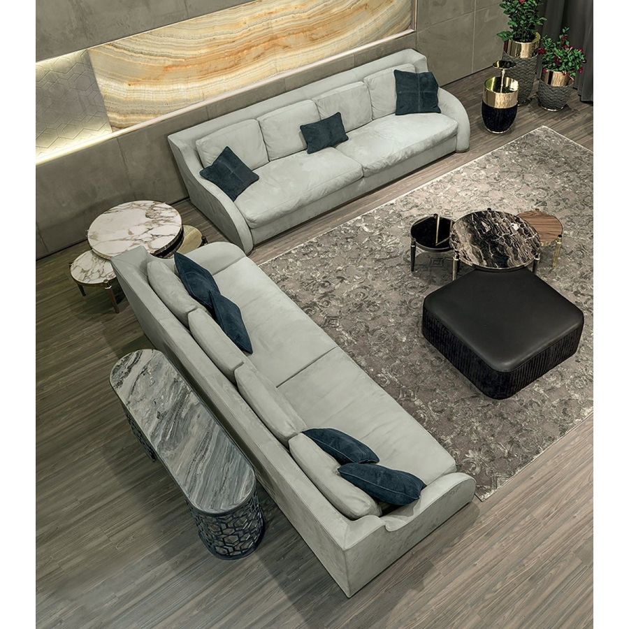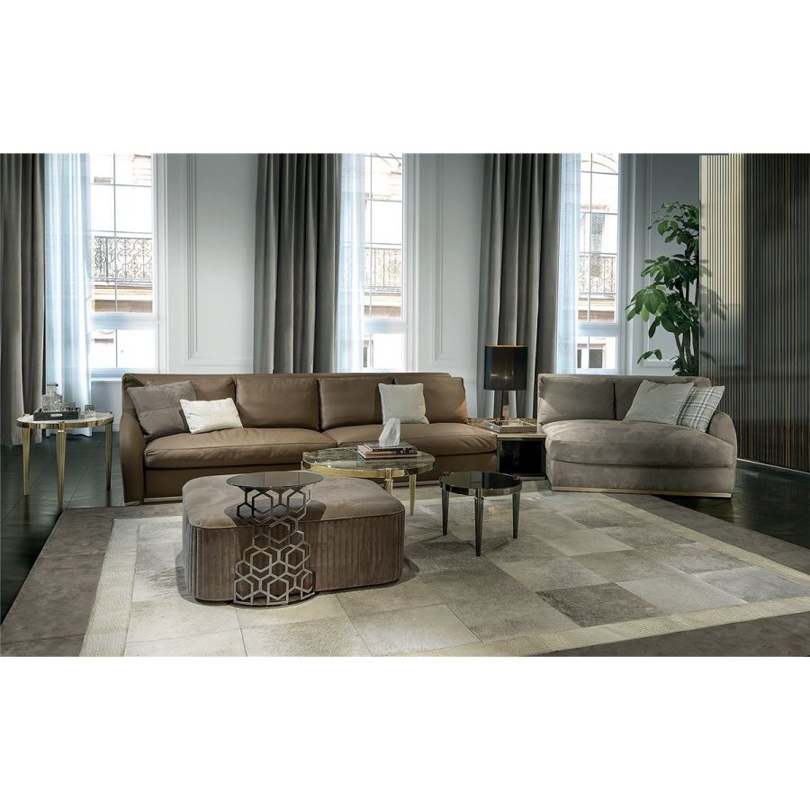 Structure in wood with elastic bands, covered in high density polyurethane foam. Backrest cushions are in sterilised goose down, with insert in medium-density polyurethane foam, and seat cushions are in triple-density polyurethane foam covered in sterilised goose down and supported with Memory Foam padding in order to maintain shape more effectively. The base of the sofa is in chromed metal in the finishes: Satin nickel, bright shaded brown, Black Rose gold, bright light gold, matt Champagne gold, bright chrome, bright black chrome, matt satin bronze, bright pink gold, matt pink gold. The open corner element, which can be used in compositions or as a chaise longue end unit, small divider table in wood, lacquered on the side in range colours, and compartments are finished in wood: glossy/matt heat-treated Eucalyptus, glossy/matt Maple, glossy/matt Sycamore frisè, glossy/matt Ebony, glossy/matt Canaletto Walnut, glossy Walnut Burl Wood. Top in marble and frame in the same metal as the base. Given the special manufacturing process, the structure upholstery is not removable, but the leather or fabric covers of all cushions can be removed.