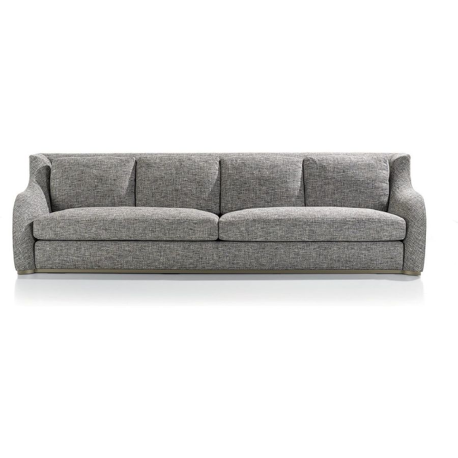 The Rey collection includes sofas, divider elements and different sizes of poufs, generated from a common design concept that translates into a vaguely vintage taste in an absolutely contemporary style. The linear metal base of this modular sofa is flush with the floor. The enveloping backrest descends gradually on the sides to become the armrests and hold the soft seat cushions in goose down. A fan-shaped corner element makes it possible to obtain a curved composition that is suited for large-sized rooms and perfect for furnishing lounges and waiting rooms.