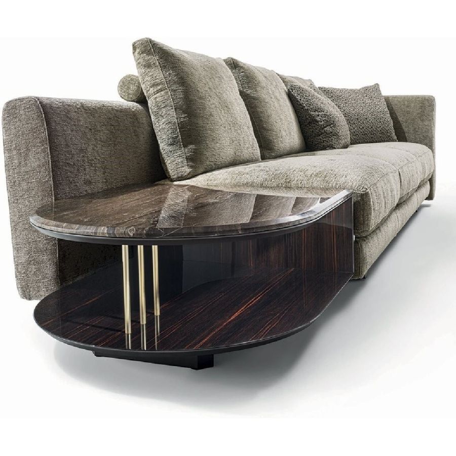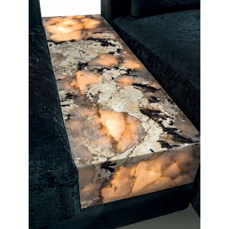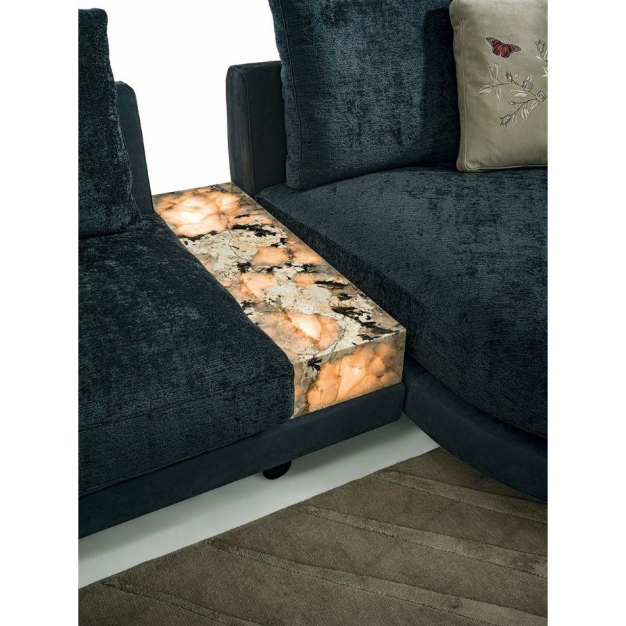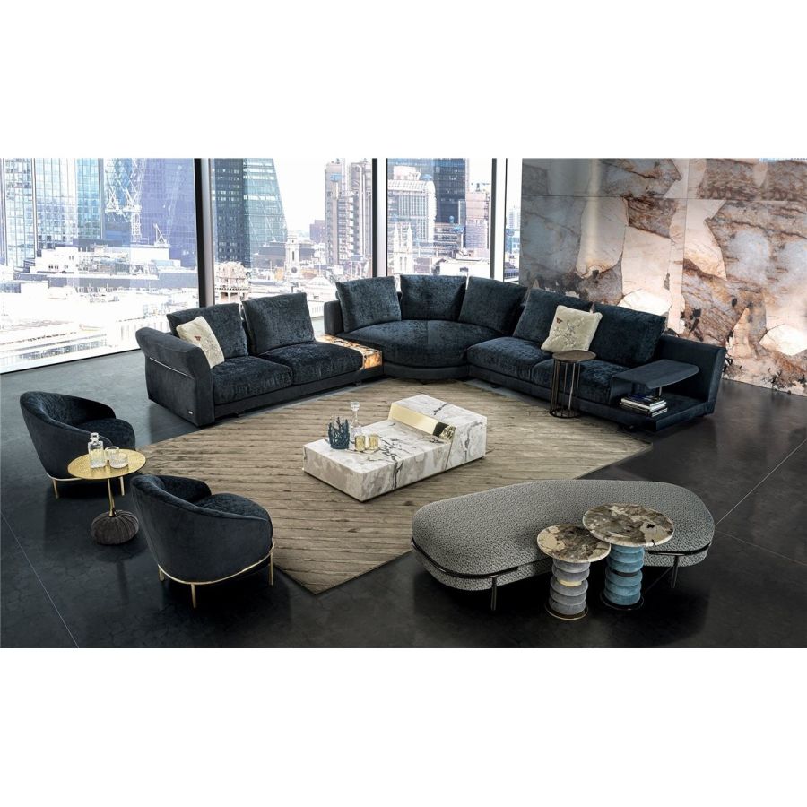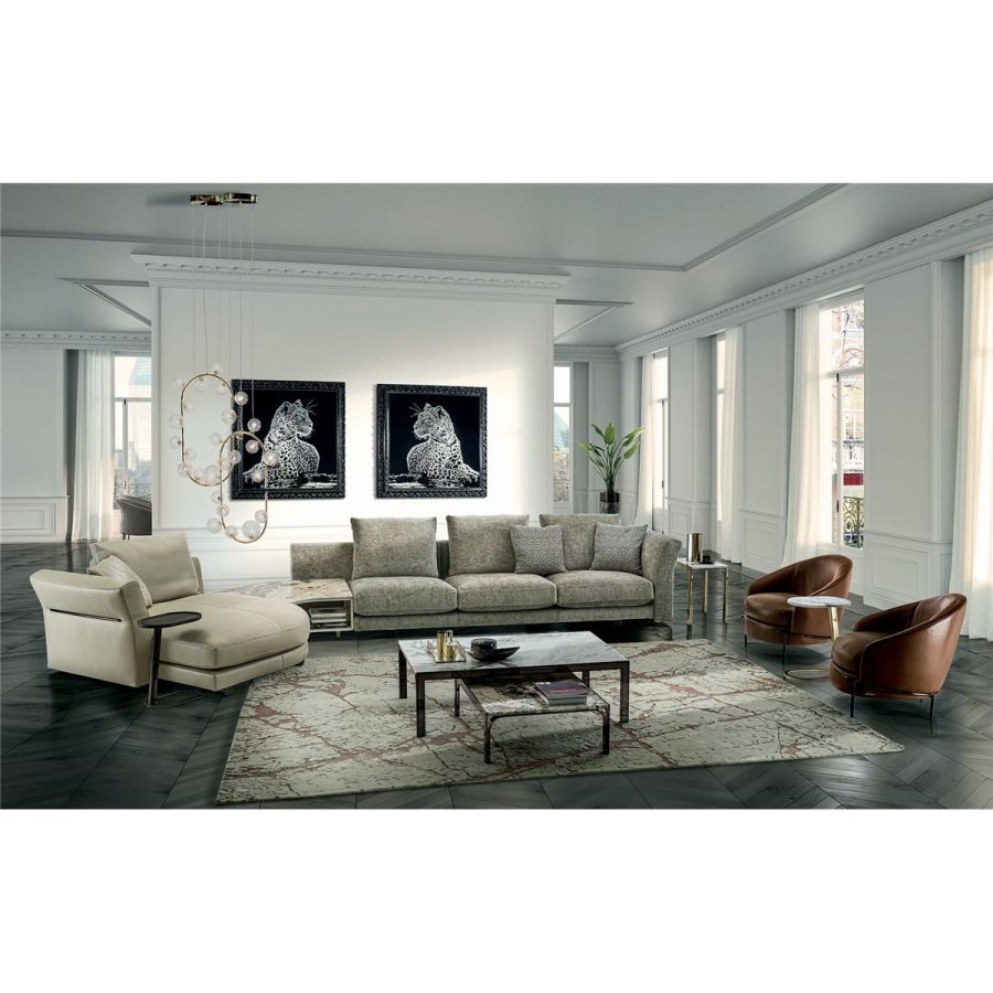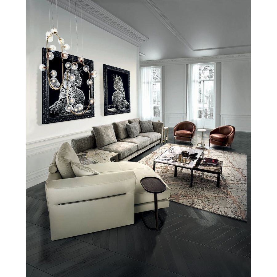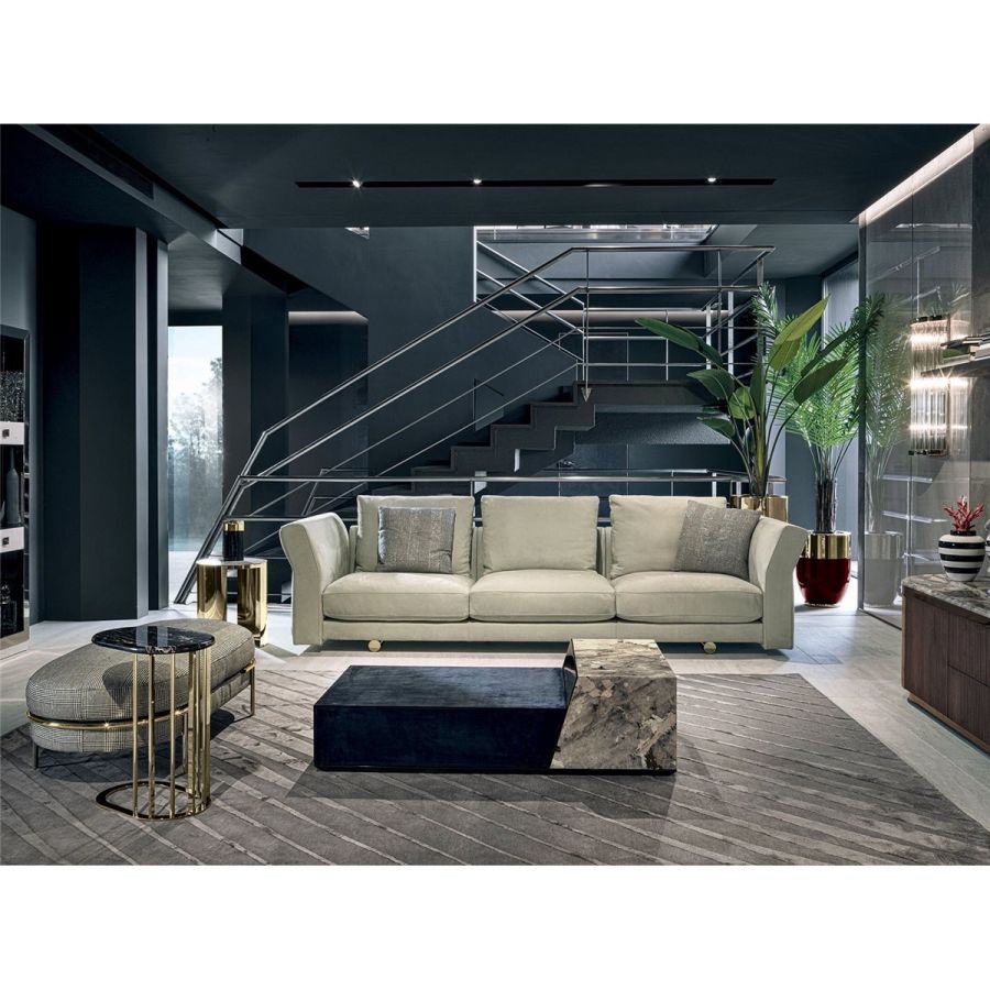 The Riverside collection contains classic linear elements and was designed to create flexible modern modular compositions that can cover every requirement of any given space. A range of dedicated complements and the option of matching different materials with a flexible selection in the measurements required complete this collection to make sure that it resolves every design requirement. The structure is in wood with high-resistance elastic bands, covered in high density polyurethane foam. Seat cushions are in multi-density polyurethane foam interiors with a rounded outer Memory Foam layer, all encased in soft sterilized goose down. Backrest cushions are filled with sterilized goose down, supported by a roller in high density polyurethane foam. On the roller upholstered in leather, it is possible to order a “Marlène” embroidered decoration. The elegant metal profile inserted in the armrest, the feet and all the metal accessories are offered in the following finishes: Satin nickel, bright shaded brown, Black Rose gold, bright light gold, matt Champagne gold, bright chrome, bright black chrome, matt satin bronze, bright pink gold, matt pink gold. The upholstery CANNOT be removed from the structure, but the cushion covers in leather or fabric are removable. Different types of dedicated small tables complete the collection: - small service table with “wing shaped“ shelf covered in smooth or perforated leather. They have the same strip design on the structural base, and offer a refined solution for holding objects and also for storage. - small table in boxed in onyx and or Patagonia marble backlit. - small end table round in marble or mirror from the catalogue, base in wood: glossy/matt Maple, glossy/matt heat-treated Eucalyptus, glossy/matt Sycamore frisè, glossy/matt Ebony,Canaletto walnut stained gloss/matt Macadamia and support columns Ø 14 mm in coordinated metal. - shaped small table in marble or mirror from the catalogue, base in wood: glossy/matt Maple, glossy/matt heat-treated Eucalyptus, glossy/matt Sycamore frisè, glossy/matt Ebony, Canaletto walnut stained gloss/matt Macadamia and support columns Ø 14 mm in coordinated metal.
