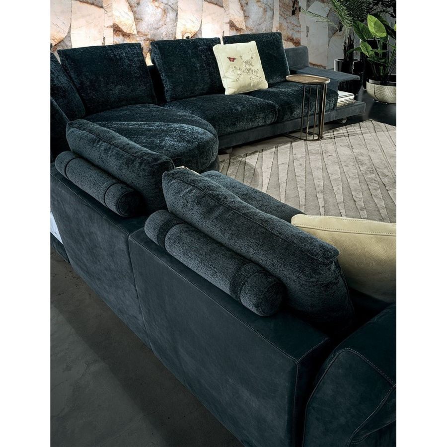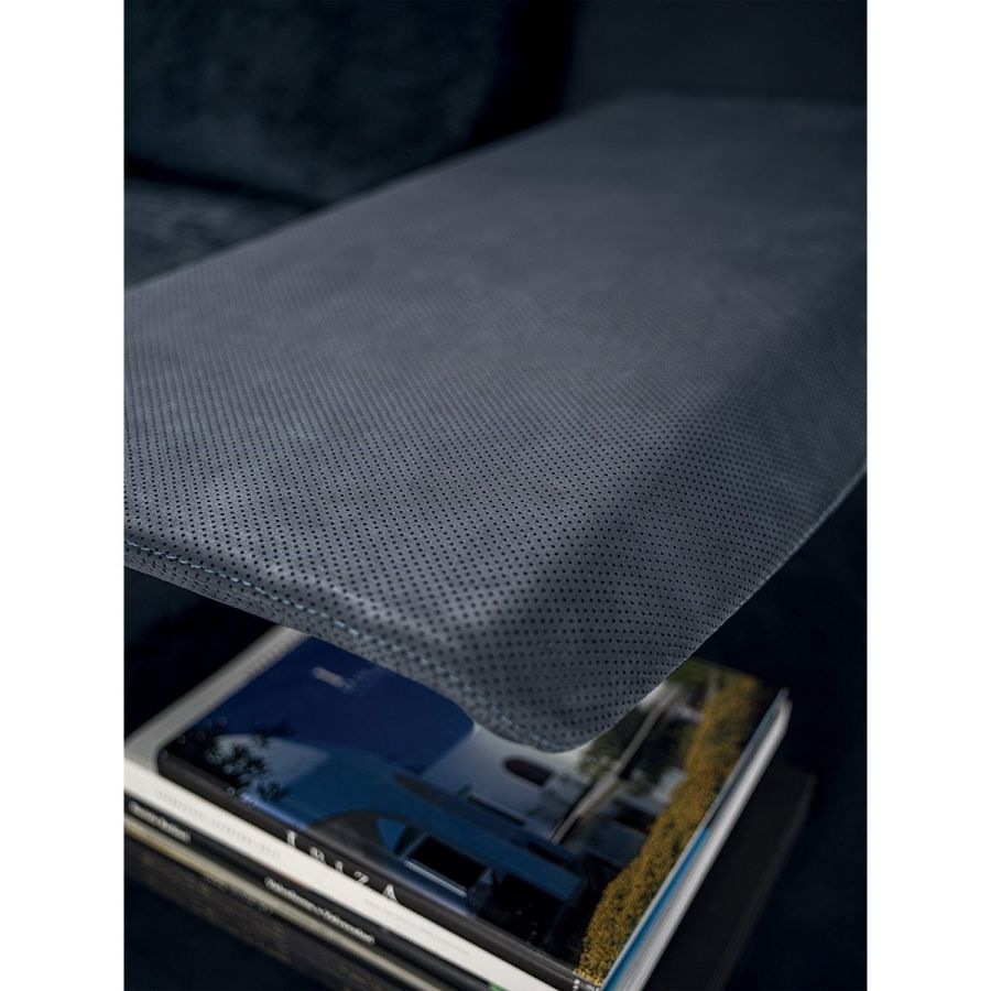 Riverside sofa, designed by Giuseppe Iasparra, features low and not excessively deep proportions and a deconstructed shape for a more relaxed, informal look, thanks to the use of large feathers cushions. Special accessories and small tables enrich the sofa with unexpected features. Riverside fits to perfection in a wide variety of contexts due to the elegance and simplicity of its lines. A metal insert embracing the armrest grants the piece a sense of sober elegance. With its high potential for aggregation, versatility and innovative design, the sofa introduces original and unexpected structural details, resulting in a dynamic and contemporary allure. The Riverside version with extended back makes it possible to insert small tables, for a variety of compositions.
